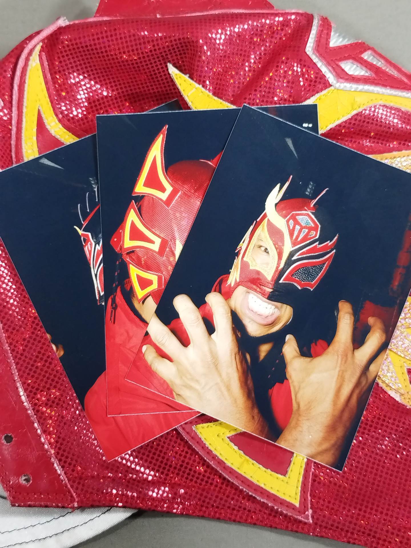 本人使用サイン入り 着用写真付 赤特殊&黒特殊ハーフレオタード2重生地 黄色地ピンク特殊フチ&銀特殊地赤フチ