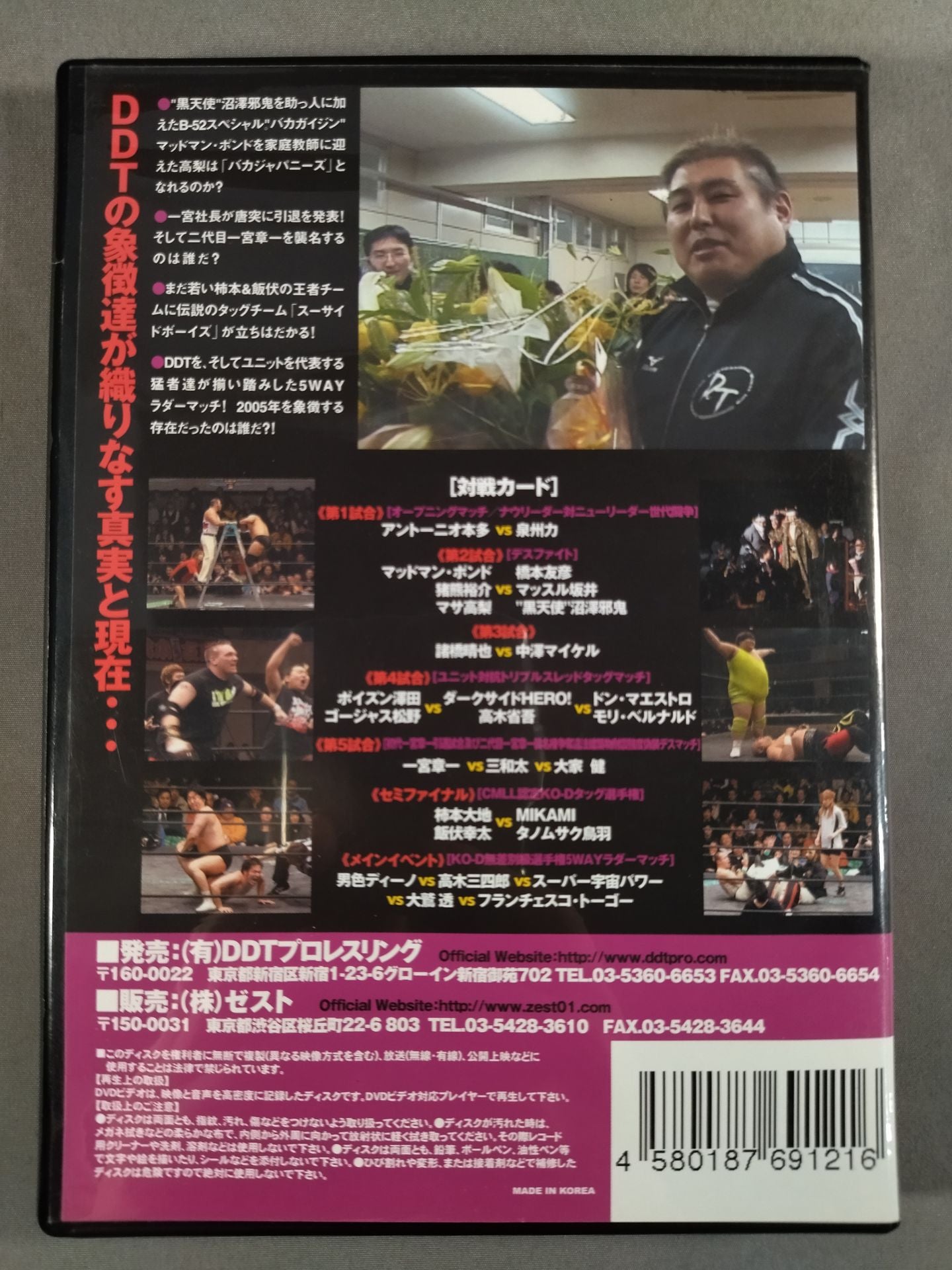 2006年 正統派からパロディありのファイトまで幅広いレスリングを繰り広げる団体“DDT”のDVD。沼澤邪鬼を助っ人に加えたB-52スペシャルや、柿本大地&飯伏幸太の若き王者チームに挑むスーサイドボーイズのバトルなど、白熱の5WAYラダーマッチを収録する。