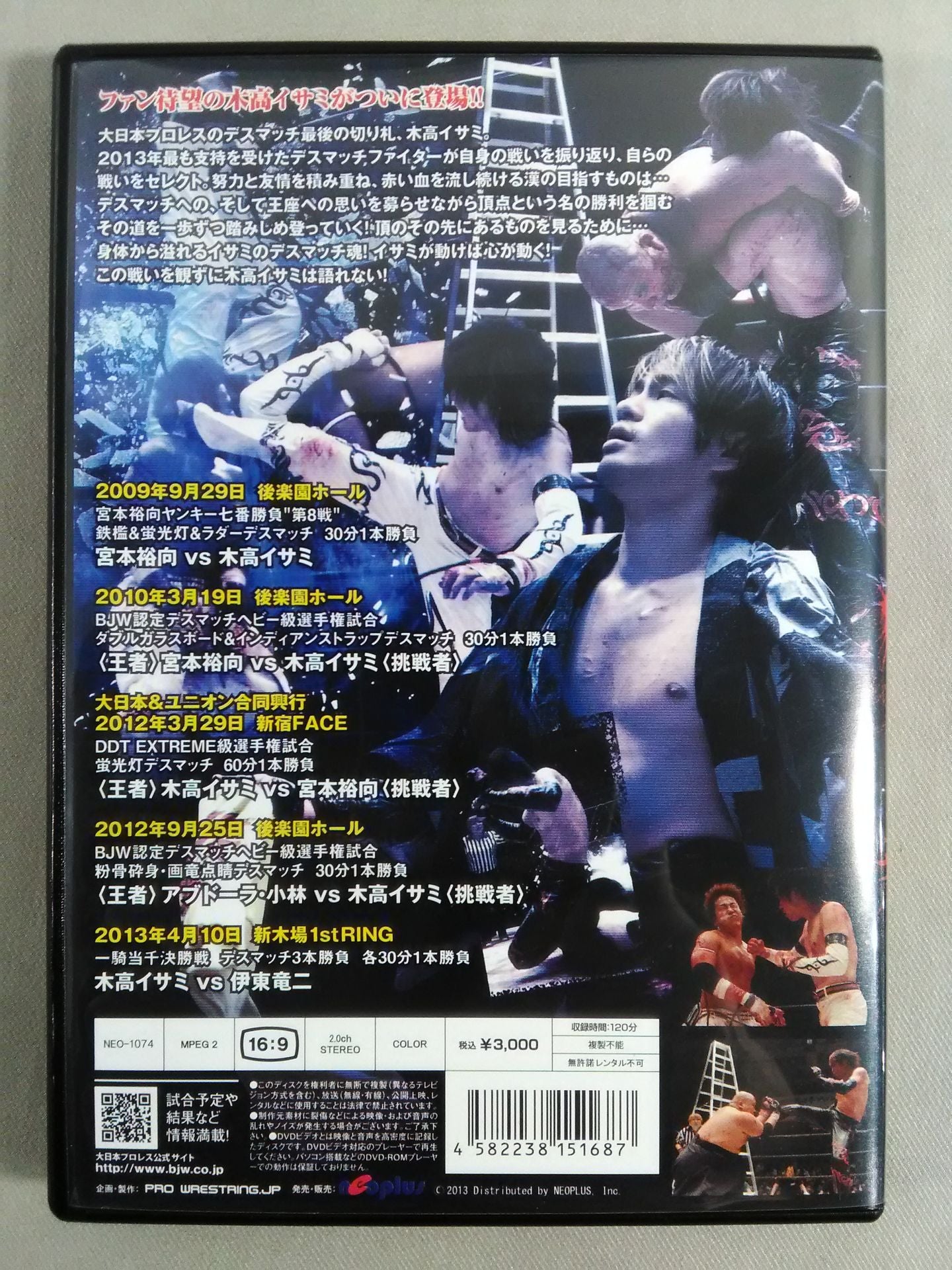 2013年 ファン待望の木高イサミがついに登場!!大日本プロレスのデスマッチ最後の切り札、木高イサミ2013年最も支持を受けたデスマッチファイターが自身の戦いを振り返り、自らの戦いをセレクト努力と友情を積み重ね、赤い血を流し続ける漢の目指すものは・・・ デスマッチへの、そして王座への思いを募らせながら頂点という名の勝利を掴むその道を一歩ずつ踏みしめ登っていく頂のその先にあるものを見るために・・・・身体から溢れるイサミのデスマッチ魂イサミが動けば心が動くこの戦いを観ずに木高イサミは語れない全5試合収録!!