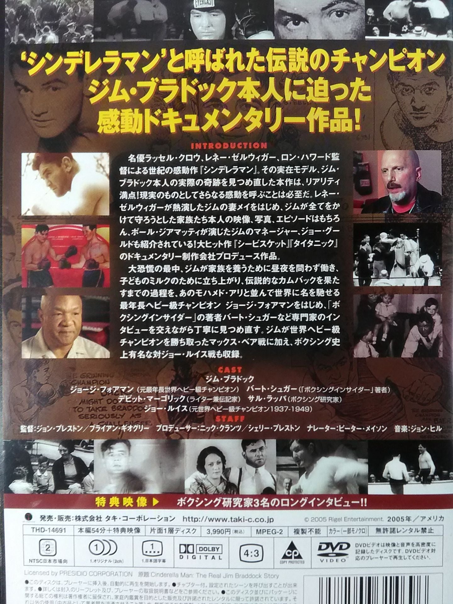 2005年 ラッセル・クロウ主演の感動作『シンデレラマン』のモデルとなった実在のボクサー、ジム・ブラドックの人生に迫ったドキュメンタリー。ジム・ブラドックの研究家たちの詳述をはじめ、世界ヘビー級王者を勝ち取った対マックス・バエアー戦などを収める。