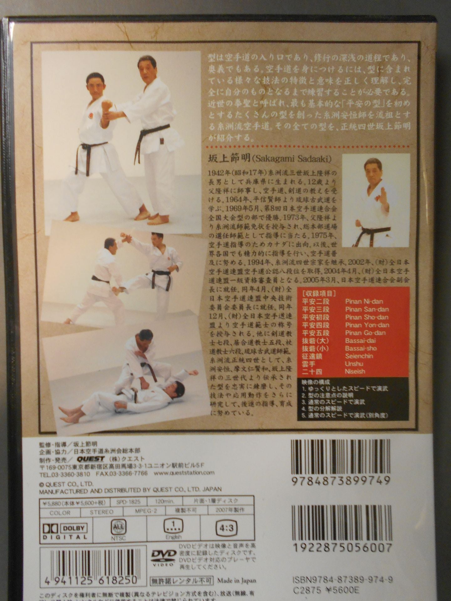 2001年 型は空手道の入り口であり、修行の深浅の道程であり、奥義でもある。空手堂を身に付けるには、型に含まれている様々な技法の特徴と意味を正しく理解し完全に自分のものとなるよう練習することが必要である。近世の拳聖と呼ばれ、最も基本的な「平安の型」を初めとする沢山の型を創った糸洲安恒師を流祖とする糸洲流空手道。その全ての型を、正統四世坂上節明が紹介する。