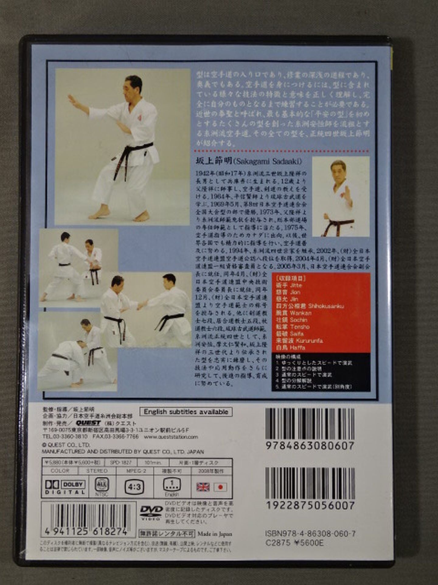 2008年 型は空手道の入り口であり、修行の深浅の道程であり、奥義でもある。空手堂を身に付けるには、型に含まれている様々な技法の特徴と意味を正しく理解し完全に自分のものとなるよう練習することが必要である。近世の拳聖と呼ばれ、最も基本的な「平安の型」を初めとする沢山の型を創った糸洲安恒師を流祖とする糸洲流空手道。その全ての型を、正統四世坂上節明が紹介する。