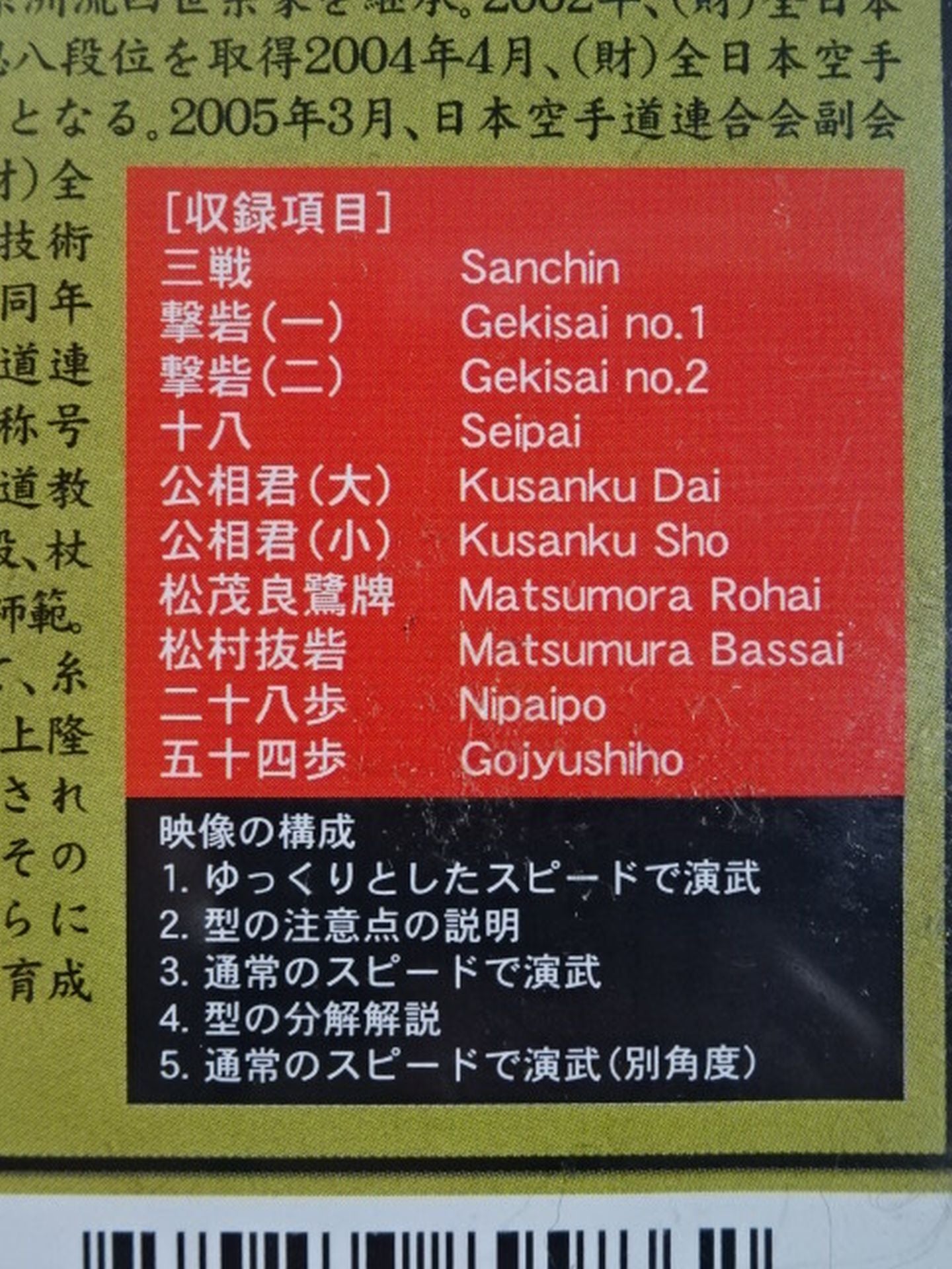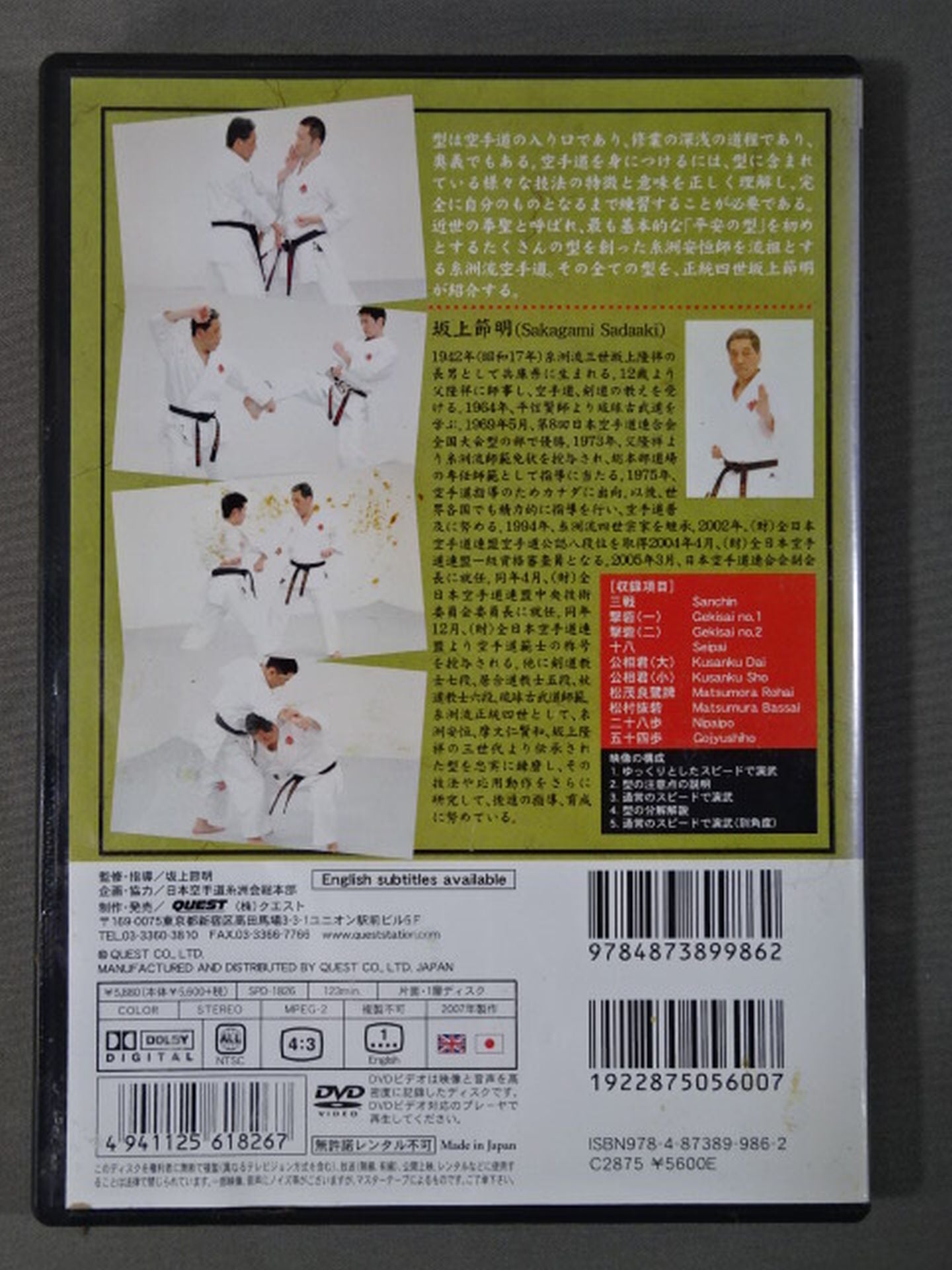 2007年 型は空手道の入り口であり、修行の深浅の道程であり、奥義でもある。空手堂を身に付けるには、型に含まれている様々な技法の特徴と意味を正しく理解し完全に自分のものとなるよう練習することが必要である。近世の拳聖と呼ばれ、最も基本的な「平安の型」を初めとする沢山の型を創った糸洲安恒師を流祖とする糸洲流空手道。その全ての型を、正統四世坂上節明が紹介する。
