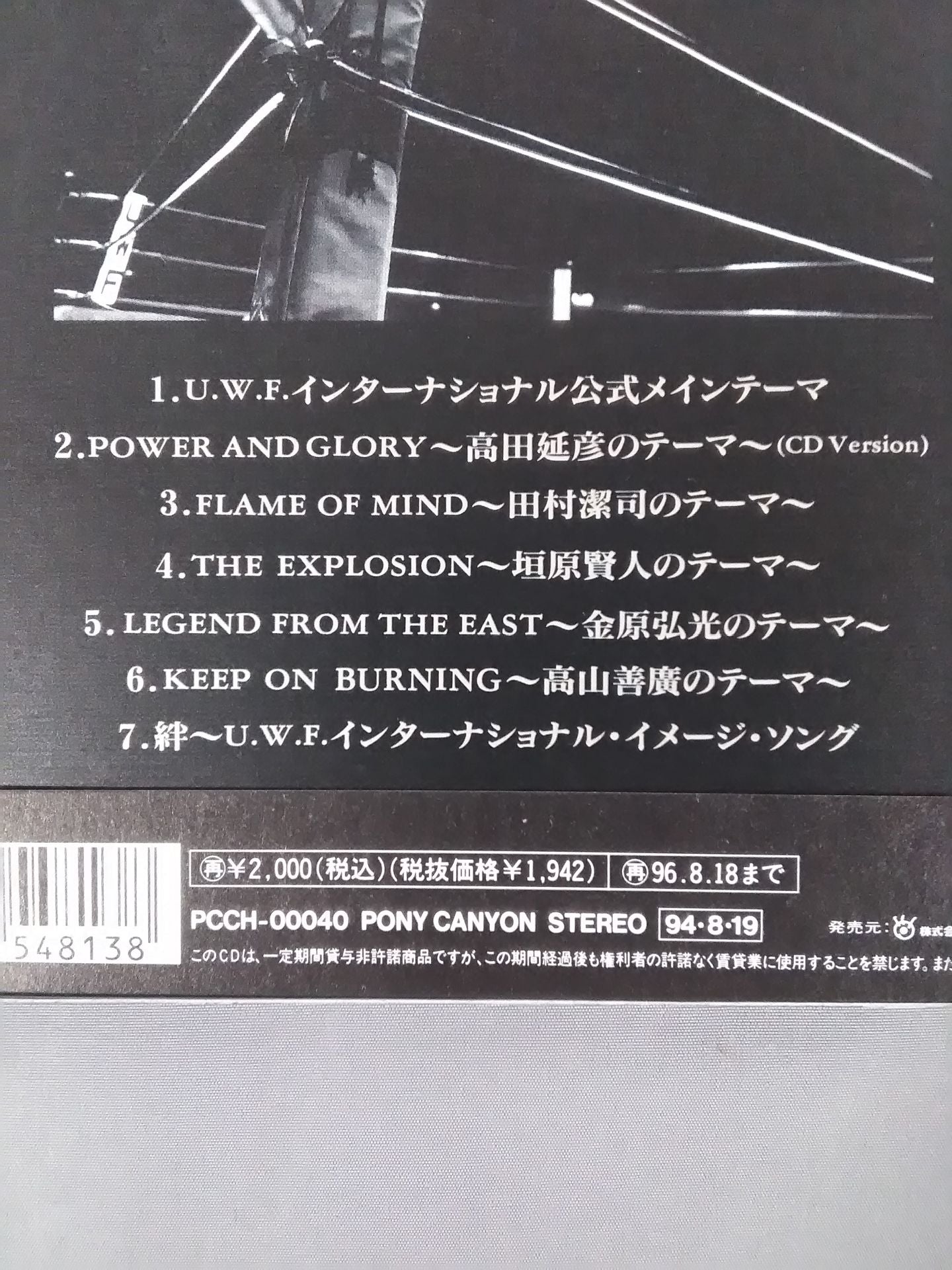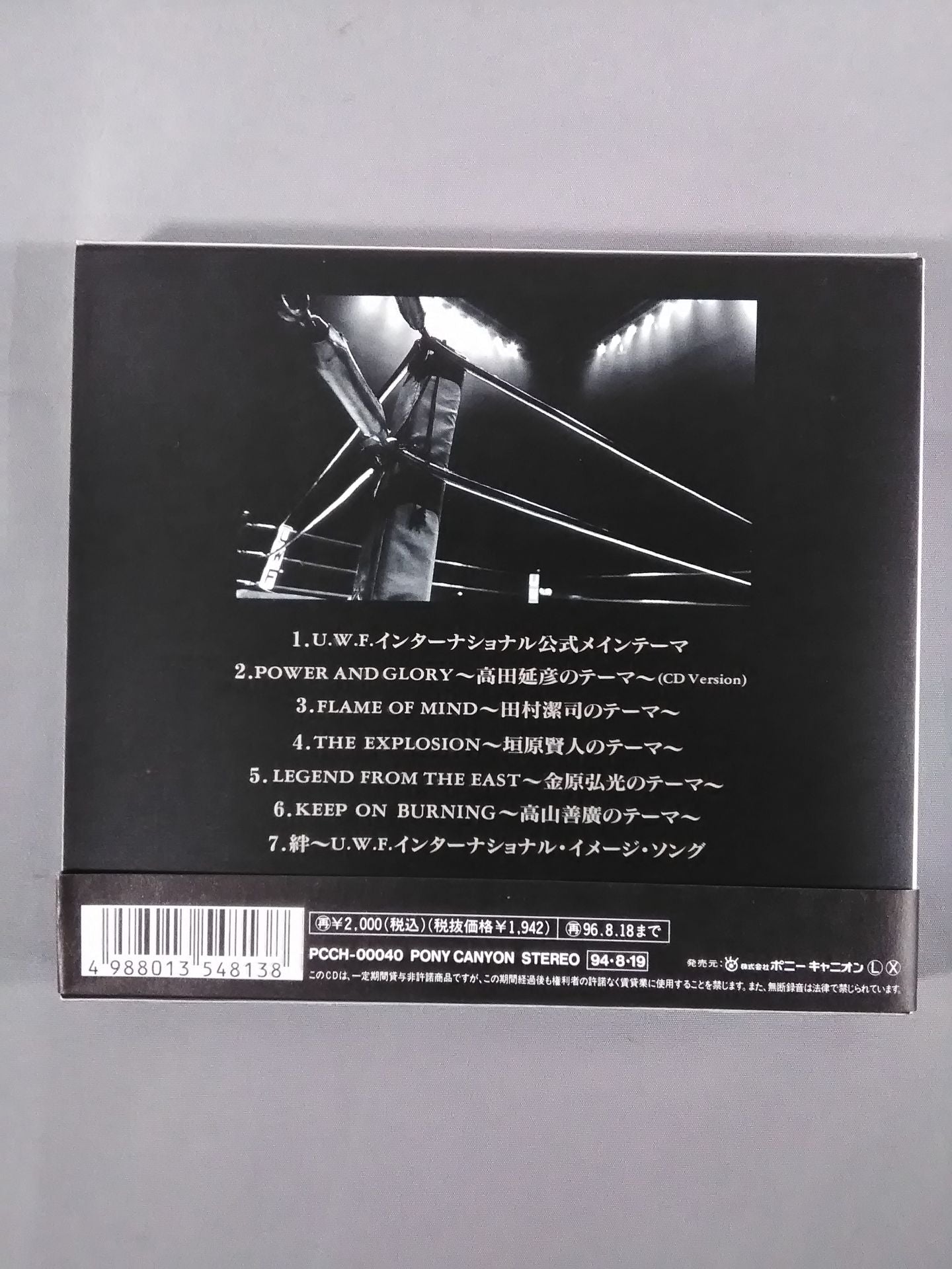 1.U.W.F.インターナショナル公式メインテーマ2.POWER AND GLORY~高田延彦のテーマ~(CD Version)3.FLAME OF MIND~田村潔司のテーマ~4.THE EXPLOSION~垣原賢人のテーマ~5.LEGEND FROM THE EAST~金原弘光のテーマ~6.KEEP ON BURNING~高山善廣のテーマ~7.絆~U.W.F.インターナショナル・イメージ・ソング