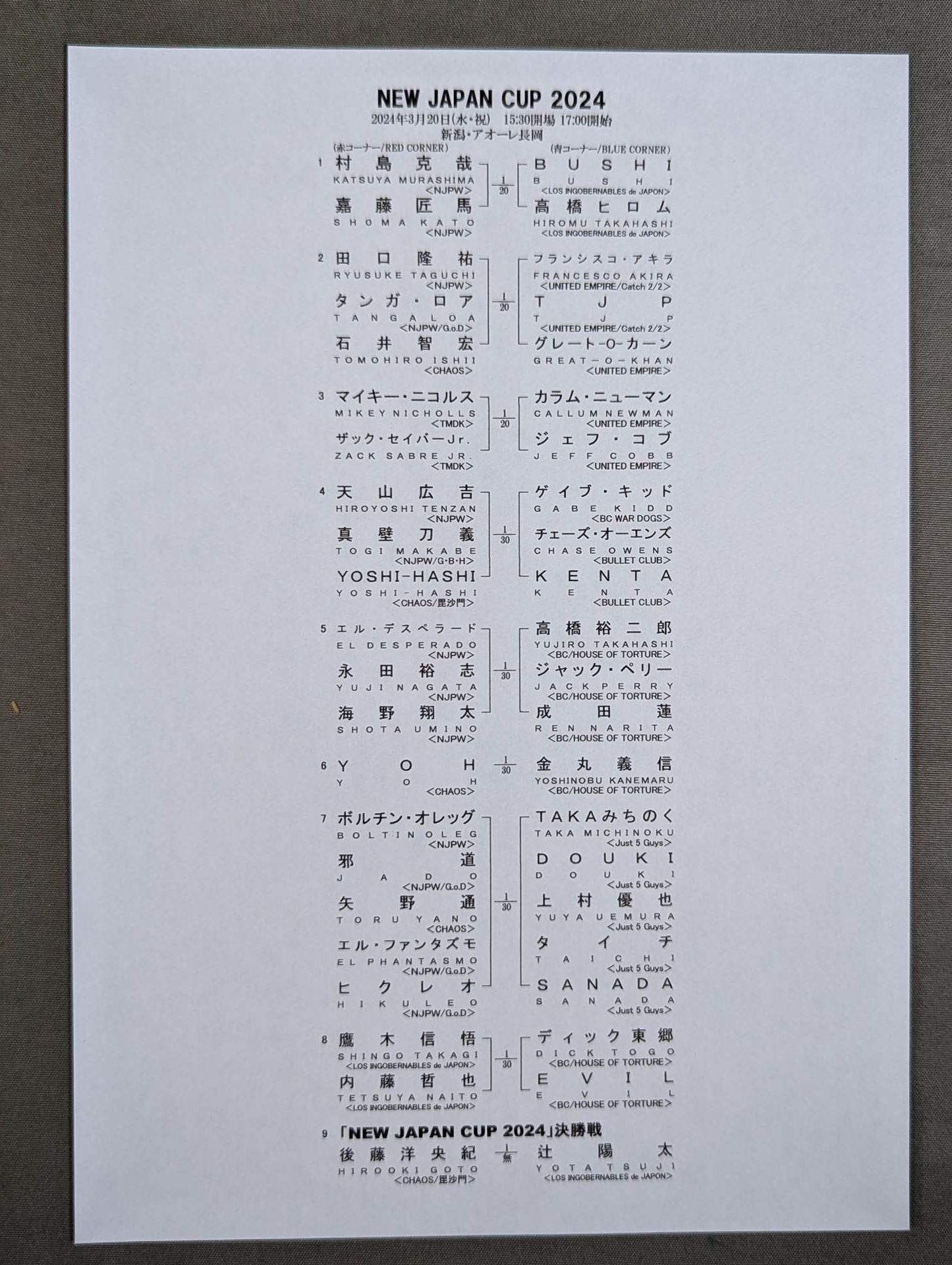 会場:新潟・アオーレ長岡 / 別紙対戦カードあり:【決勝戦】後藤洋央紀vs辻陽太 ※辻が初優勝・プロレス大賞 年間最高試合賞受賞 / ROAD TO THE NEW BEGINNING 2024