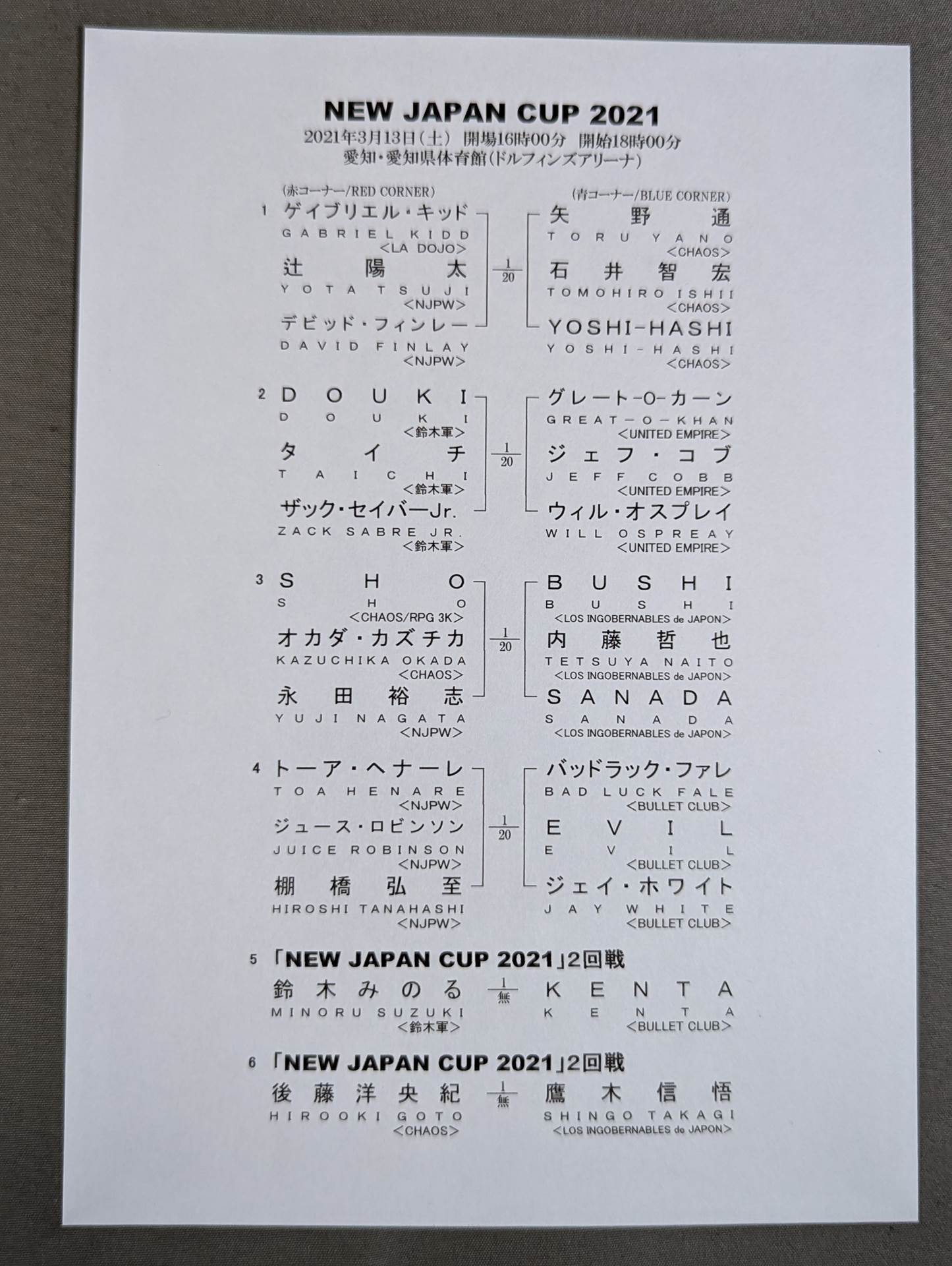 会場:愛知県体育館(ドルフィンズアリーナ) / 別紙対戦カードあり:【2回戦】後藤洋央紀vs鷹木信悟 / 【2回戦】鈴木みのるvsKENTA / NEW JAPAN CUP 2021 ニュージャパンカップ2021