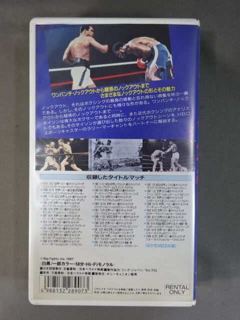 ○白黒/一部カラー ワンパンチ・ノックアウトから疑惑のノックアウトまでさまざまなノックアウトの形と魅力!! ○主な収録内容;シュガー・レイ・レナードvsロベルト・デュラン/カシアス・クレイvsソニー・リストン/ジャック・デンプシーvsジェス・ウィラード/ジョー・フレージャーvsモハメド・アリ/マービン・ハグラーvsトーマス・ハーンズ/ジーン・フルマーvsシュガー・レイ・ロビンソン/ロッキー・マルシアノvsジョー・ウォルコット戦など