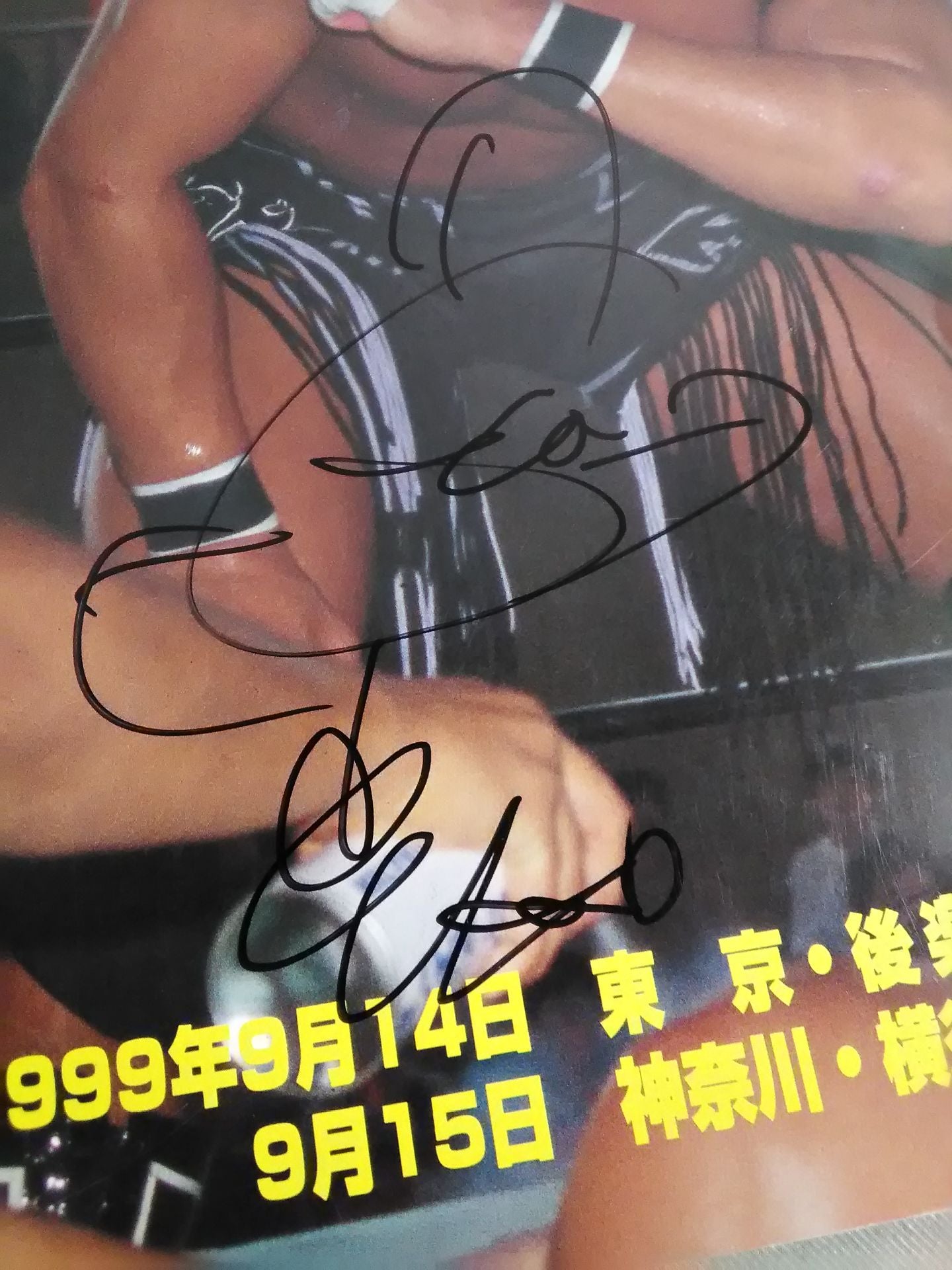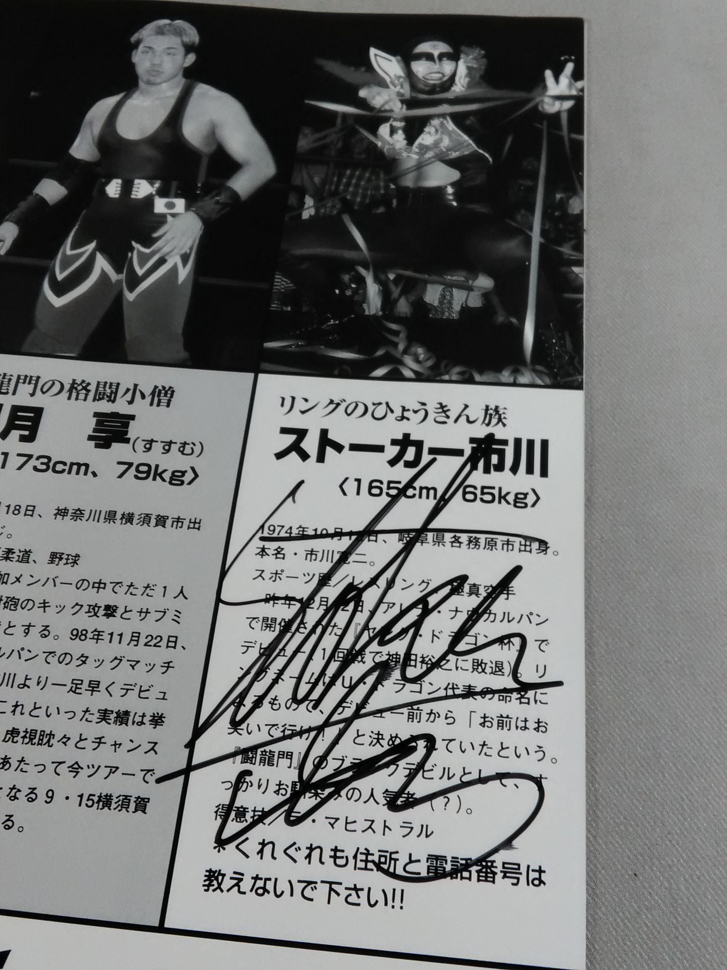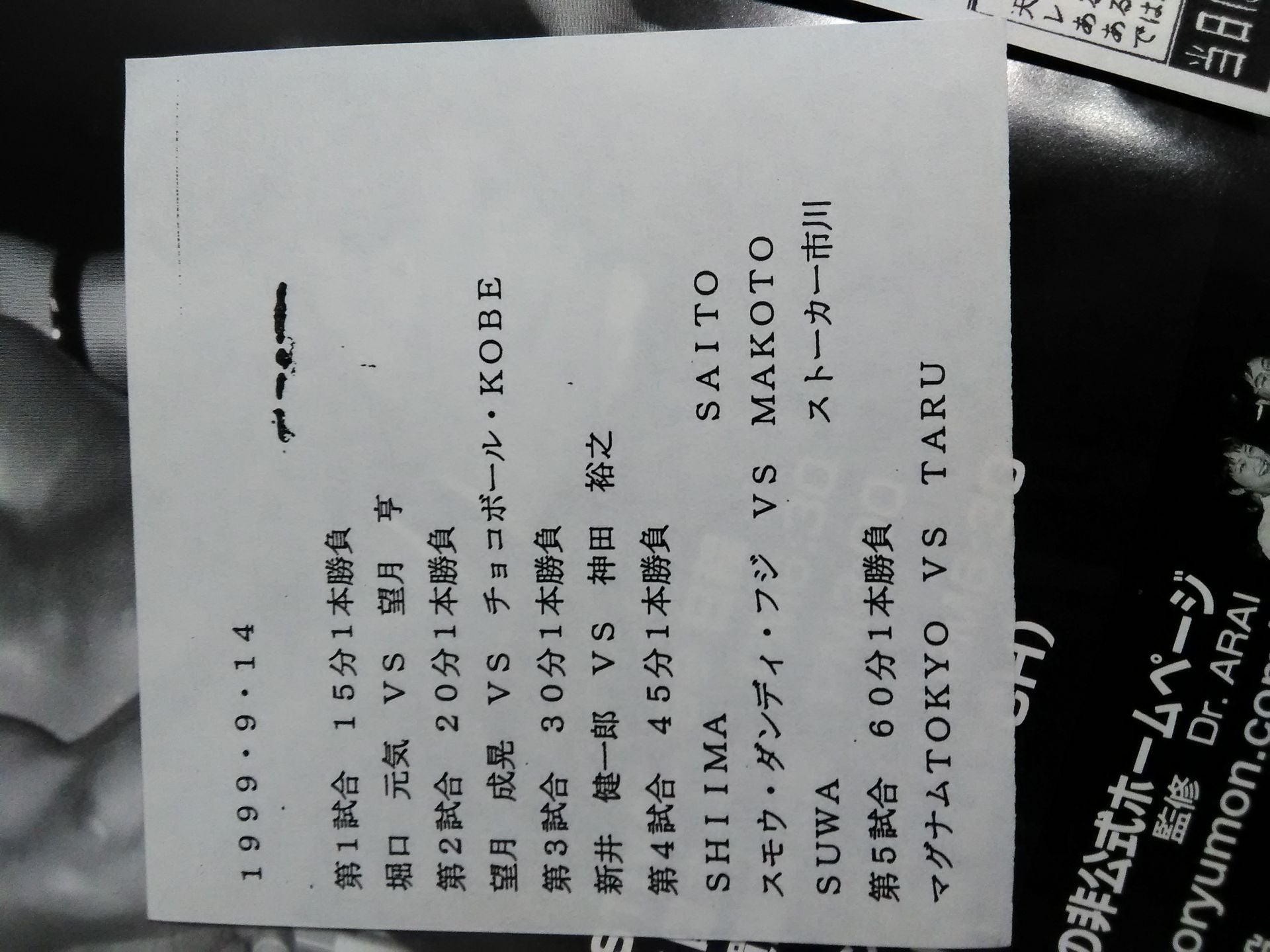 1999年 SHIIMA、岡村隆史、スモウ”ダンディ”フジ、ストーカー市川、ドラゴン・キッド 以上5選手の直筆サイン入り! / 会場;後楽園ホール / 別紙対戦カード:マグナムTOKYOvsTARU