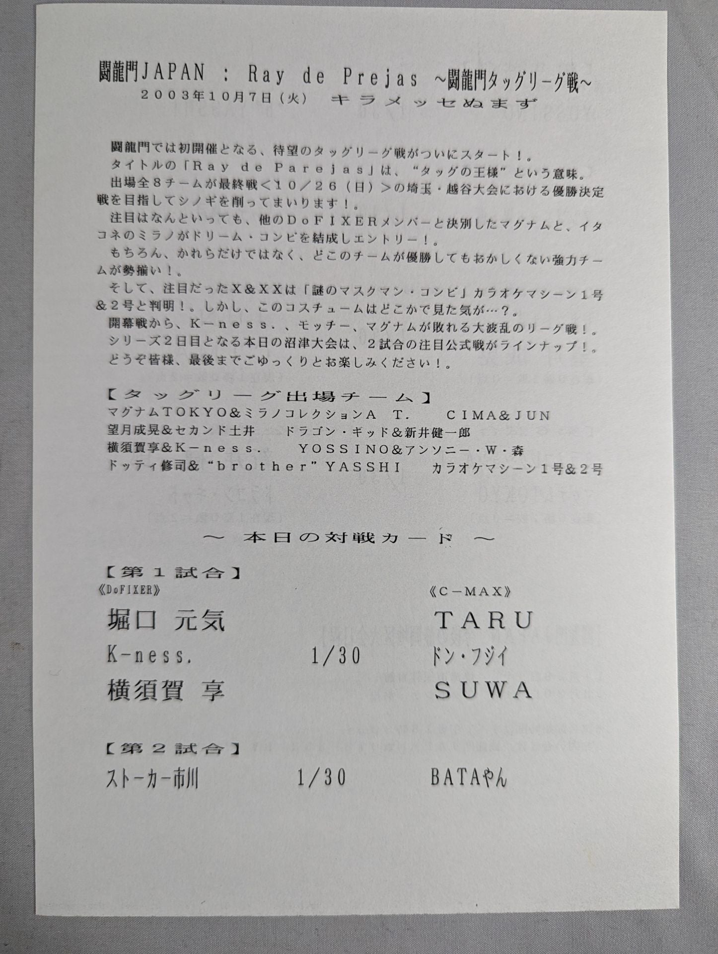 2003年 会場:静岡・キラメッセぬまづ / 別紙対戦カードあり:【公式戦】マグナムTOKYO&ミラノコレクションA.T.vsドラゴン・キッド&新井健一郎 Rey de Parejas / TORYUMON / 闘龍門ジャパン