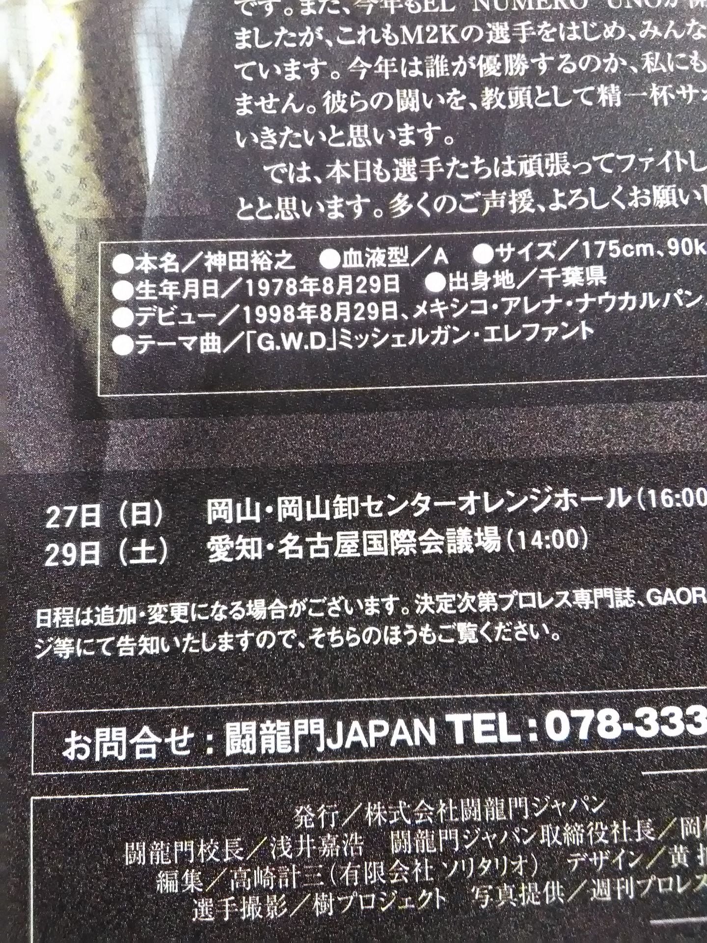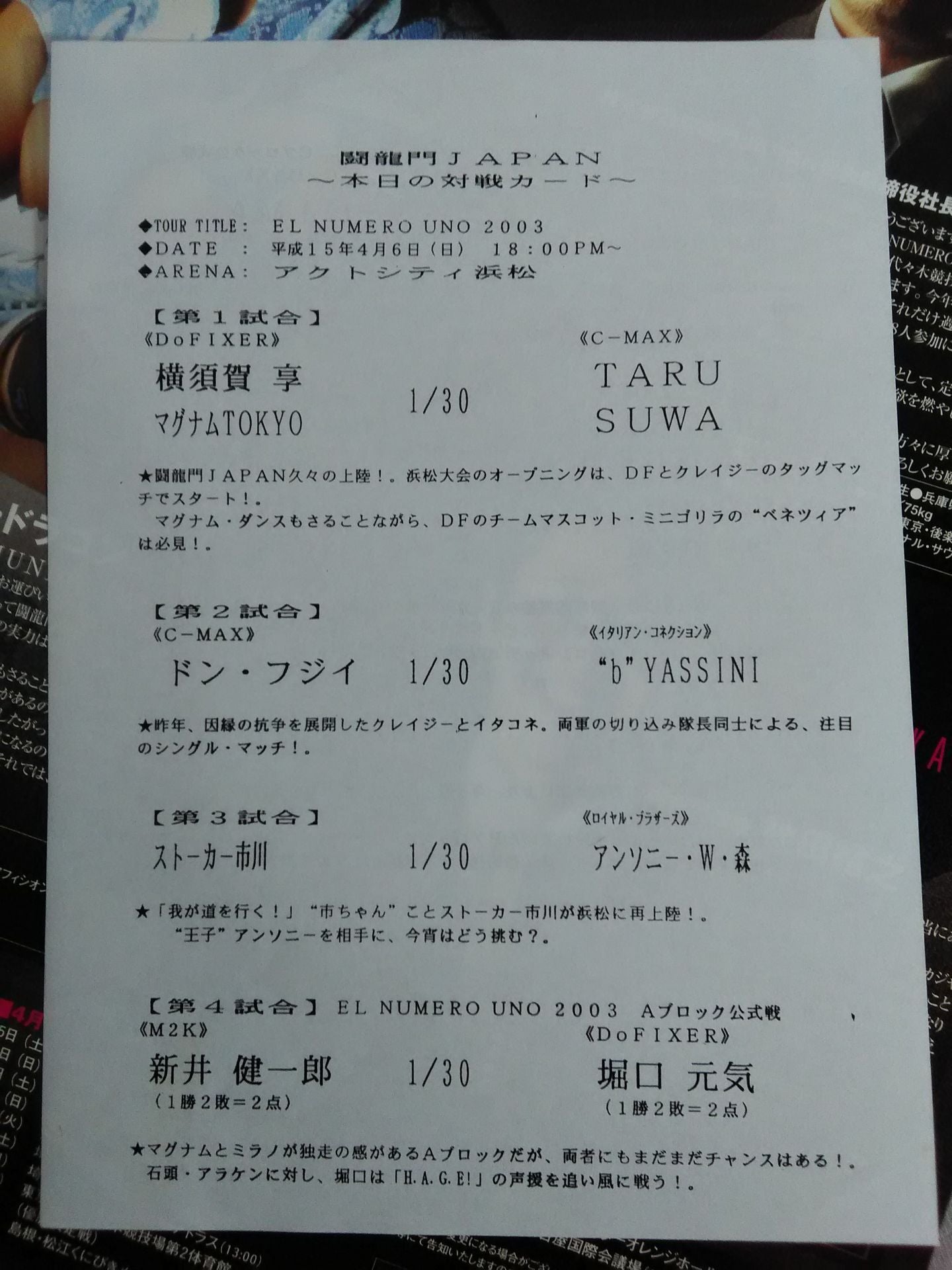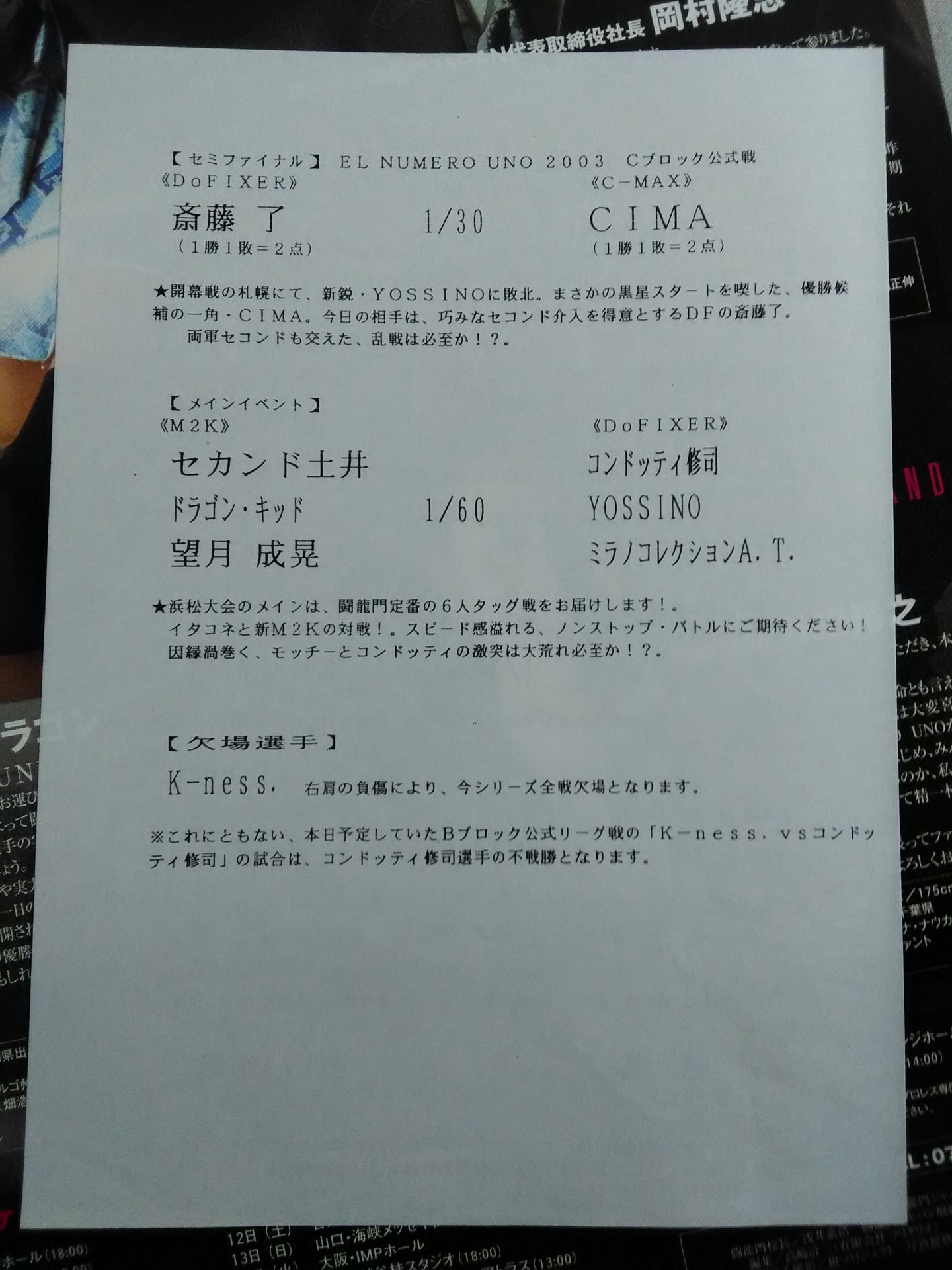 2003年 会場:静岡・アクトシティ浜松 / 別紙対戦カードあり:セカンド土井&ドラゴン・キッド&望月成晃vsコンドッティ修司&YOSSINO&ミラノコレクションA.T. EL NUMERO UNO 2003 / TORYUMON / 闘龍門ジャパン