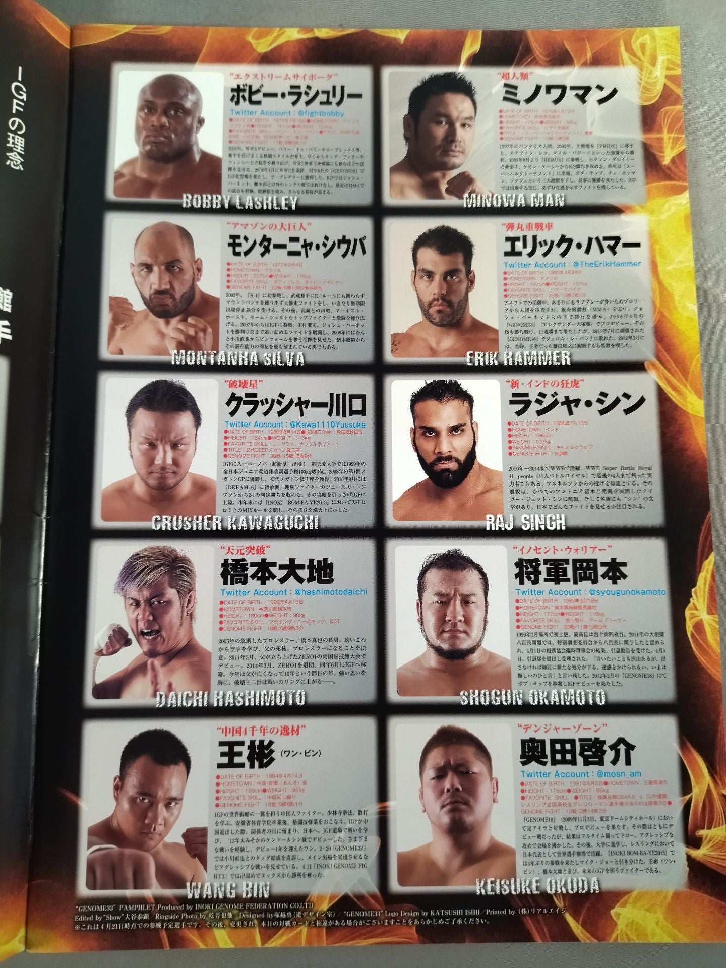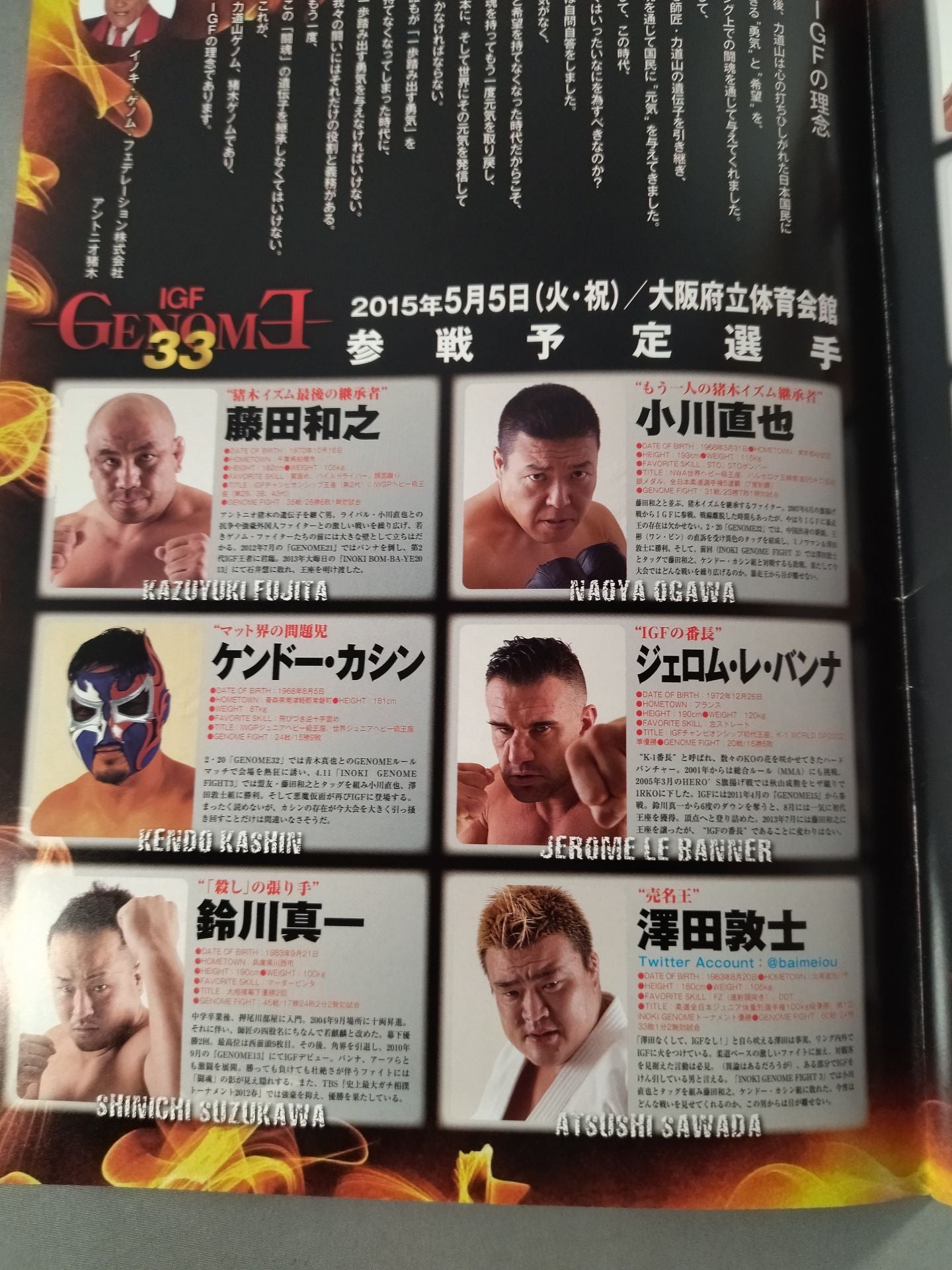 2015年 会場:大阪府立体育会館 / 対戦カードの表記なし:【GENOME-1 2015トーナメント大阪王者決定戦】澤田敦士vsミノワマン アントニオ猪木インタビュー掲載