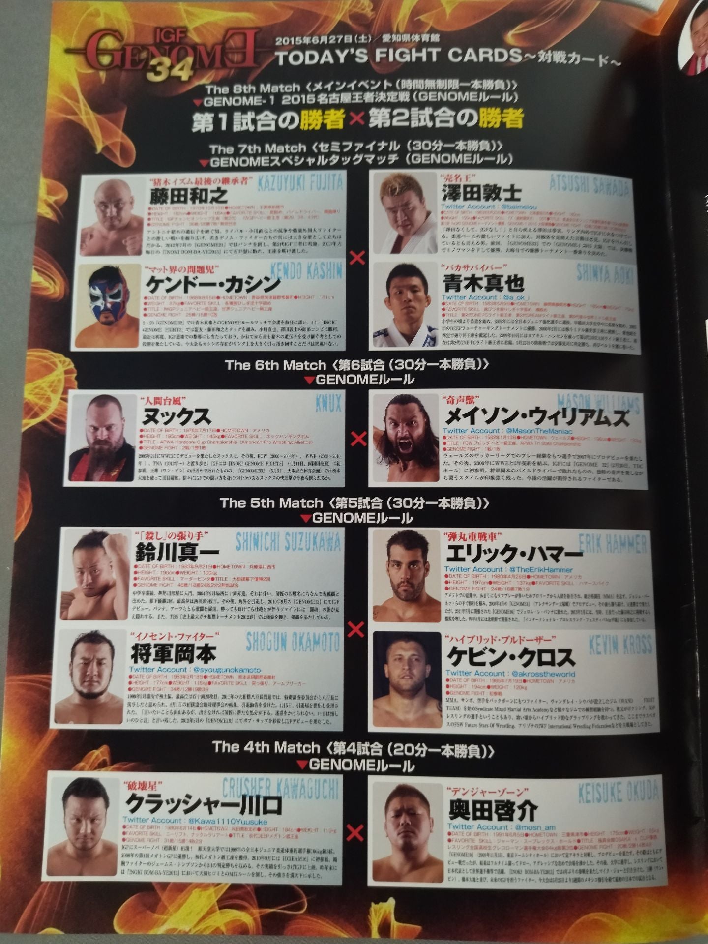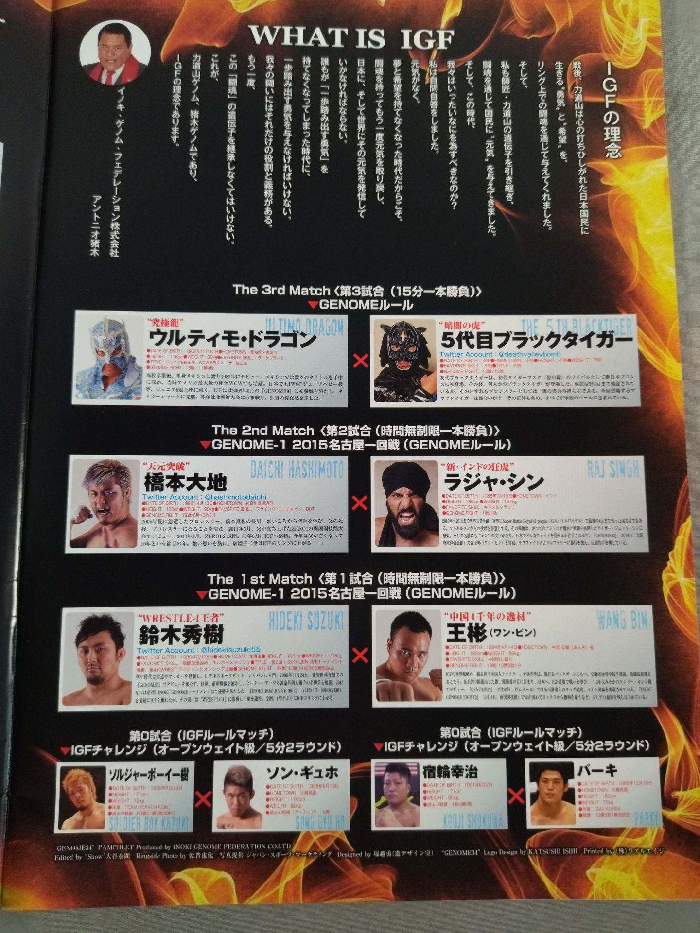 2015年 会場:愛知県体育館 / 印刷対戦カード:【GENOME-1 2015 名古屋王者決定戦】第1試合の勝者(鈴木秀樹)vs第2試合の勝者(橋本大地) アントニオ猪木インタビュー掲載
