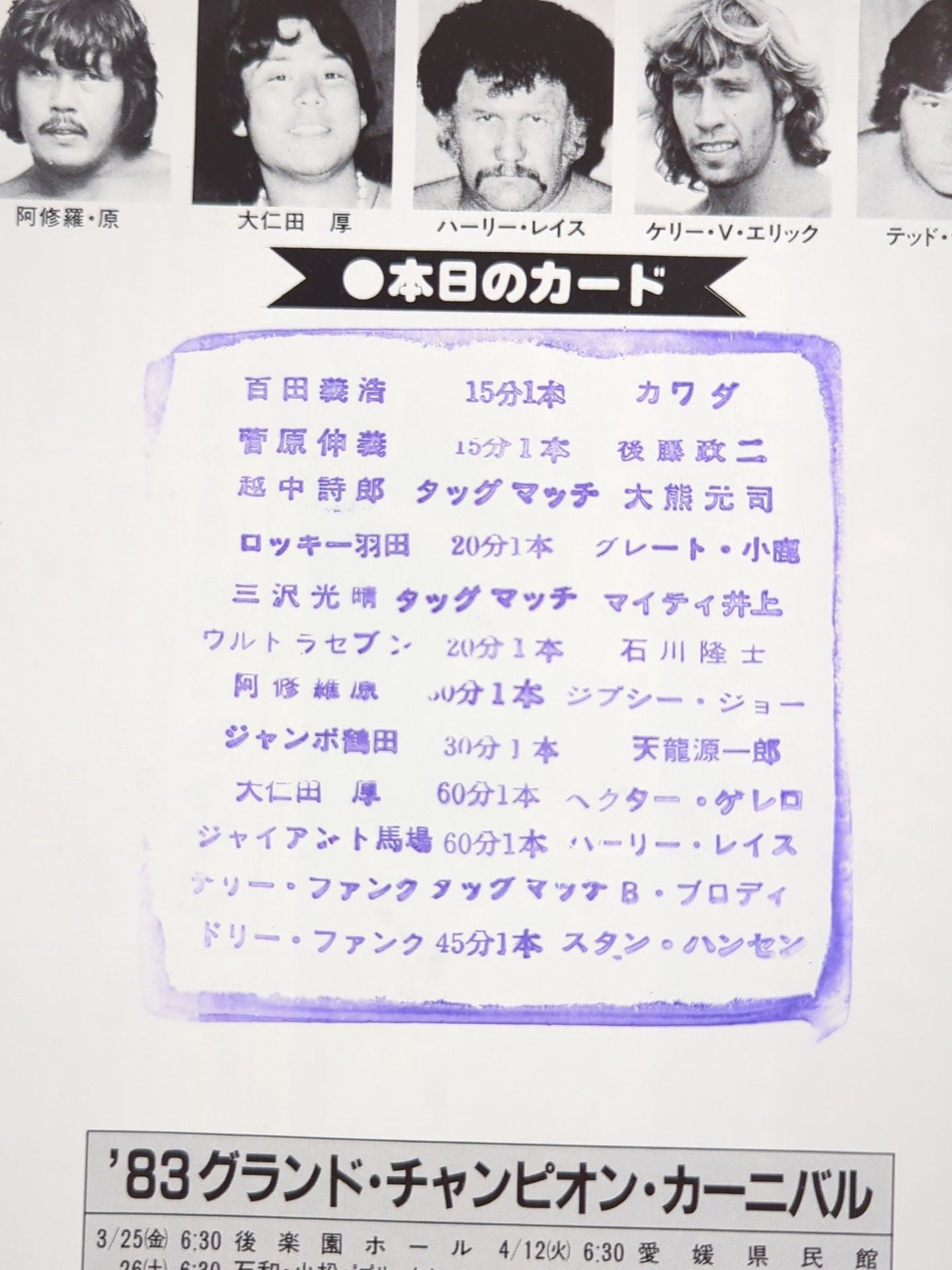 1983年 会場:東京体育館 / スタンプあり:【世界最強タッグリーグ戦リマッチ1回戦】ドリー・ファンク・ジュニア&テリー・ファンクvsスタン・ハンセン&ブルーザー・ブロディ/【PWFヘビー級選手権試合】ジャイアント馬場vsハーリー・レイス