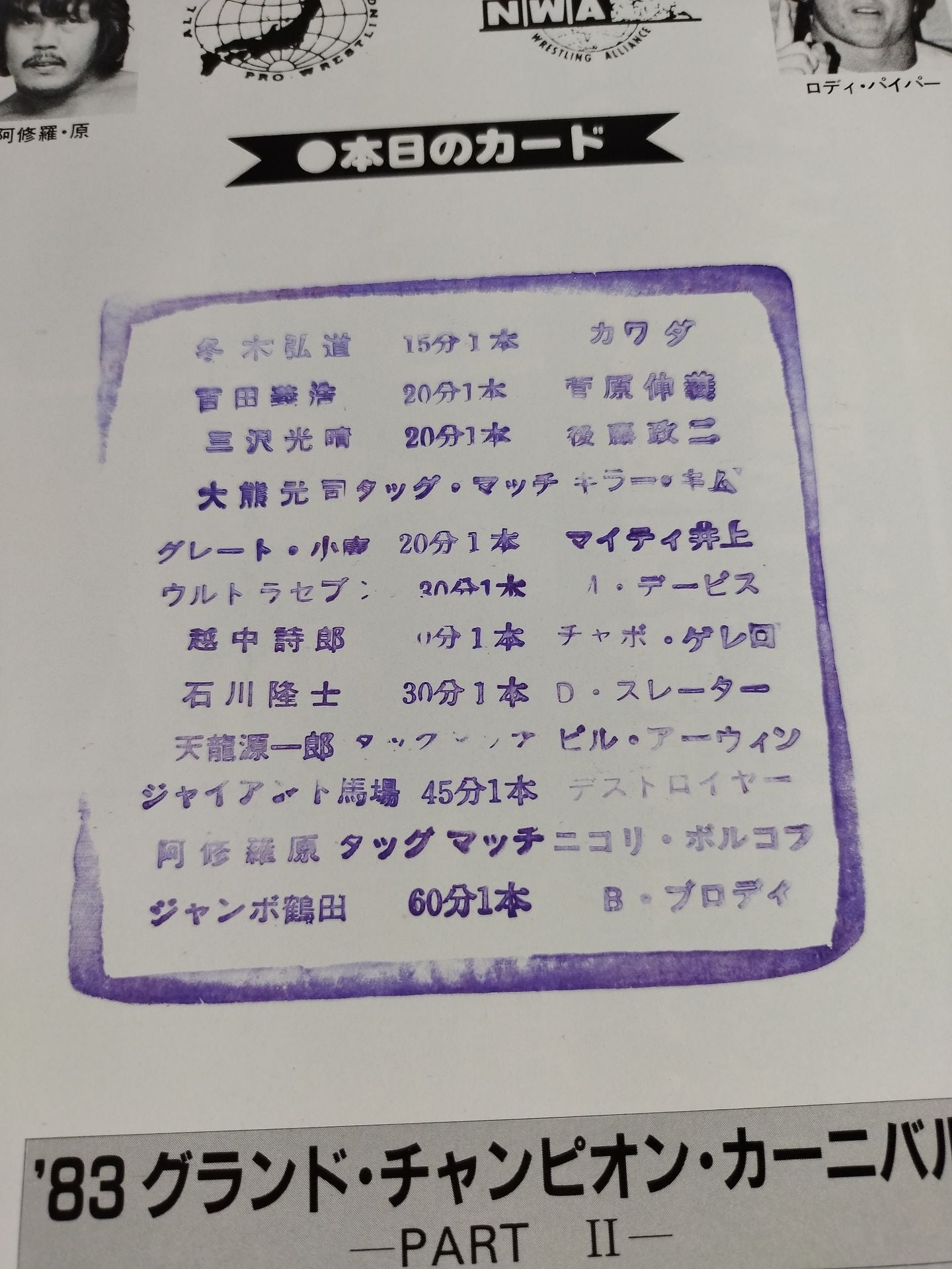 1983年 会場:後楽園ホール(開幕戦) / スタンプあり:ジャンボ鶴田&阿修羅・原vsブルーザー・ブロディ&ニコリ・ボルコフ / ジャイアント馬場&天龍源一郎vsザ・デストロイヤー&ビル・アーウィン
