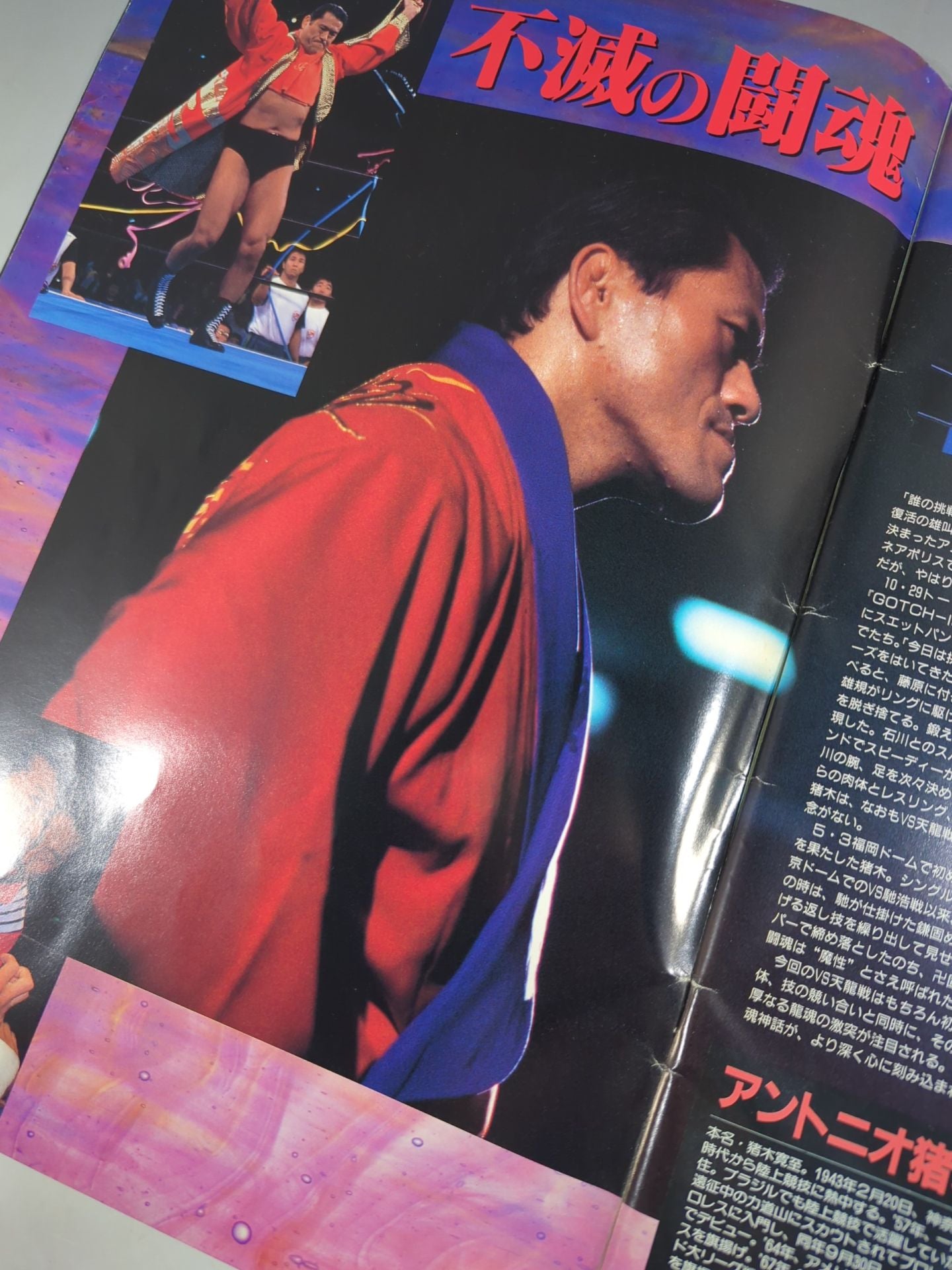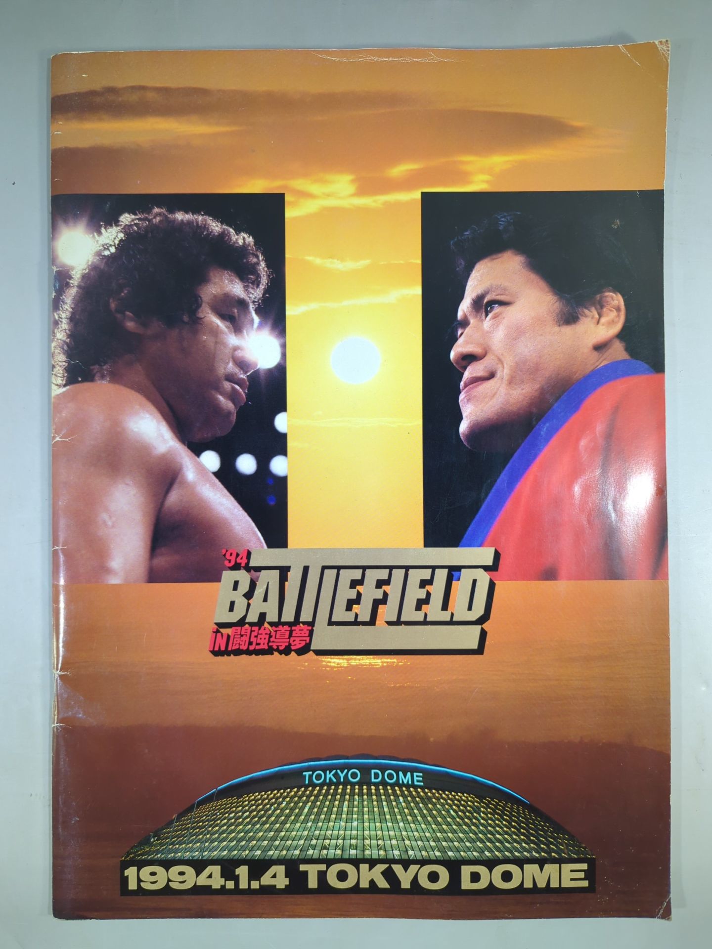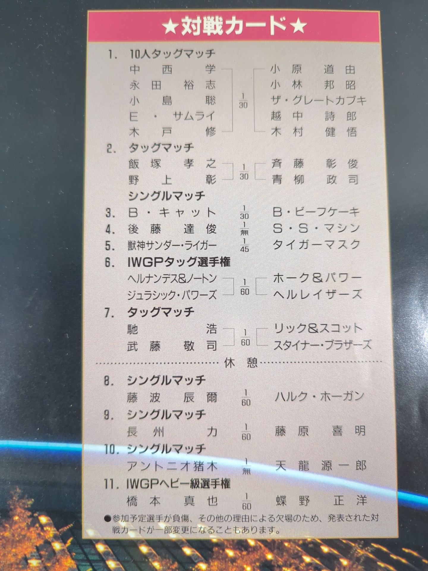 1994年 会場:東京ドーム / 印刷対戦カード:アントニオ猪木vs天龍源一郎 /【IWGPヘビー級選手権試合】橋本真也vs蝶野正洋 / 藤波辰爾vsハルク・ホーガン /【スタイナースクリュードライバー(SSD)初披露】馳浩&武藤敬司vsスタイナー・ブラザース