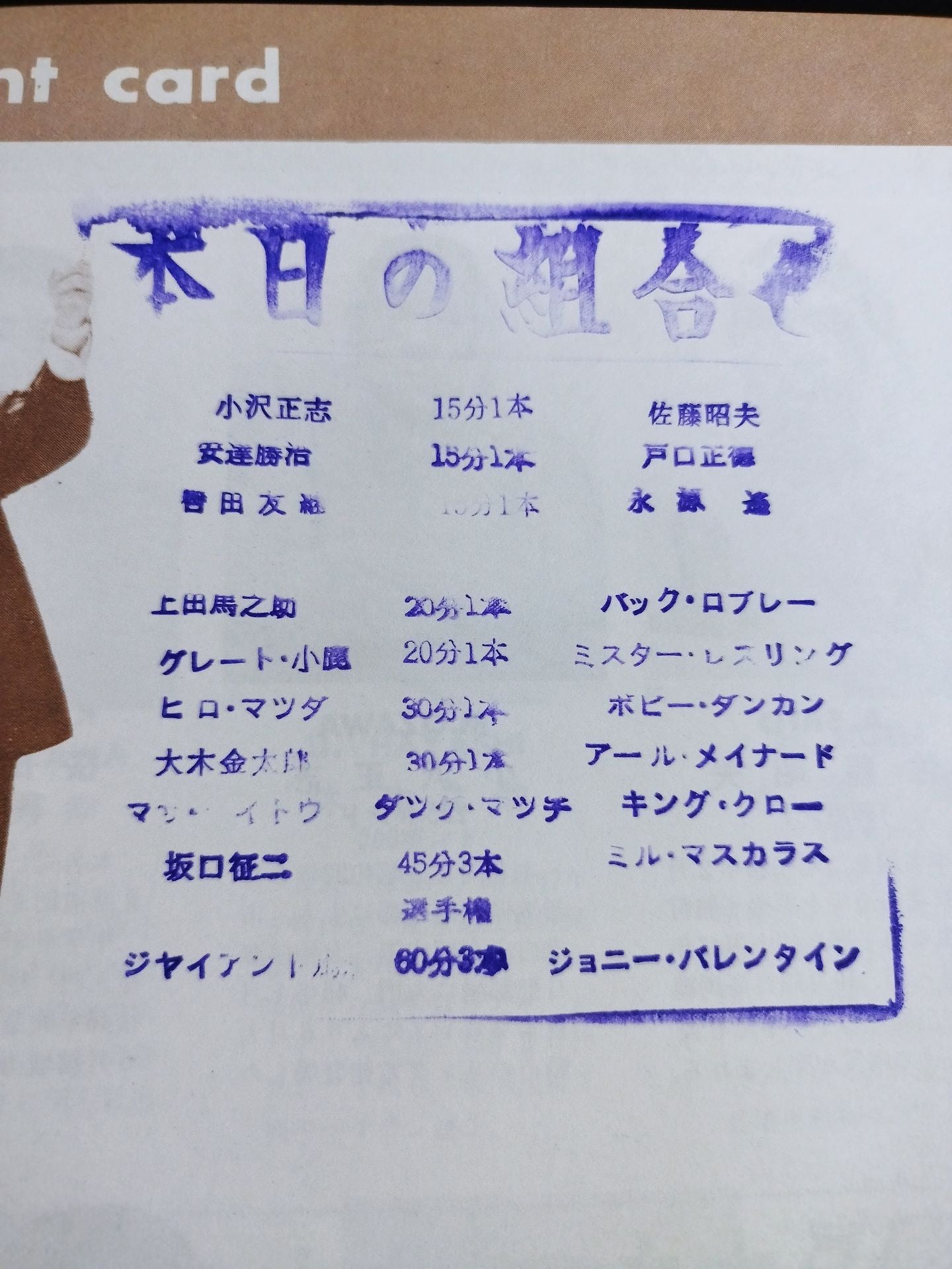 1972年 会場:大阪府立体育館 / スタンプあり:【インターナショナル選手権】ジャイアント馬場vsジョニー・バレンタイン / 坂口征二&マサ斎藤vsミル・マスカラス&キング・クロー