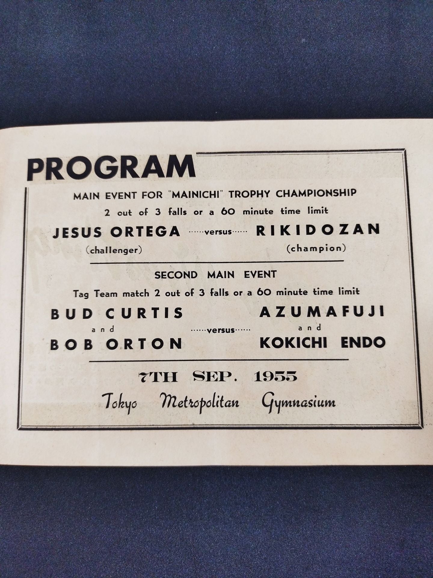 1955年 中南米タッグ選手権保持者として、ジェス・オルテガとバッド・カーティスそして、ランディ・オートンの祖父ボブ・オートンが初来日!別紙対戦カードあり:力道山vsジェス・オルテガ / 東富士&遠藤幸吉vsバット・カーディス&ボブ・オートン / □付録:◯力道山ブロマイド(印刷サイン) / B4サイズ