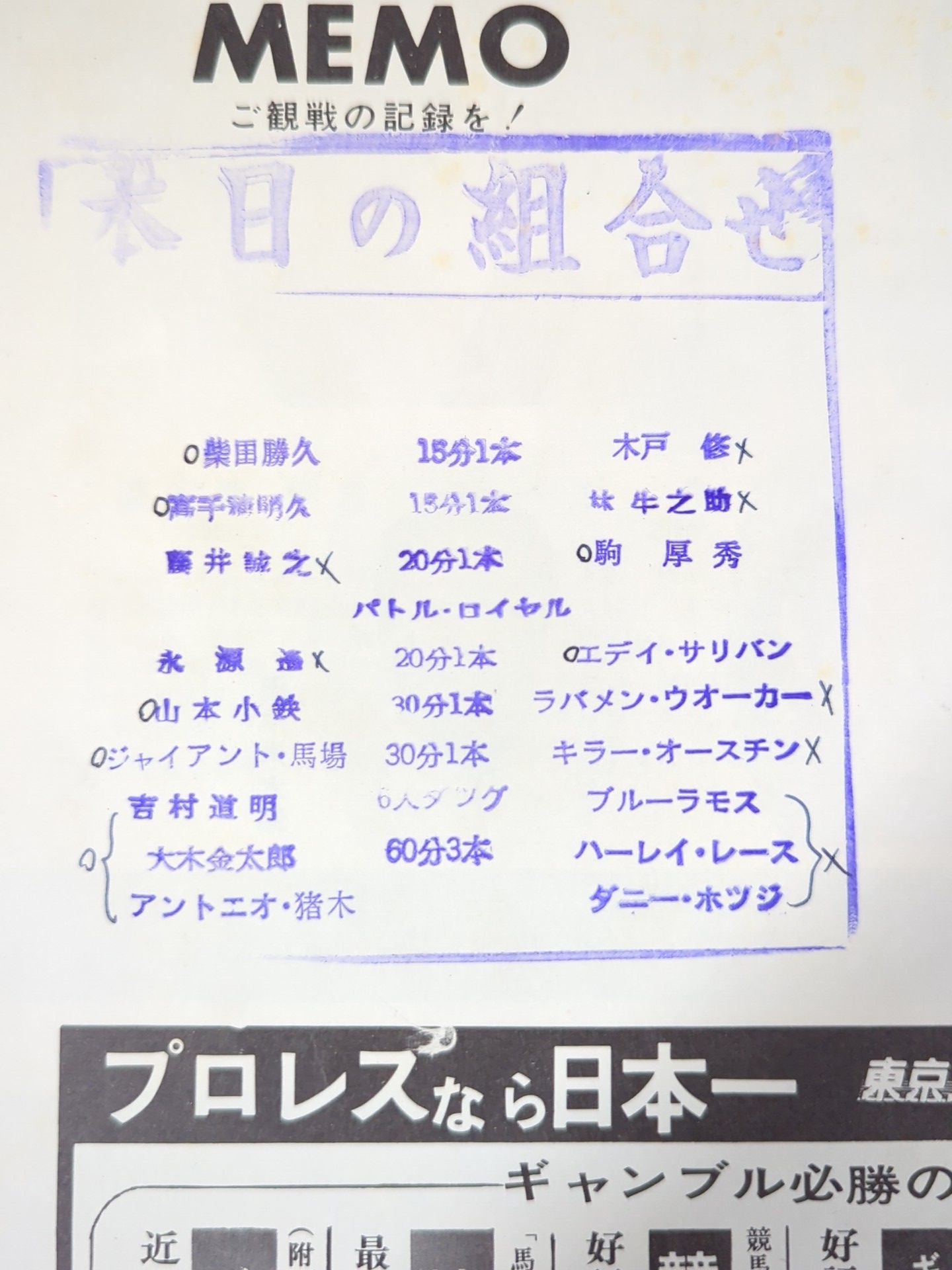 1969年 NWA世界ヘビー級王者ドリー・ファンク・ジュニアが、父ドリー・ファンク・シニアをマネージャーとして引き連れ、待望の初来日!※この日はドリーの試合は無しNWA世界ジュニアヘビー級王者ダニー・ホッジも日プロ初登場!会場:足立区体育館(最終戦) / スタンプあり:アントニオ猪木&大木金太郎&吉村道明vsダニー・ホッジ&ハーリー・レイス(ハーレイ・レースと記載)&ブルーラモス / ジャイアント馬場vsキラー・オースチン