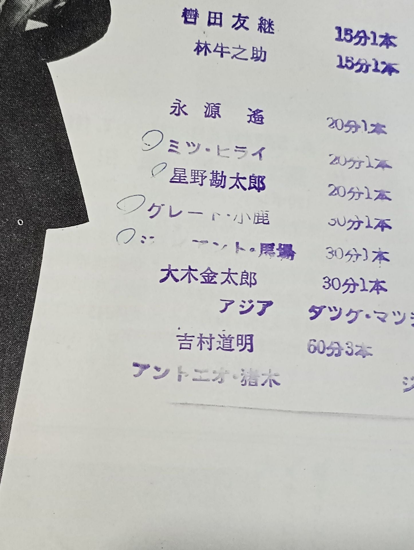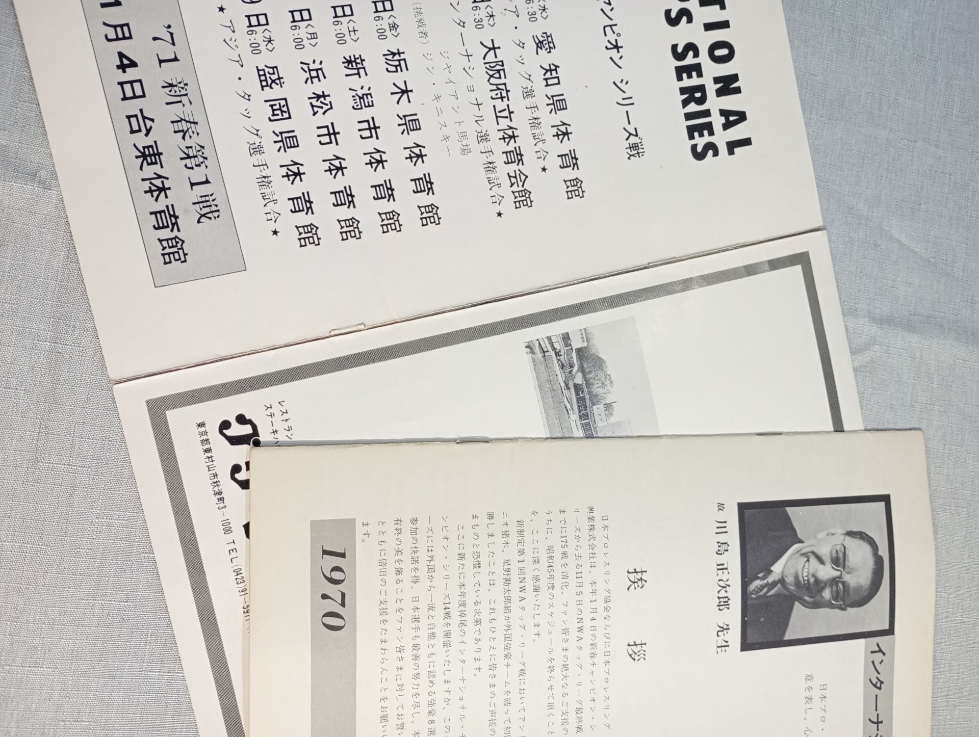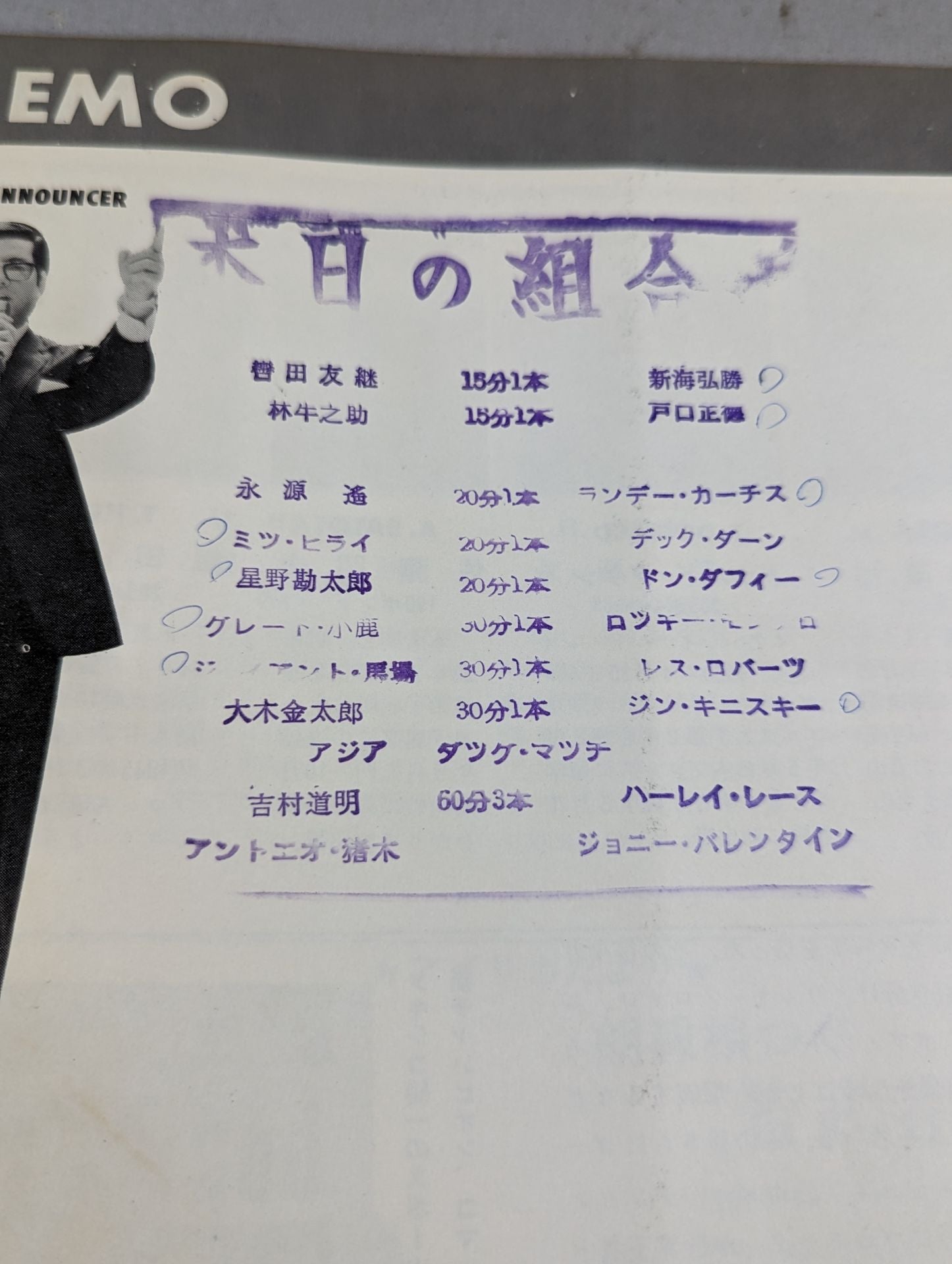 1970年 会場:愛知県体育館 / スタンプあり:【アジアタッグ選手権試合】アントニオ猪木&吉村道明vsジョニー・バレンタイン&ハーリー・レイス(ハーレイ・レースと表記) / 大木金太郎vsジン・キニスキー / ジャイアント馬場vsレス・ロバーツ