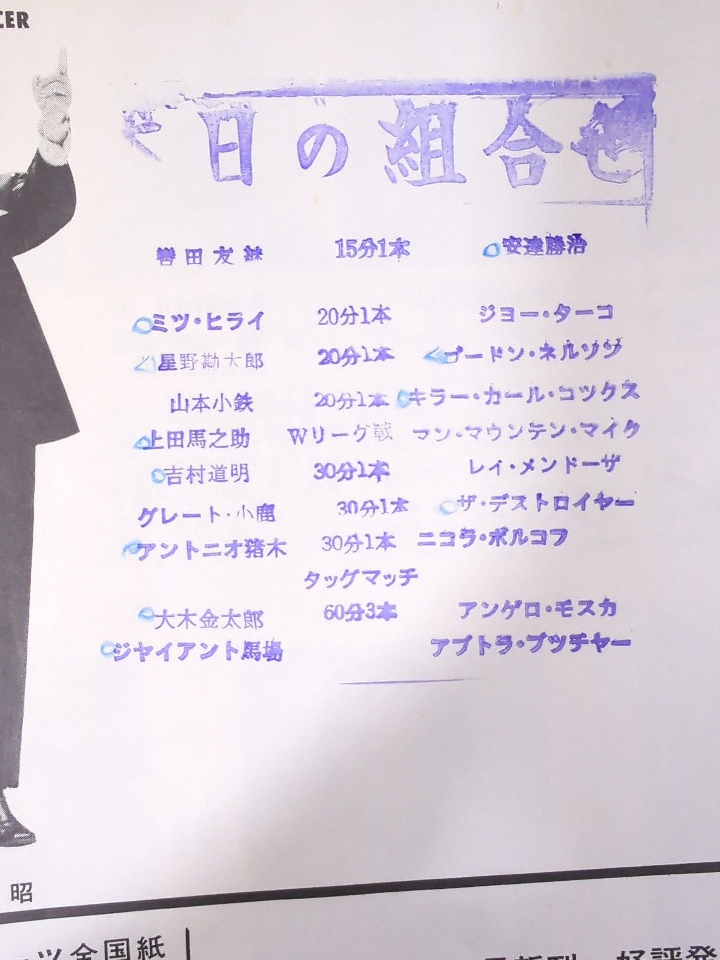 1971年 会場:後楽園ホール / スタンプあり:ジャイアント馬場&大木金太郎vsアブドーラ・ザ・ブッチャー&アンジェロ・モスカ(アンゲロ・モスカと表記) / アントニオ猪木vsニコリ・ボルコフ(ニコラ・ボルコフと表記)