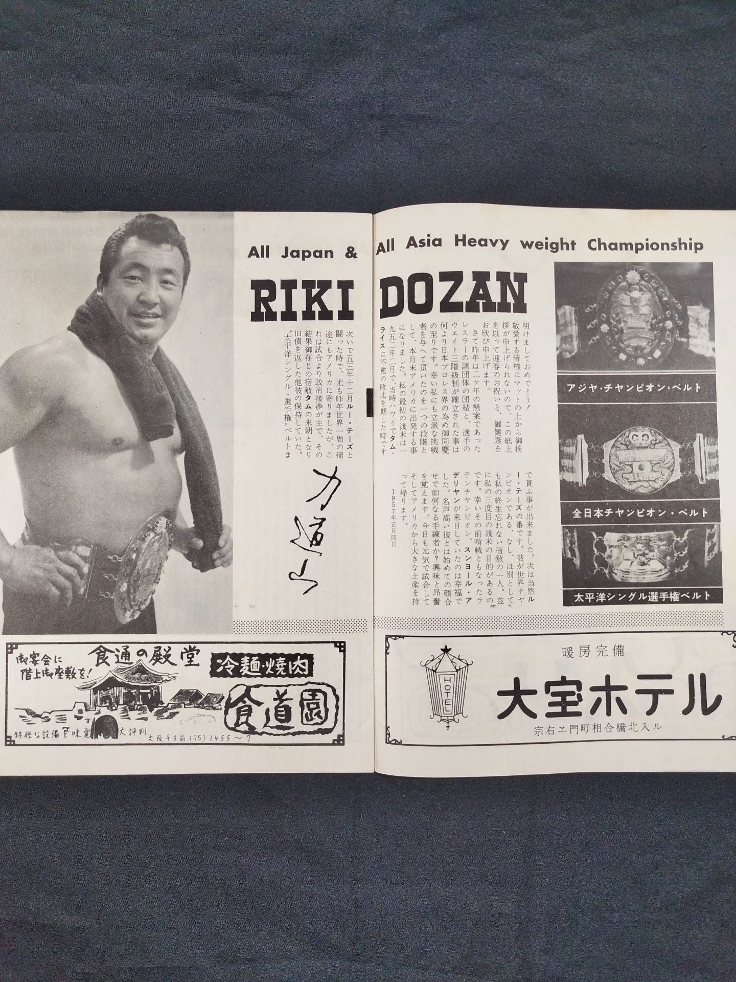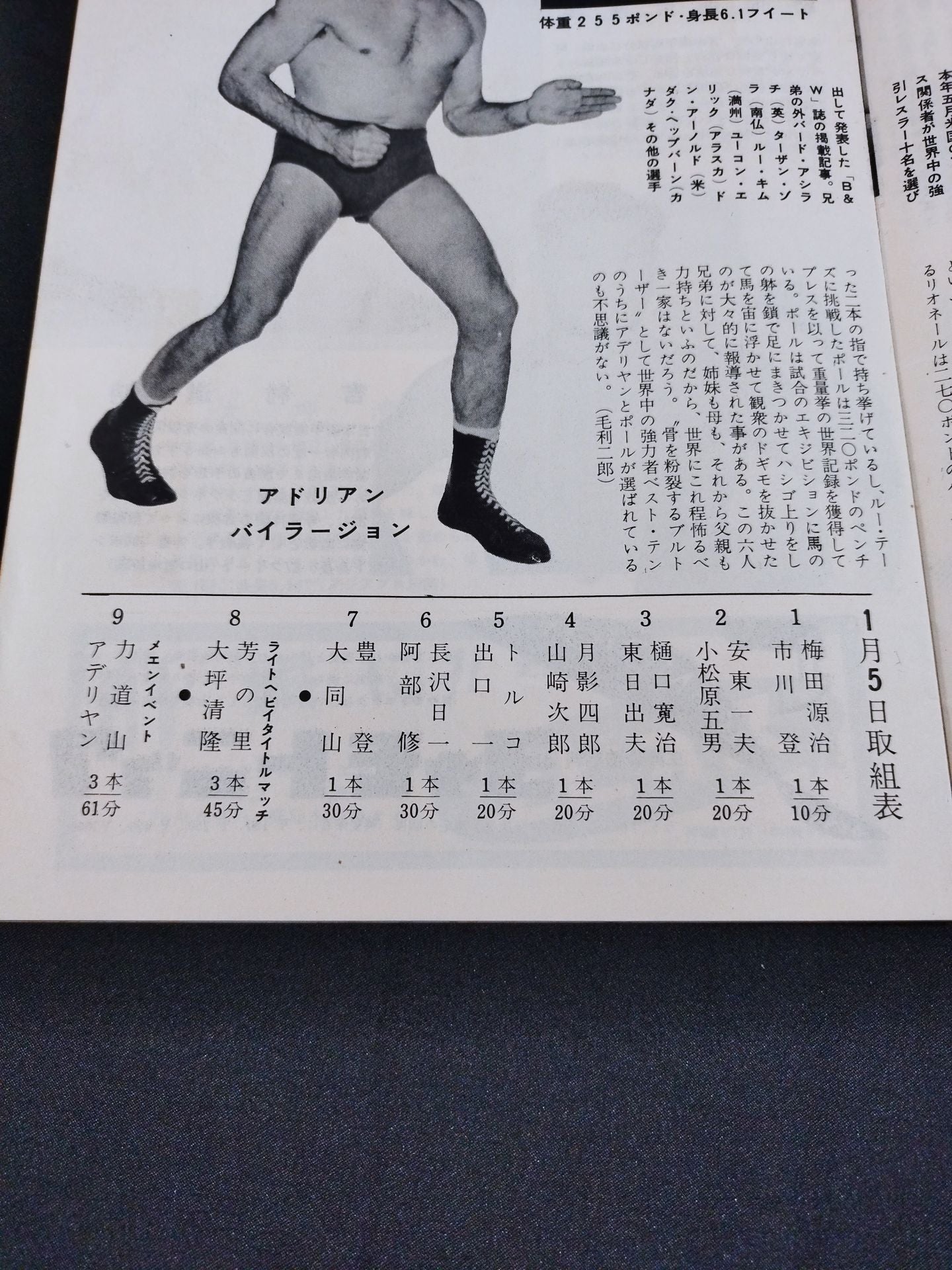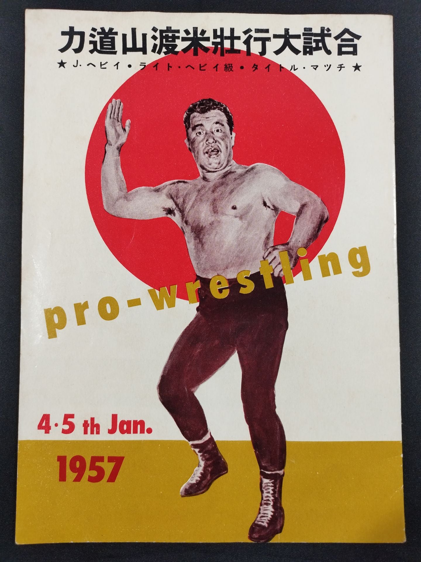 1957年 参戦外国人が1名のみの珍しいシリーズの大阪大会限定パンフレット。(ユセフ・トルコを除く)会場:大阪府立体育会館 / 印刷対戦カード:(1.4、1.5共通)力道山vsアデリヤン(アドリアン / アデリアン・バイラージョン / アドリアン・バイラージョン) /(1.4)【日本ジュニアヘビー級選手権試合】駿河海三津夫vs吉村道明 /(1.5)【日本ライトヘビー級選手権試合】 芳の里潤三vs大坪清隆