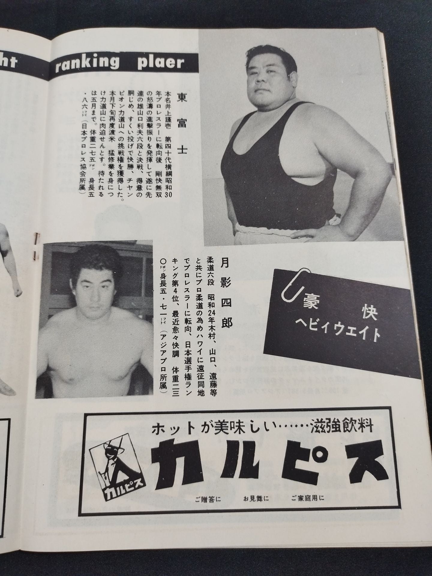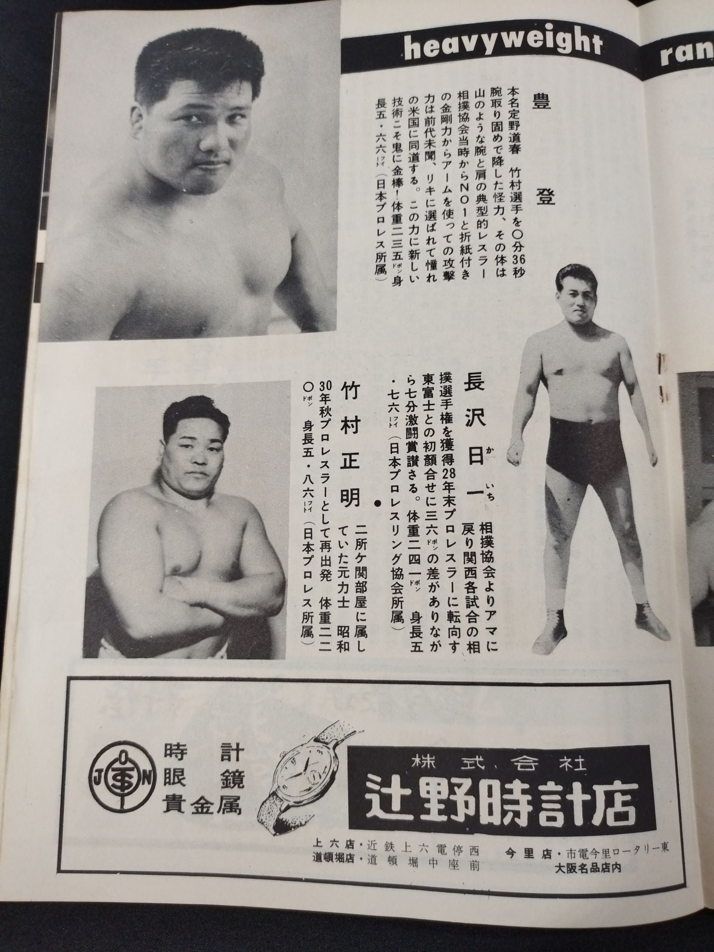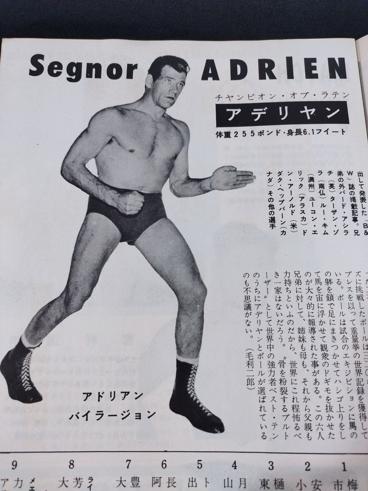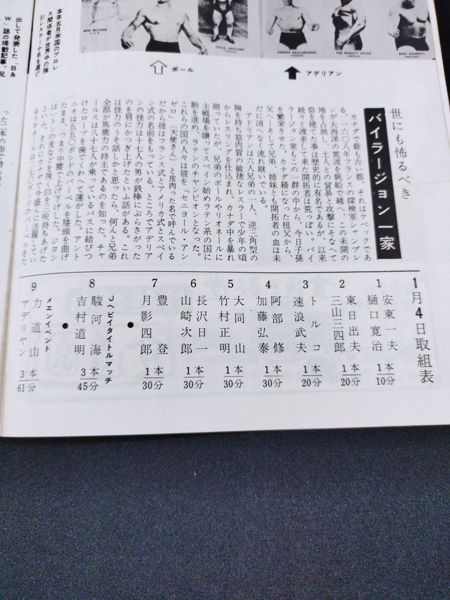 1957年 参戦外国人が1名のみの珍しいシリーズの大阪大会限定パンフレット。(ユセフ・トルコを除く)会場:大阪府立体育会館 / 印刷対戦カード:(1.4、1.5共通)力道山vsアデリヤン(アドリアン / アデリアン・バイラージョン / アドリアン・バイラージョン) /(1.4)【日本ジュニアヘビー級選手権試合】駿河海三津夫vs吉村道明 /(1.5)【日本ライトヘビー級選手権試合】 芳の里潤三vs大坪清隆