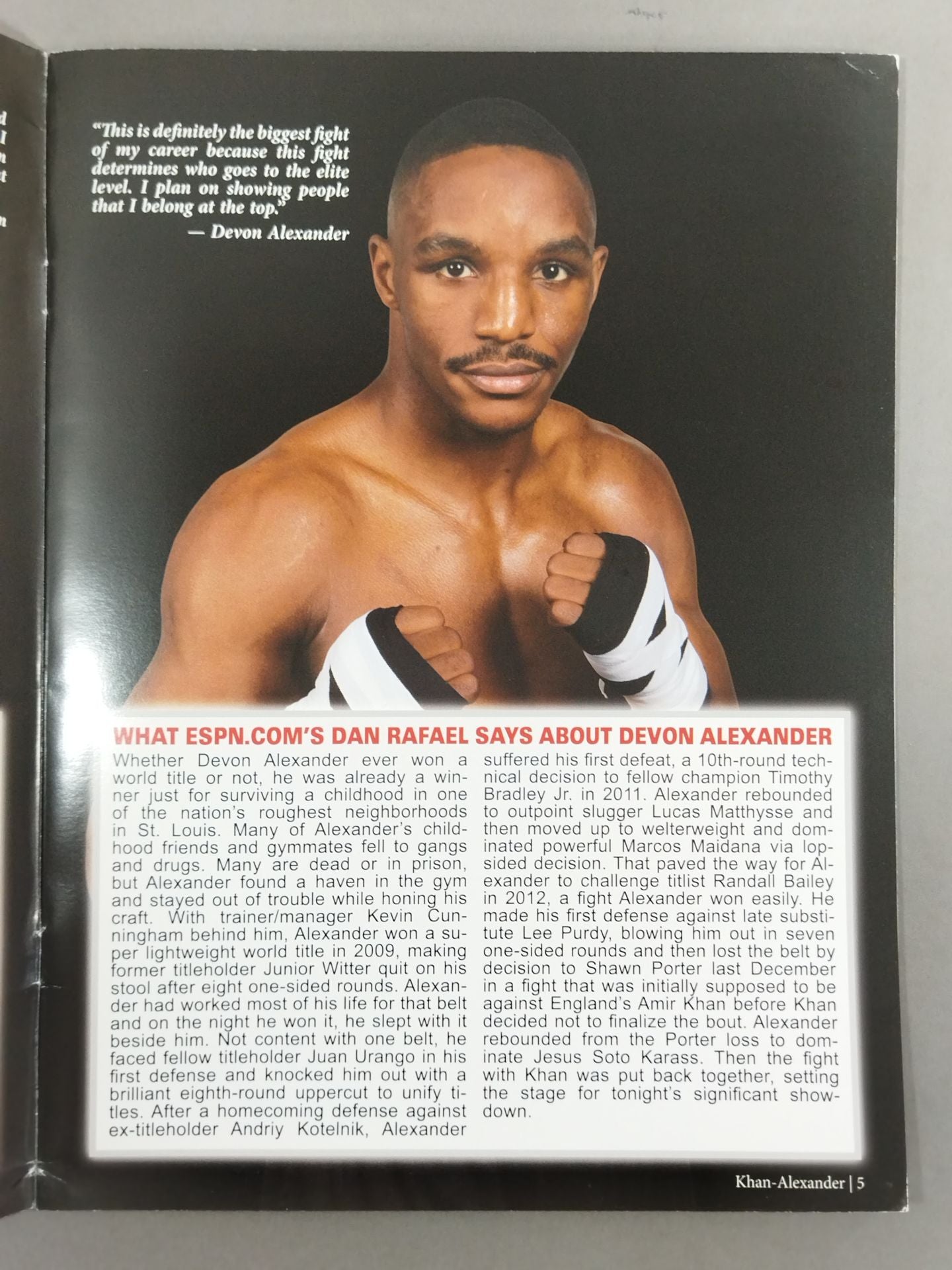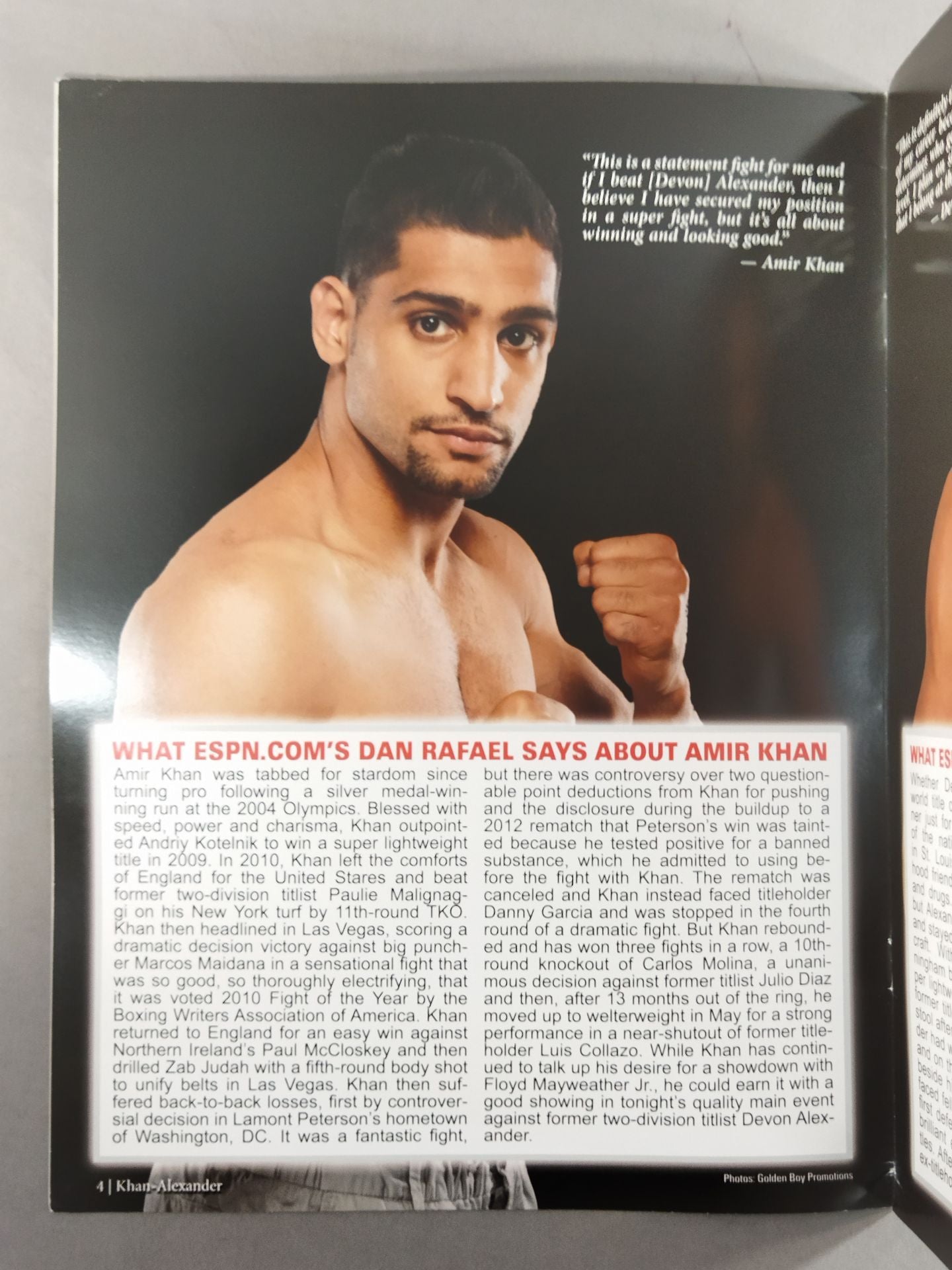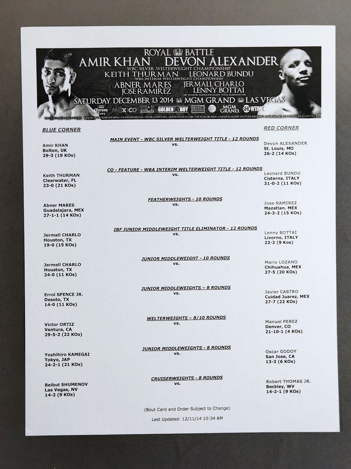 2014年 全編英語表記 / 会場:米・ネバダ州 ラスベガス MGMグランド・ガーデン・アリーナ別紙対戦カードあり:【WBC世界ウェルター級シルバー王座決定戦】アミール・カーンvsアミール・カーンvsデボン・アレクサンダー