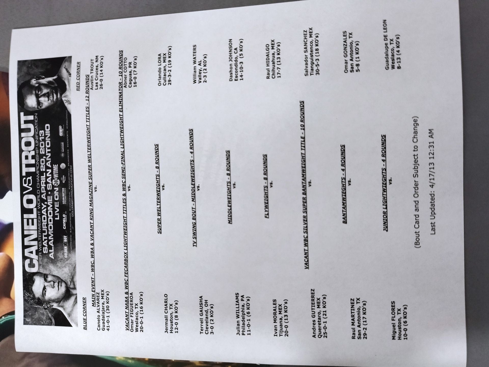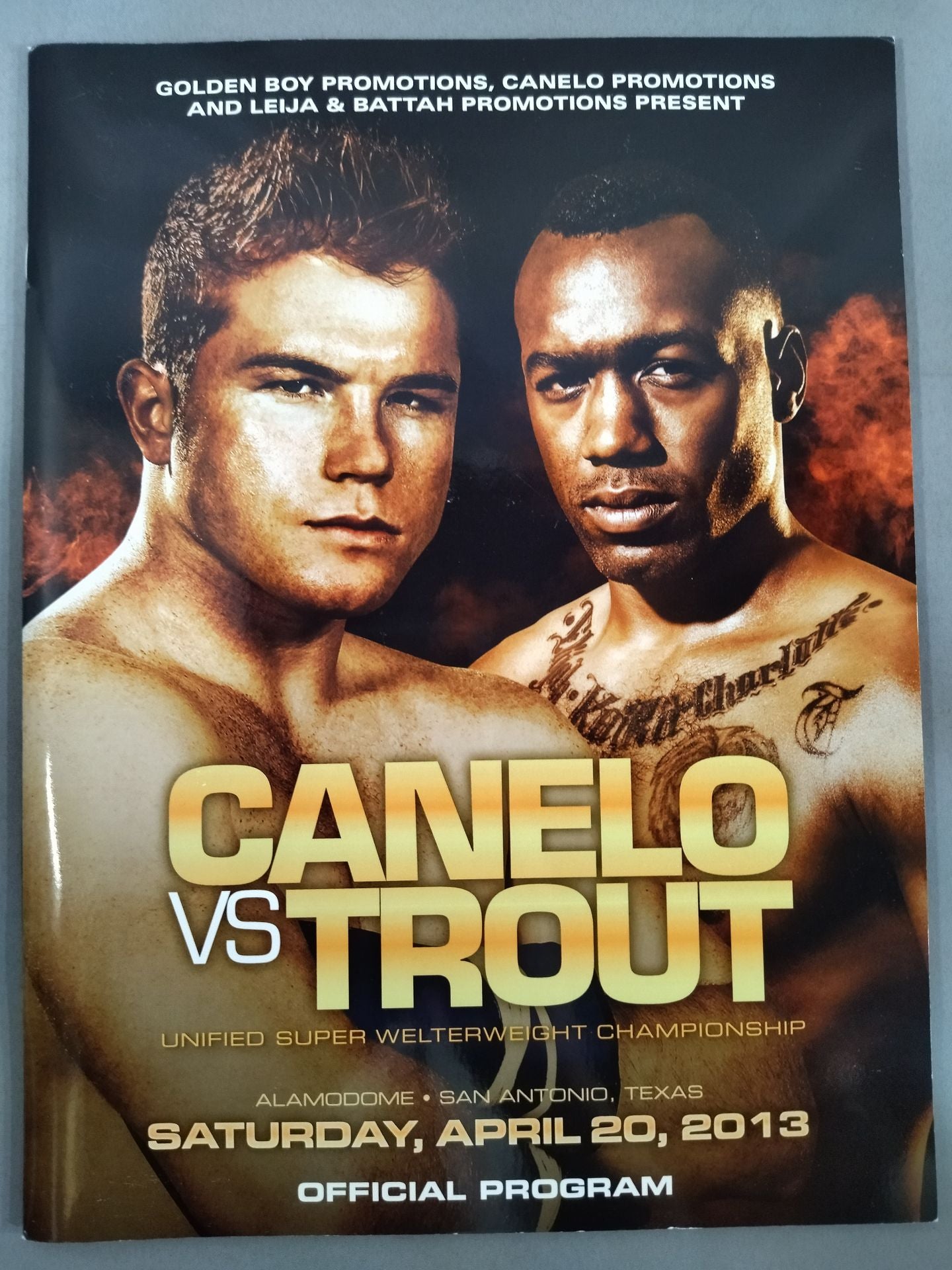 2013年 全編英語表記 / 会場:米・テキサス州サンアントニオ アラモドーム別紙対戦カードあり【WBA・WBC世界スーパーウェルター級王座統一戦】カネロ・アルバレス(サウル・アルバレス)vsオースティン・トラウト