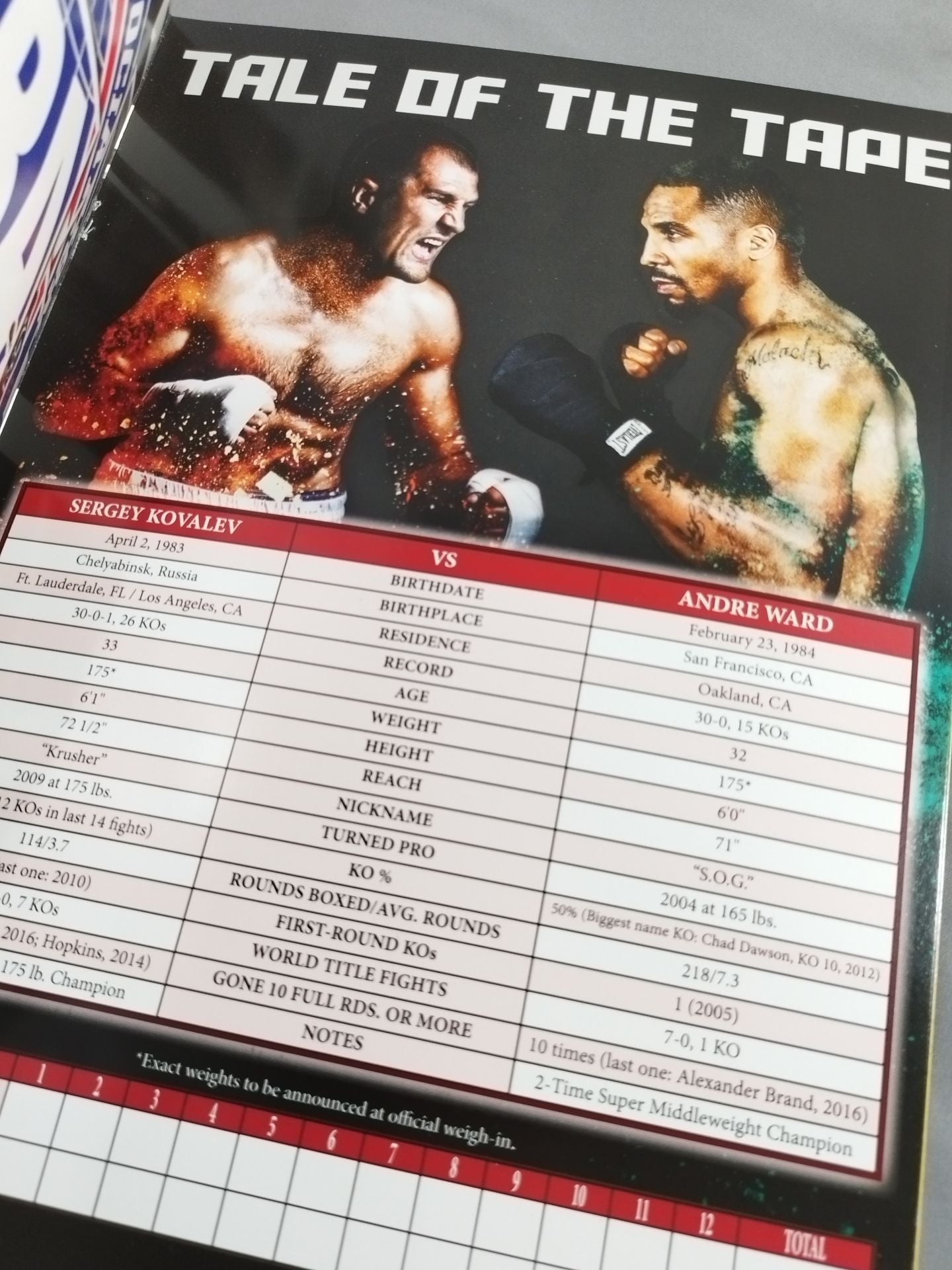2016年 全編英語表記 / 会場:米 ネバダ州ラスベガス T-モバイル・アリーナ印刷対戦カード:【WBA・IBF・WBO世界ライトヘビー級統一戦】セルゲイ・コバレフvsアンドレ・ウォード(初戦) /【NABF北米ライトヘビー級タイトルマッチ】オレクサンドル・グウォジクvsアイザック・チレンバ