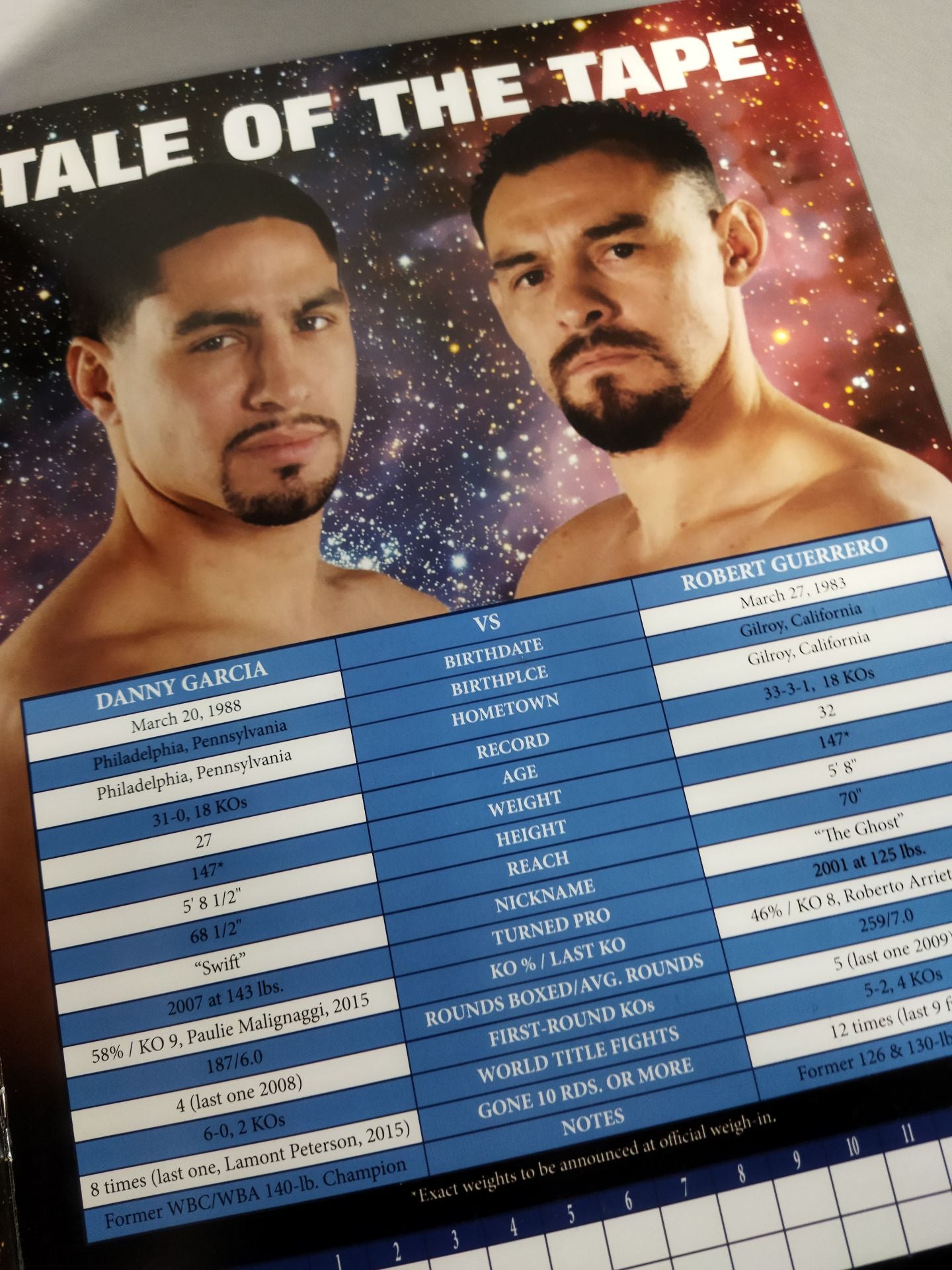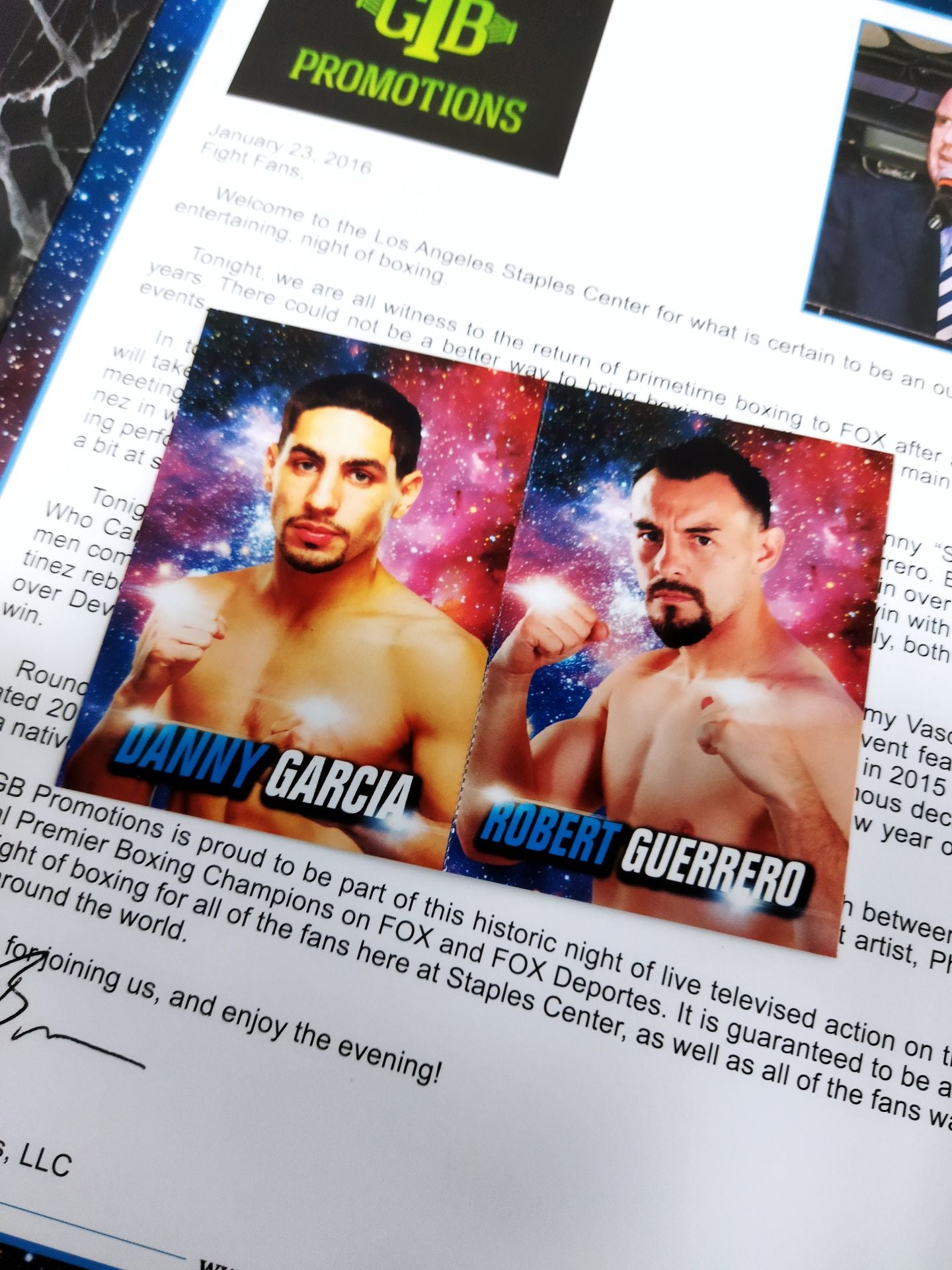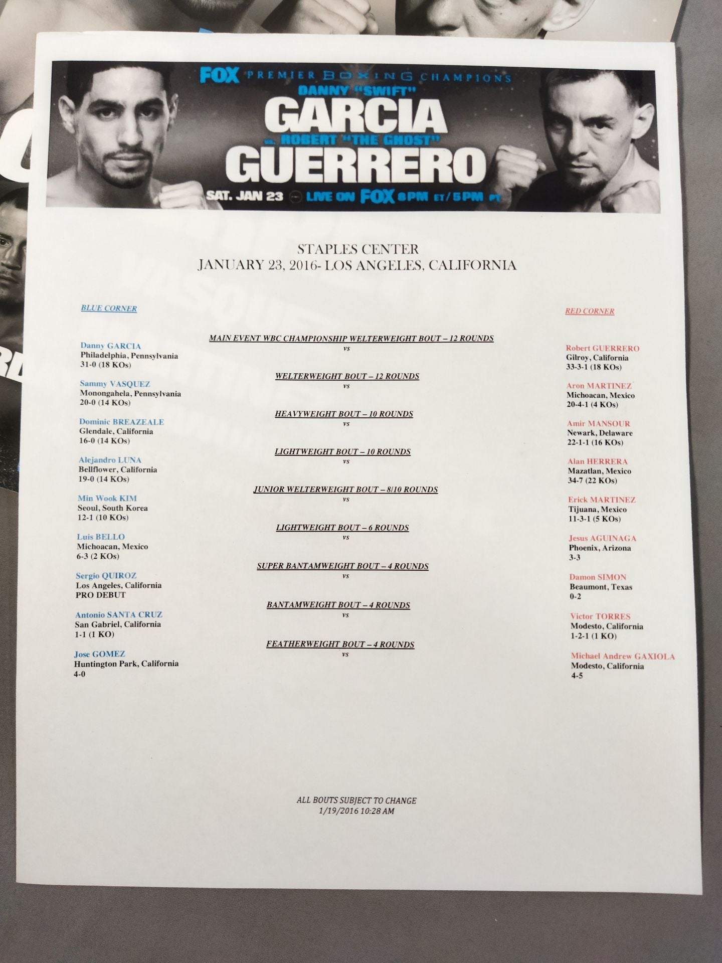 2016年 全編英語表記 / 会場:米・カルフォルニア州ロサンゼルス ステイプルズ・センター(クリプト・ドットコム・アリーナ)別紙対戦カードあり:【WBC世界ウェルター級王座決定戦】ダニー・ガルシアvsロバート・ゲレーロ
