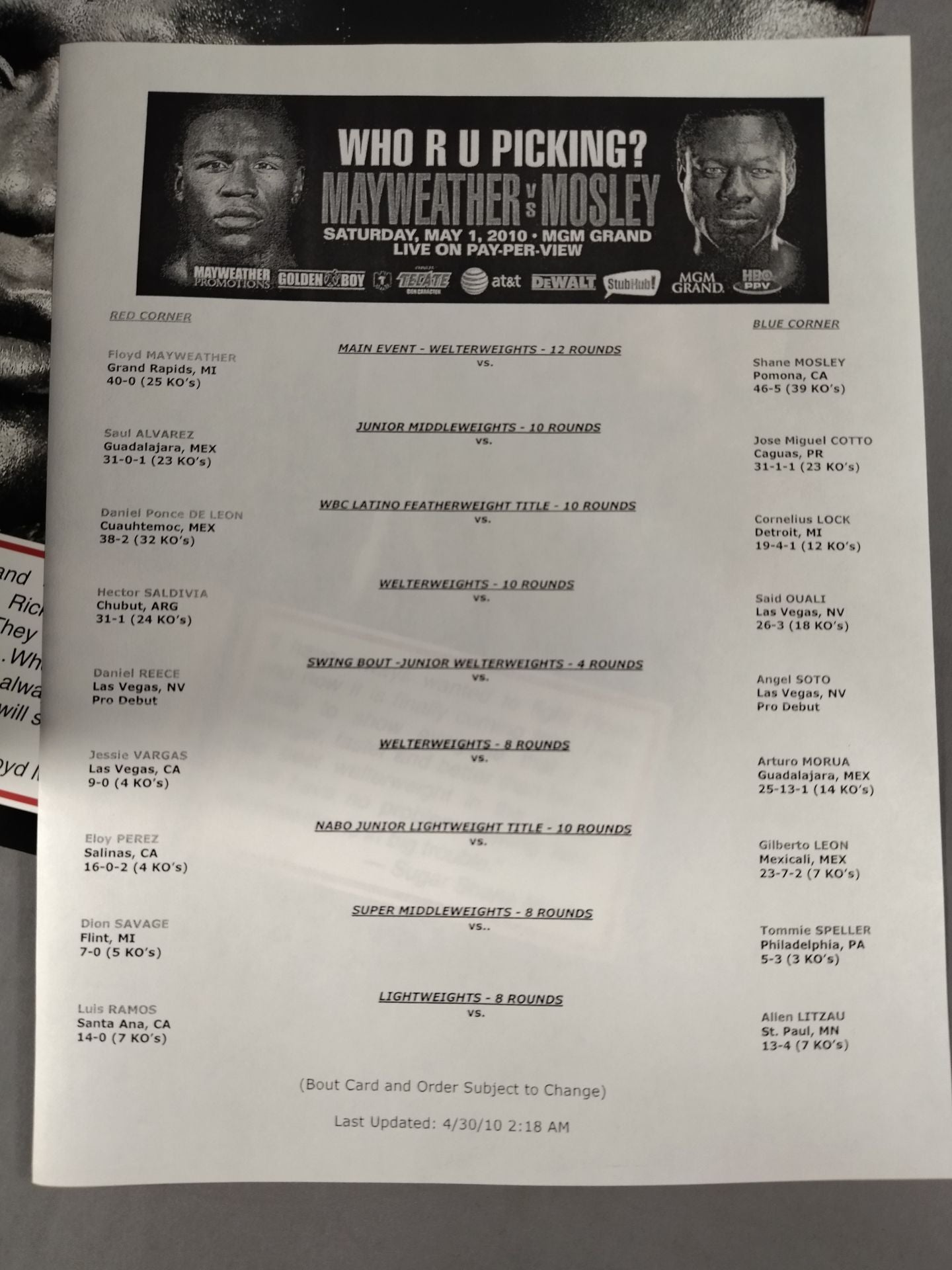 2010年 全編英語表記 / 会場:米・ネバダ州 ラスベガス MGMグランド・ガーデン・アリーナ別紙対戦カードあり【WBA世界ウェルター級スーパー王者タイトルマッチ】フロイド・メイウェザー・ジュニアvsシェーン・モズリー