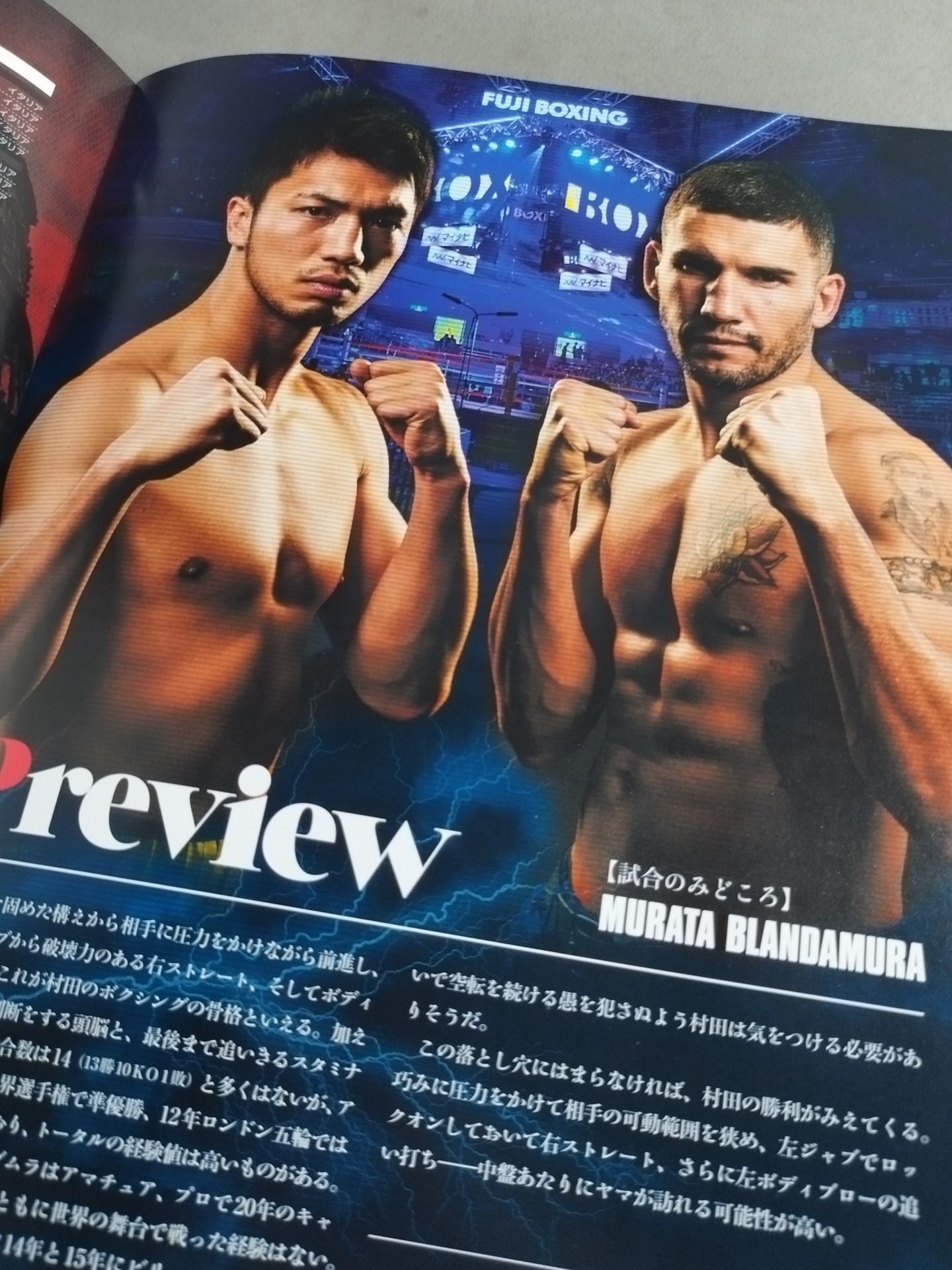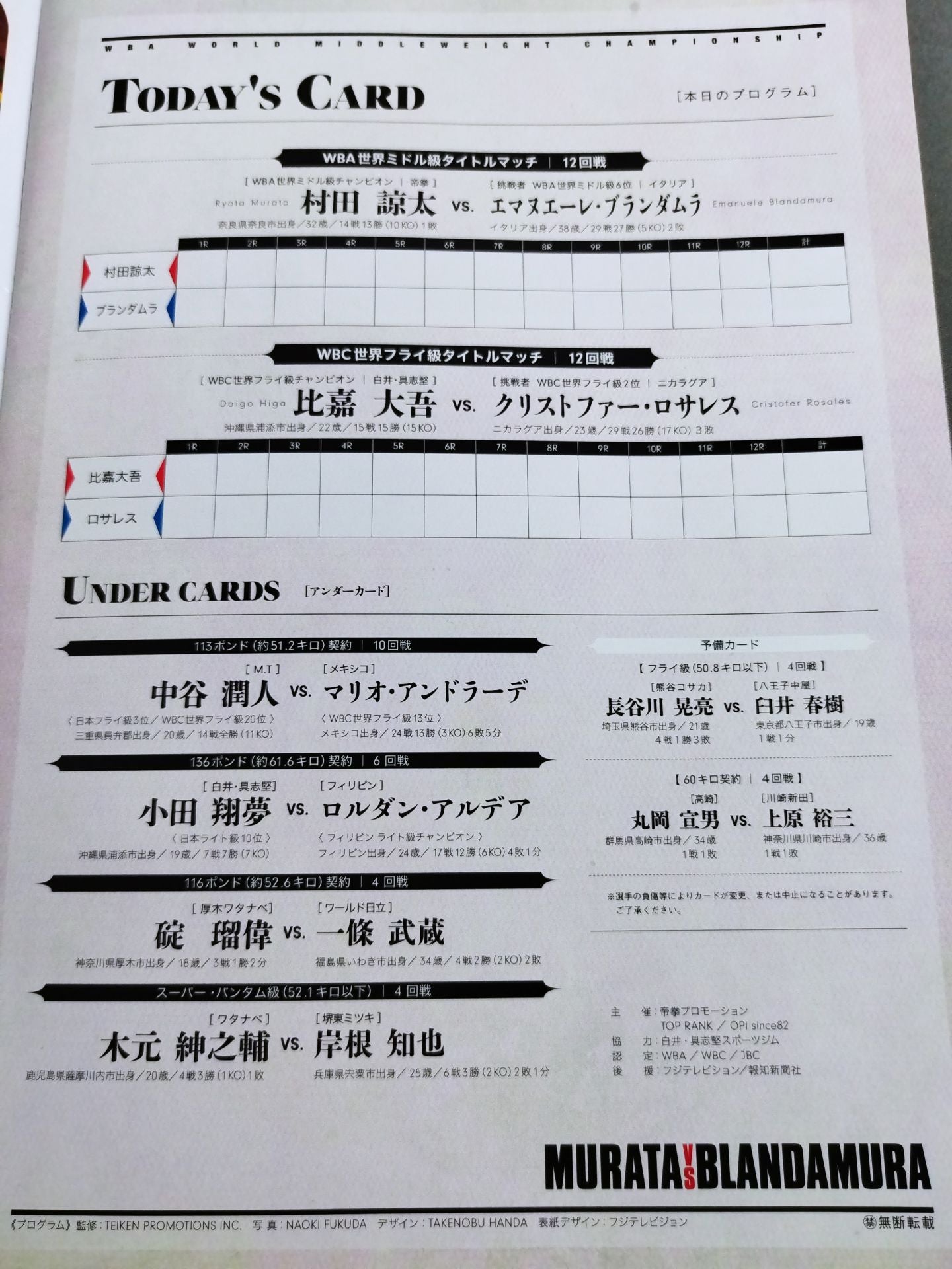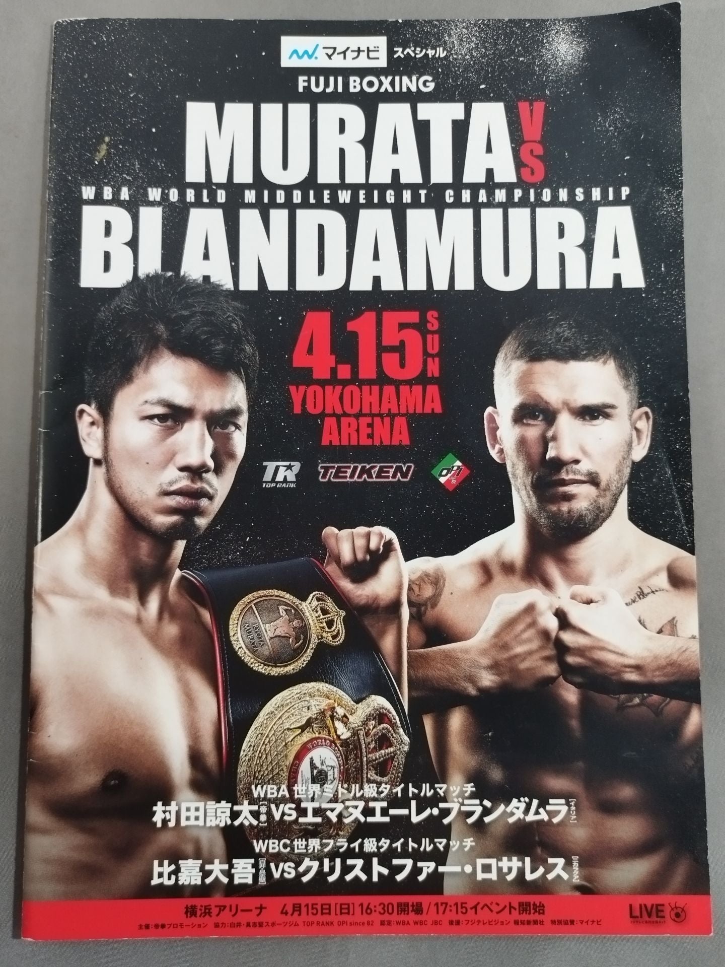 2018年 印刷対戦カード:【WBA世界ミドル級タイトルマッチ】村田諒太vsエマヌエーレ・ブランダムラ /【WBA世界フライ級タイトルマッチ】比嘉大吾vsクリストファー・ロサレス / FUJI BOXING / A4サイズ