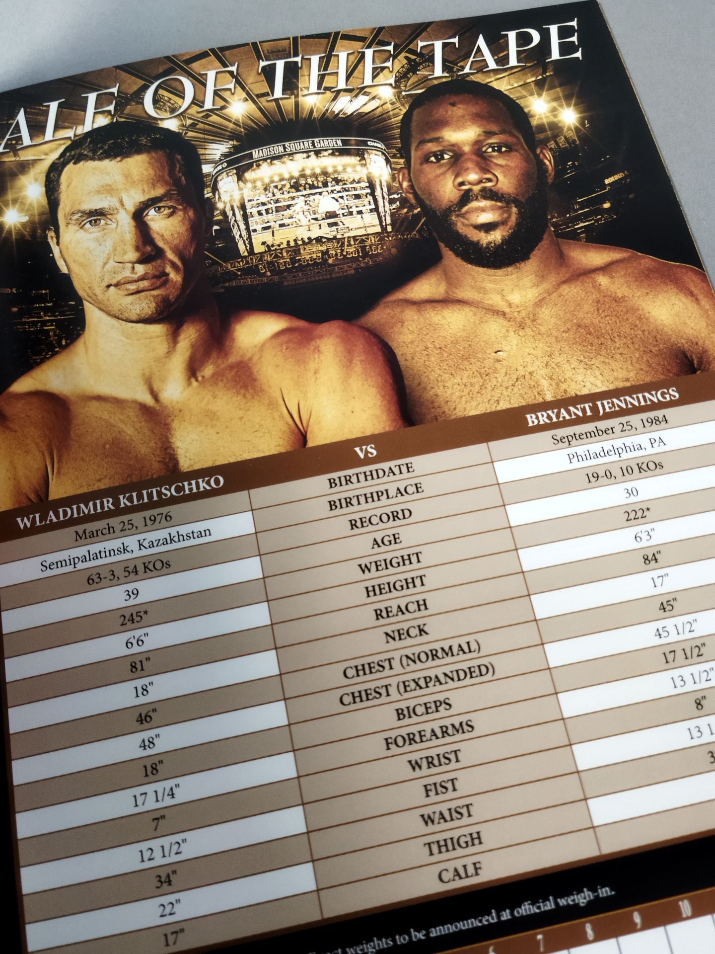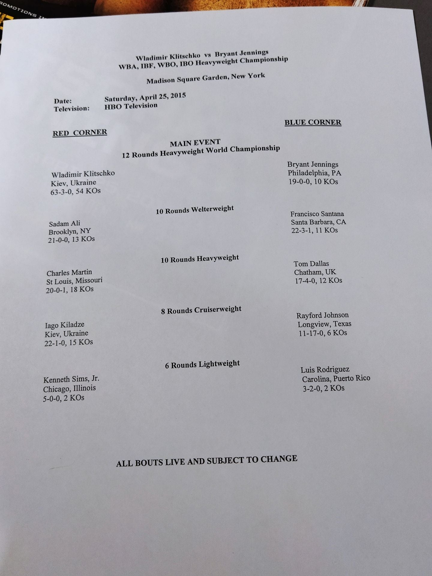2015年 全編外国語表記 / 会場:米・ニューヨーク州マンハッタン マディソン・スクエア・ガーデン(MSG)別紙対戦カードあり:【WBA・IBF・WBO世界ヘビー級統一戦】ウラジミール・クリチコvsブライアント・ジェニングス