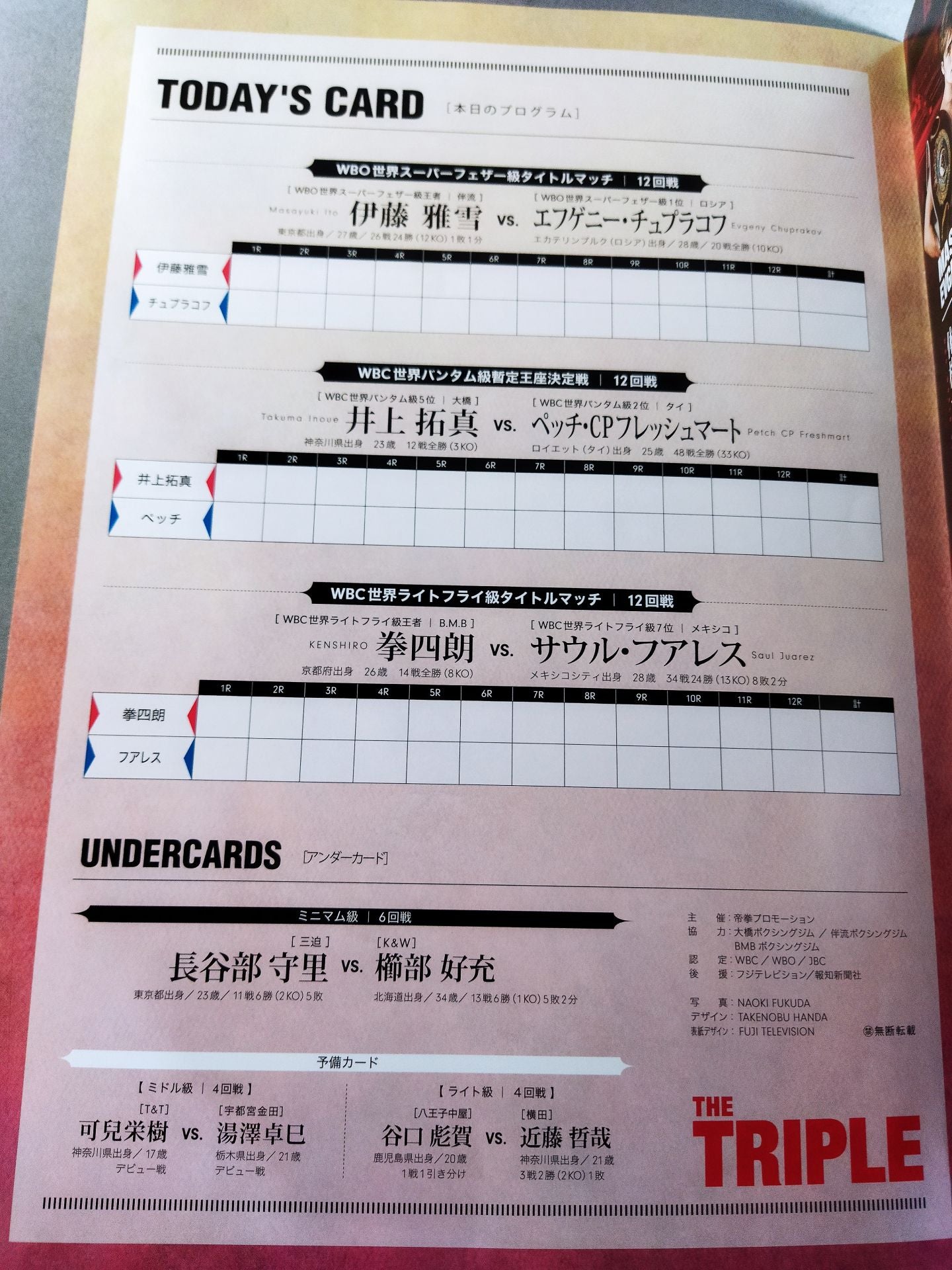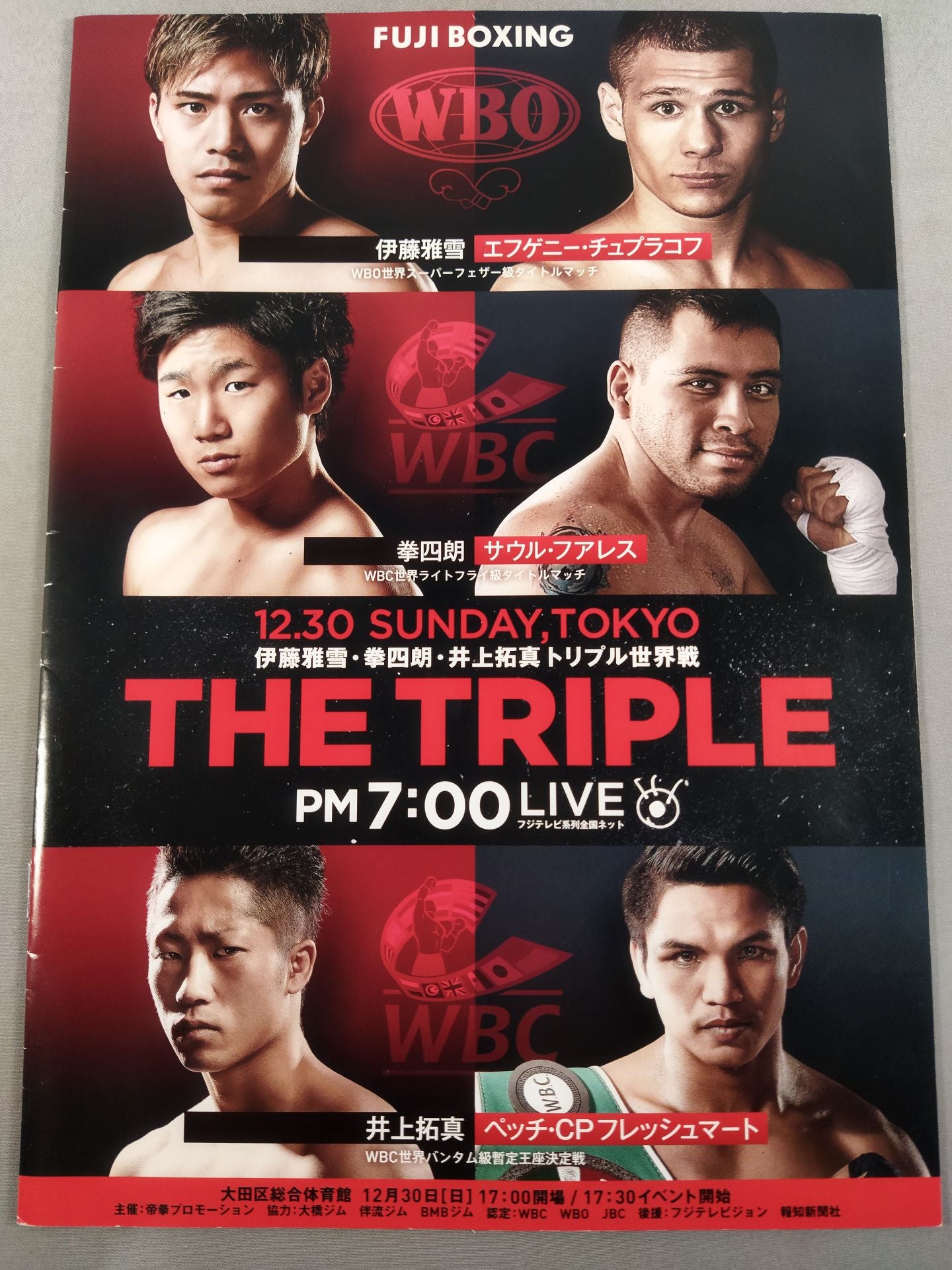 2018年 会場:大田区総合体育館 / 印刷対戦カード:【WBO世界スーパーフェザー級タイトルマッチ】伊藤雅雪vsエフゲニー・チュプラコフ /【WBC世界バンタム級暫定王座決定戦】井上拓真vsペッチ・CPフレッシュマート /【WBC世界ライトフライ級タイトルマッチ】拳四朗vsサウル・フアレス / FUJI BOXING