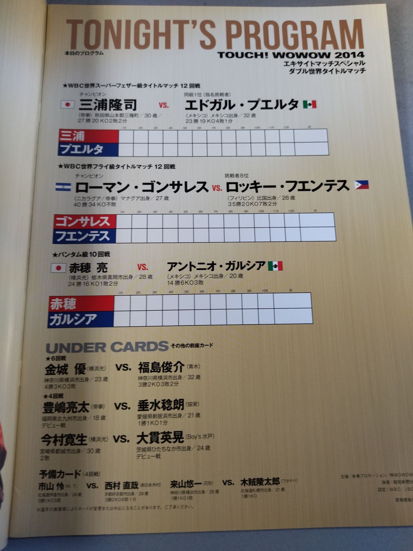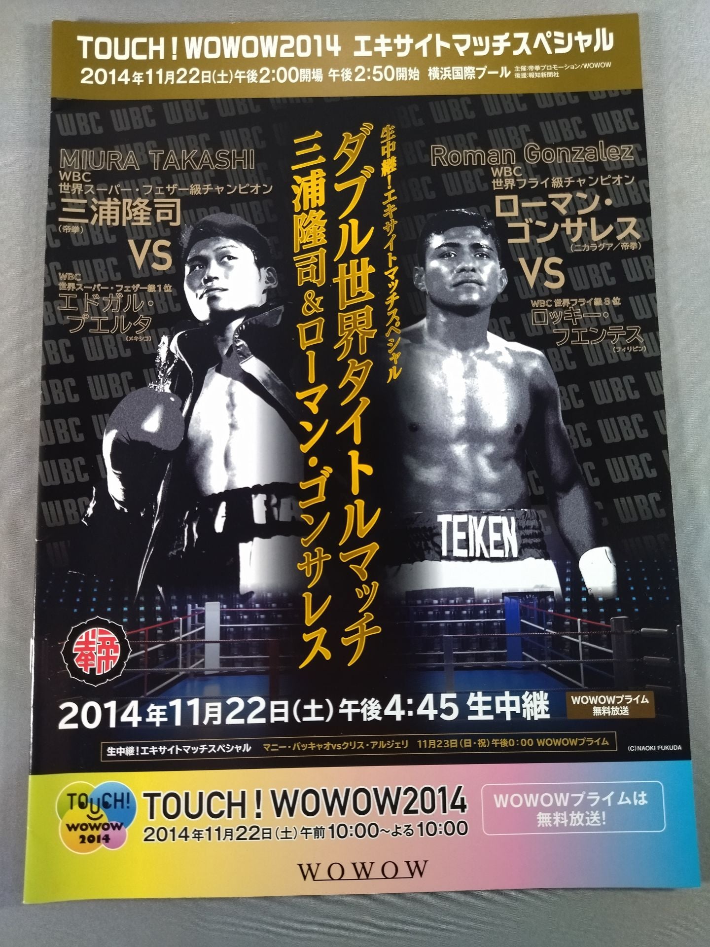 2014年 会場:横浜国際プール / 印刷対戦カード:【WBCスーパーフェザー級タイトルマッチ】三浦隆司vsエドガル・プエルタ / 【WBC世界フライ級タイトルマッチ】ローマン・ゴンザレスvsロッキー・フエンテス