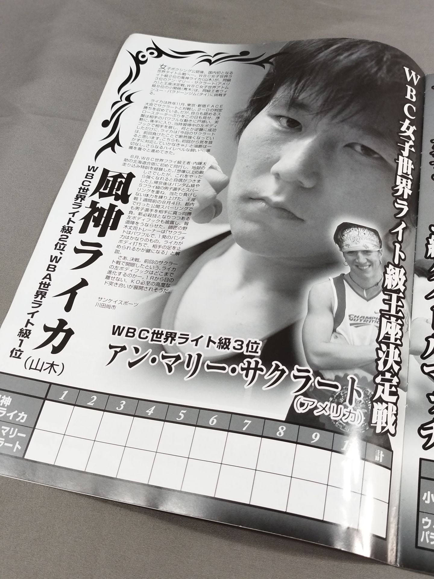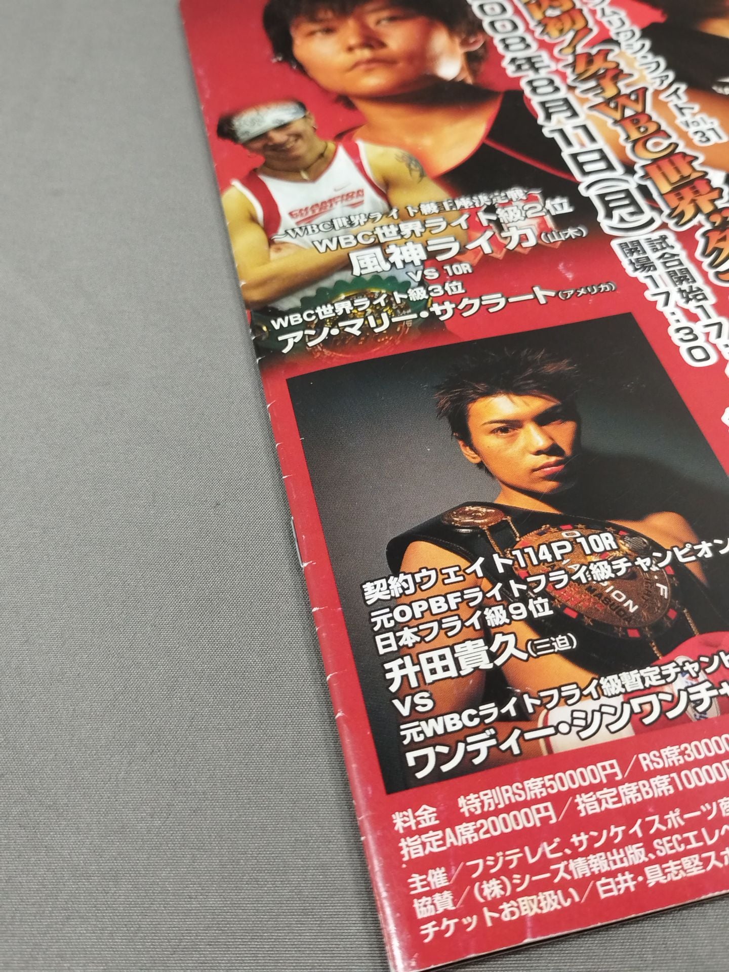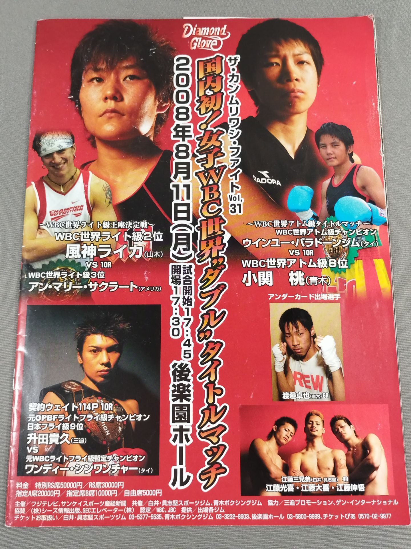 2008年 会場:後楽園ホール / 印刷対戦カード:【WBC女子世界ライトキュ王座決定戦】風神ライカvsアン・マリーサクラート / ワンディ・シンワンチャーvs升田貴久 /【WBC女子アトム級タイトルマッチ】ウィンユー・パラドーンジムvs小関桃 カンムリワシ・ファイトVol.31