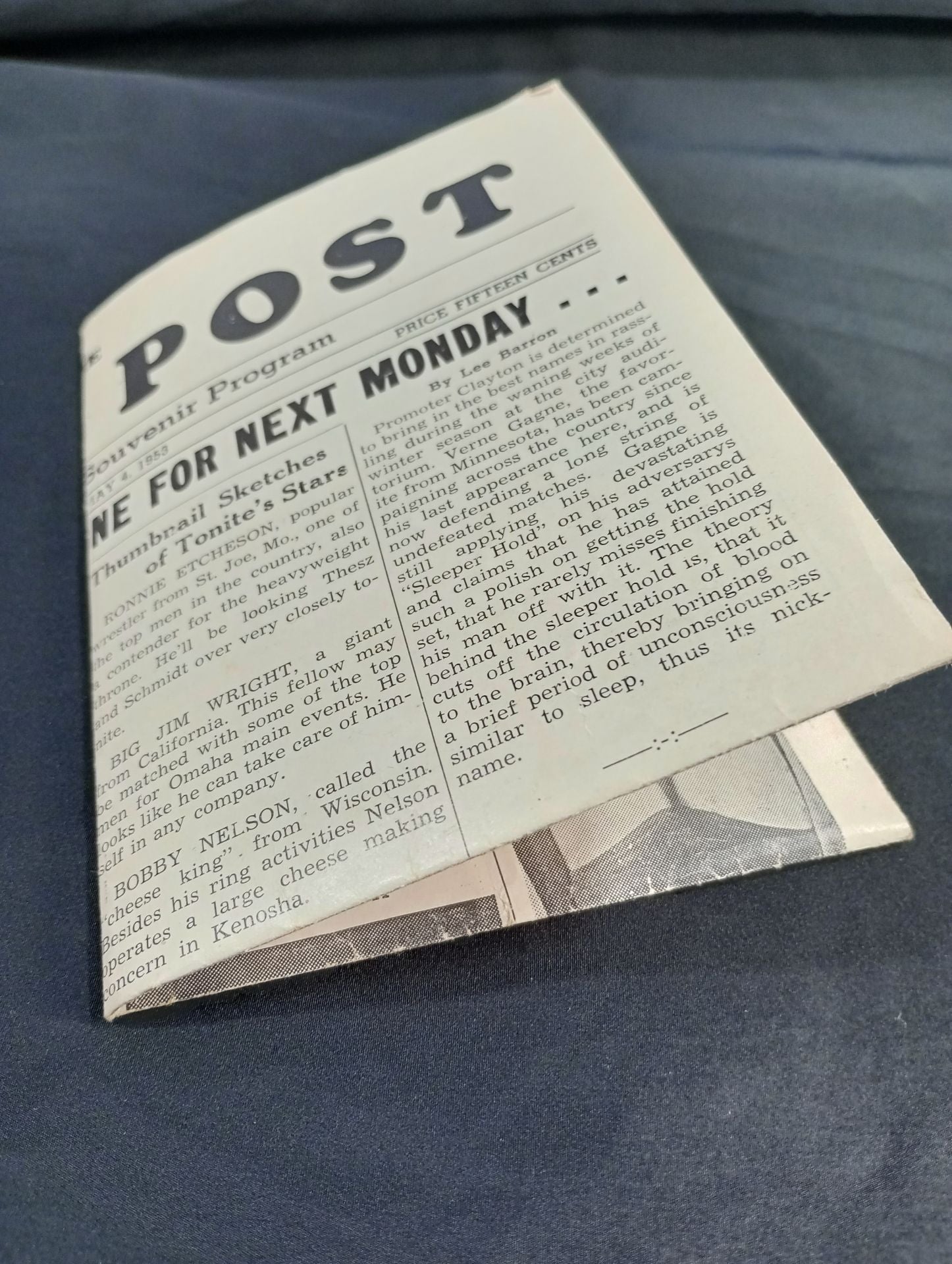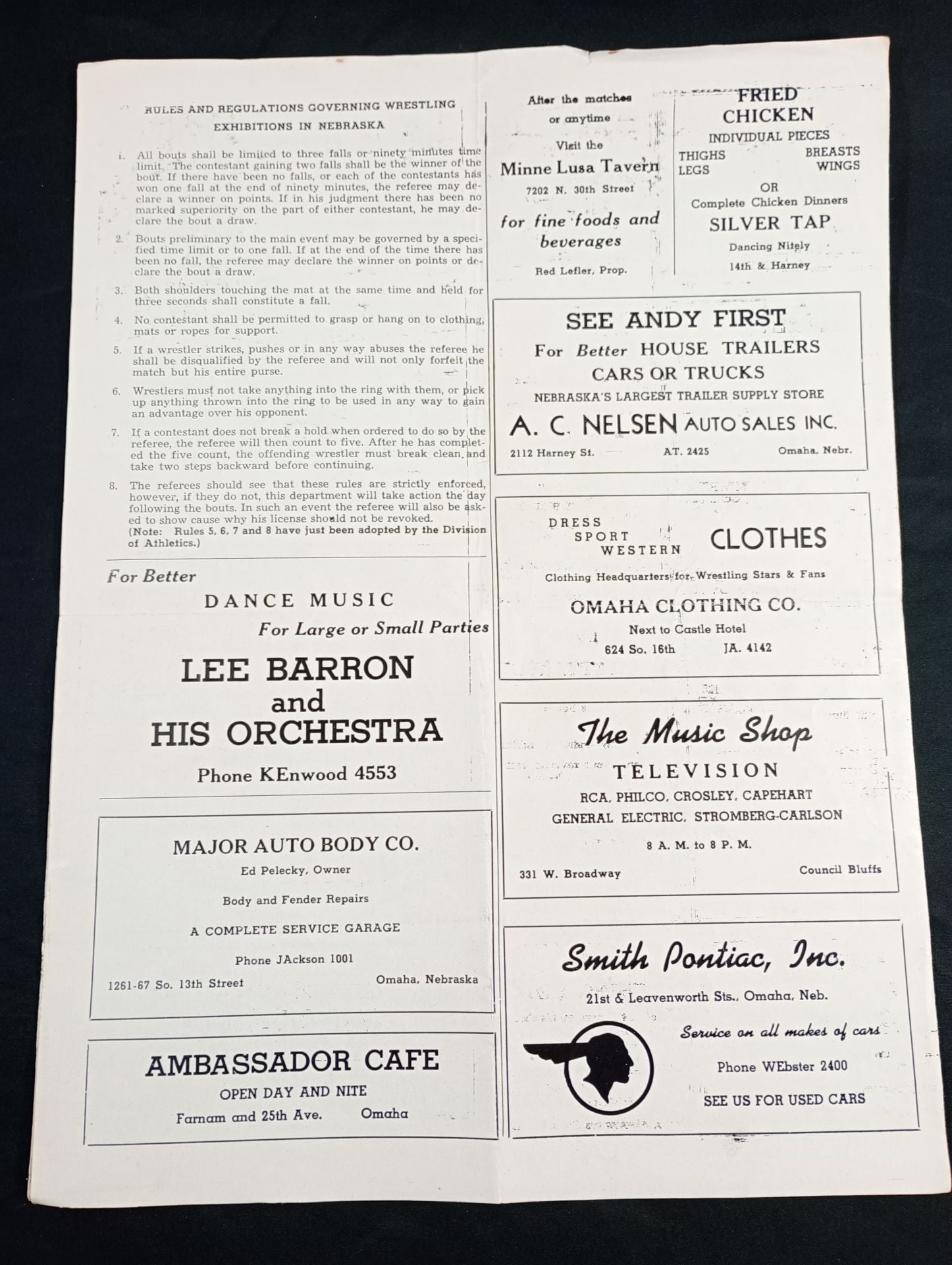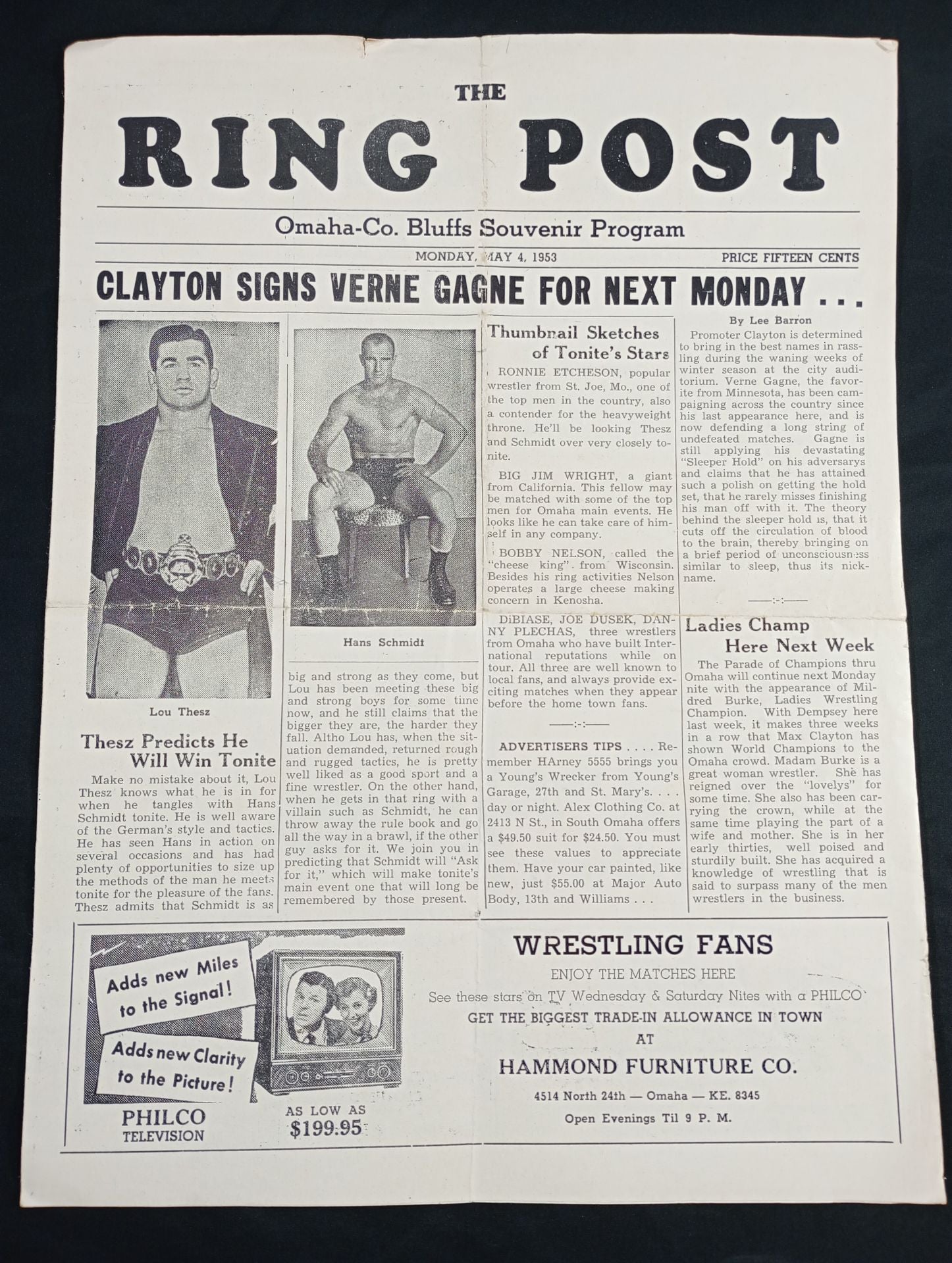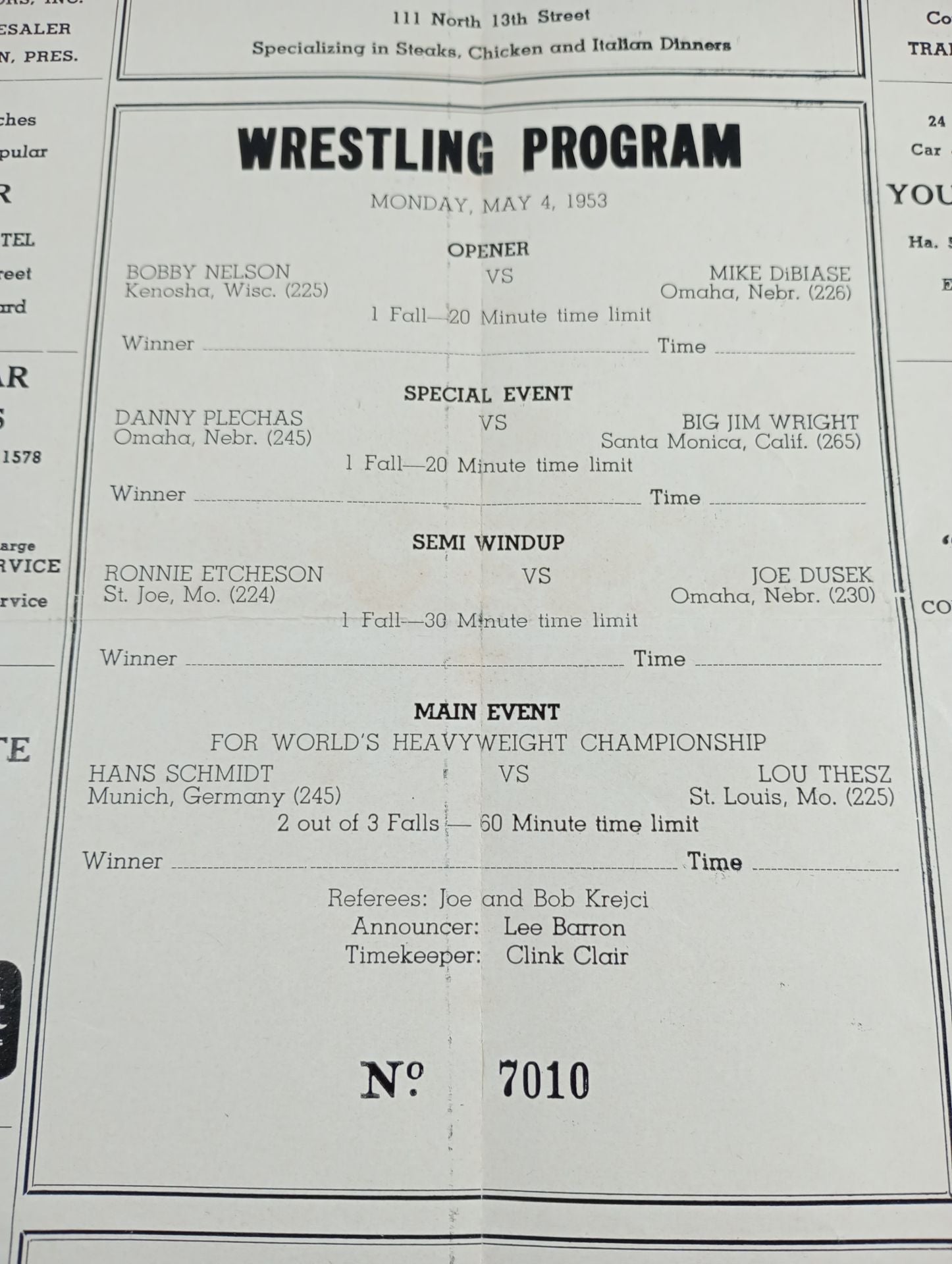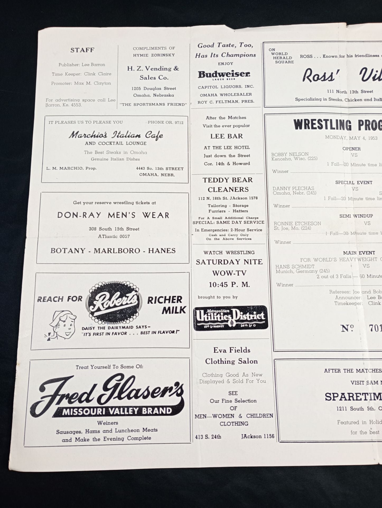 1953年 会場:米 ネブラスカ州オマハ / 全編英語表記印刷対戦カード:【NWA世界ヘビー級選手権試合】ルー・テーズvsハンス・シュミット MINNEAPOLIS BOXING & WRESTLING CLUB