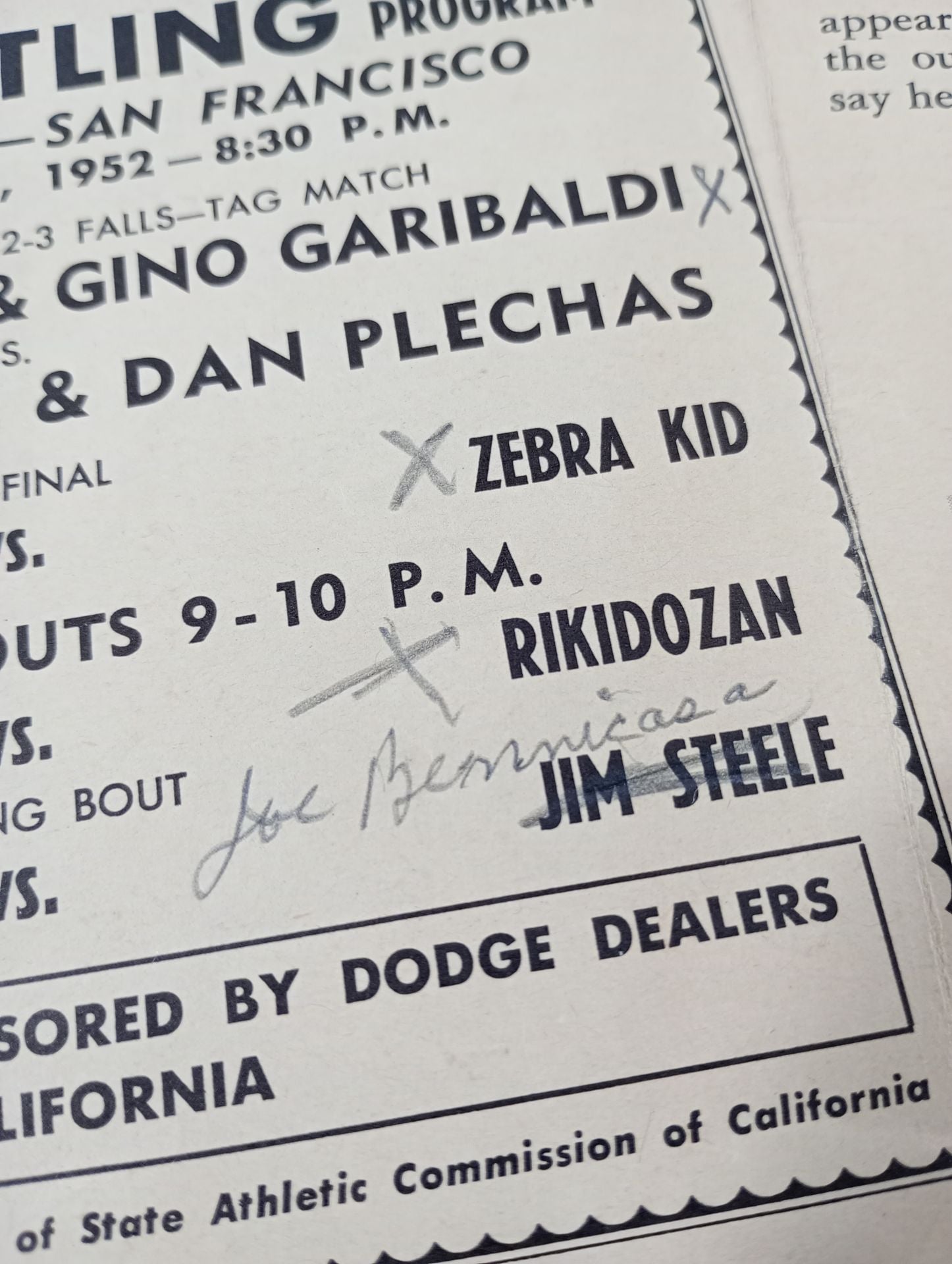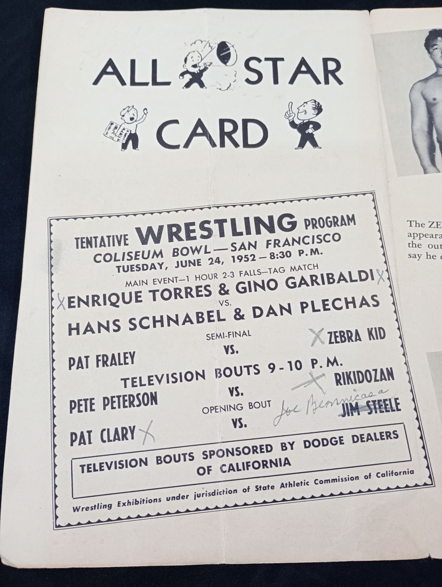 1952年 会場:米 カリフォルニア州サンフランシスコ コロシアムボウル / 全編英語表記 / 力道山vsピート・ピーターセン印刷対戦カード:エンリケ・トーレス&ジノ・ガリバルディvsハンス・シュナーベル&ダニー・プレッチェス Coliseum