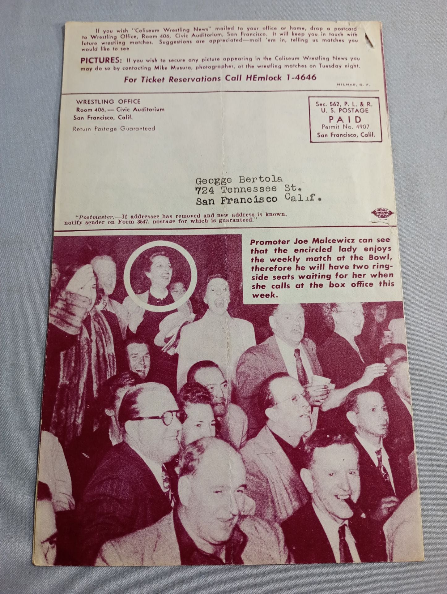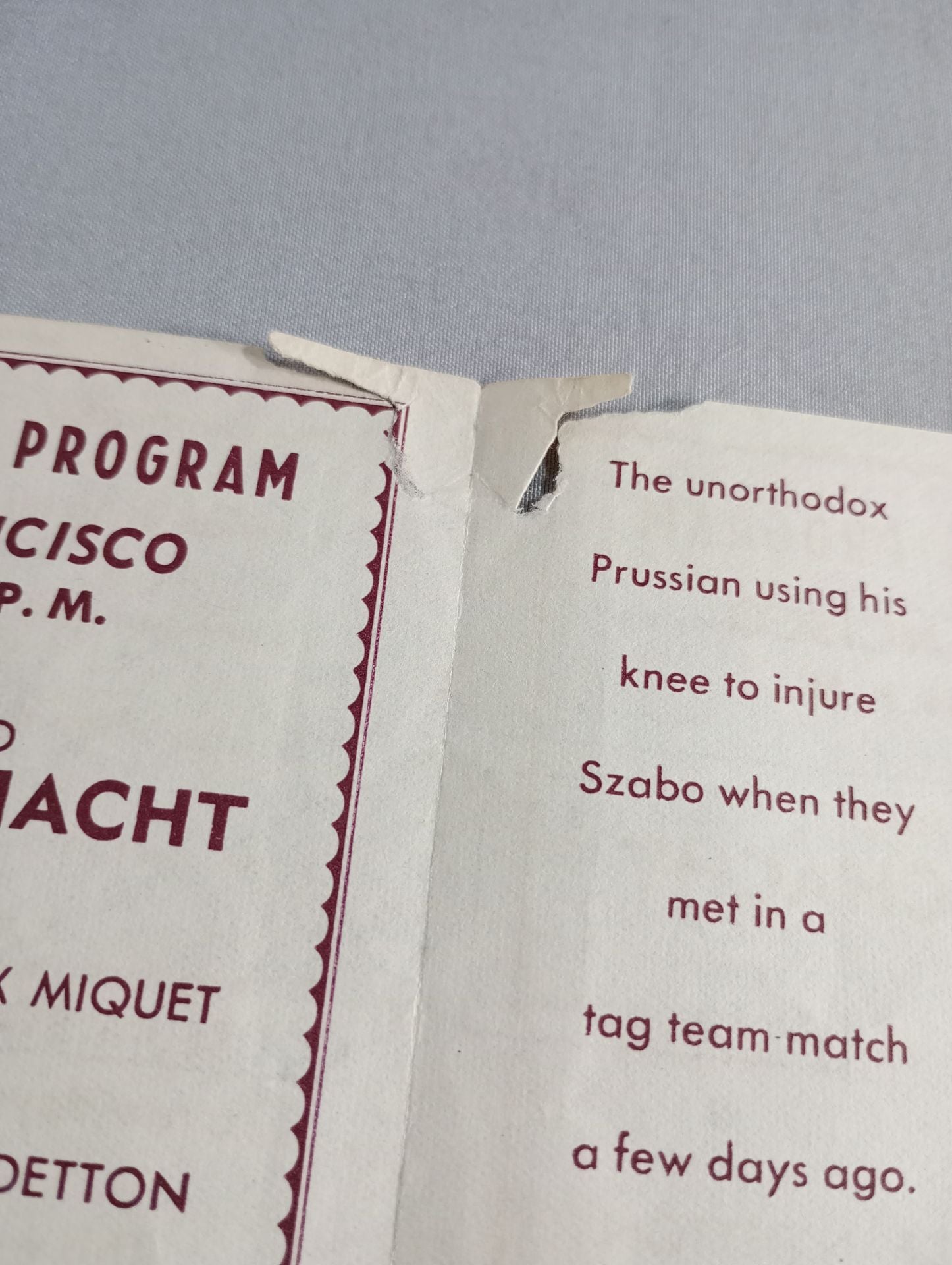 1948年 会場:米・カリフォルニア州サンフランシスコ コロシアム・ボウル / 全編英語表記印刷対戦カード:トミー・オトゥールvsフレッド・フォン・シャハト West Coast