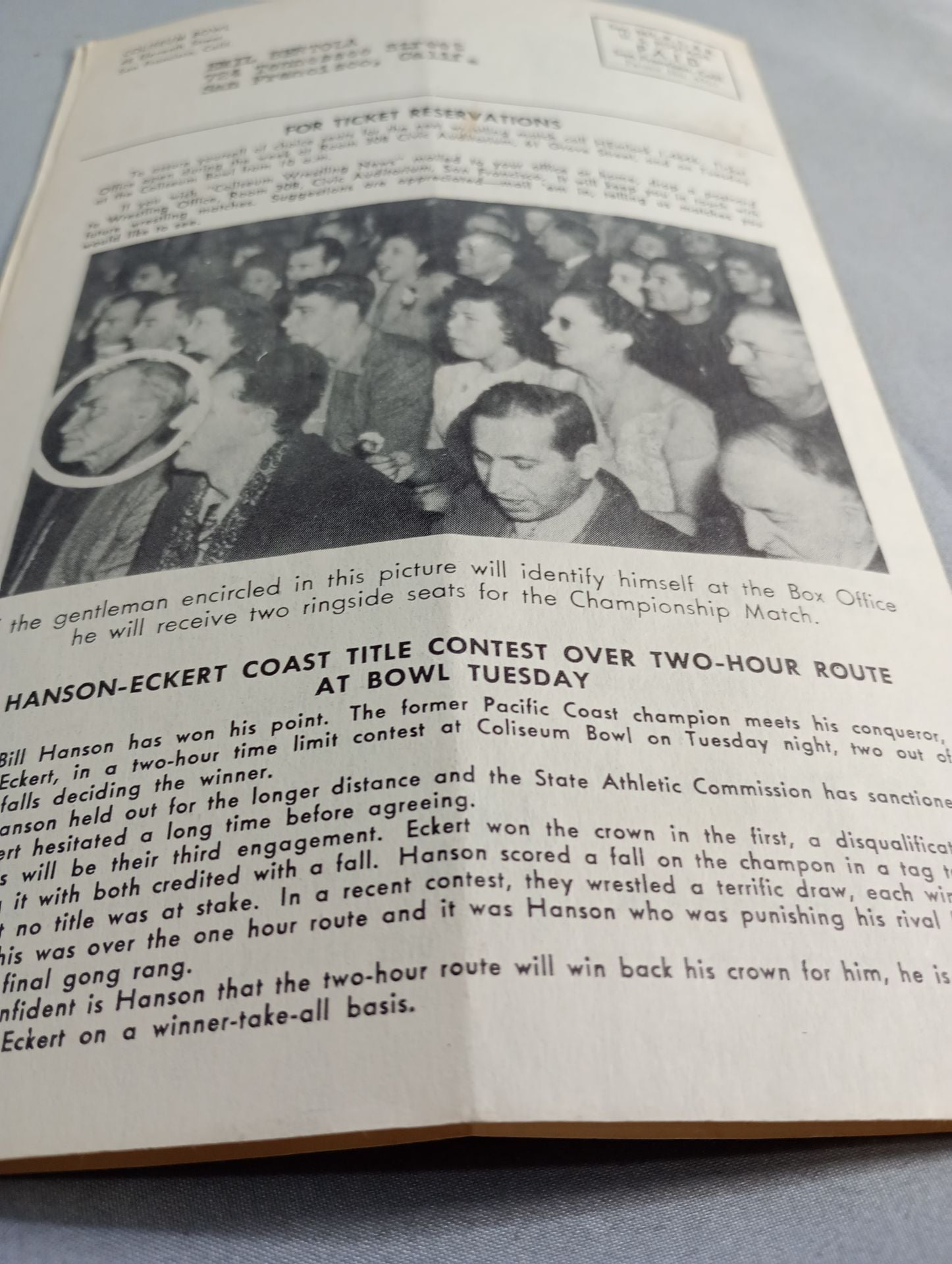 1948年 会場:米 カリフォルニア州サンフランシスコ / 全編英語表記印刷対戦カード:【パシフィックコーストチャンピオンシップ】レイ・エッカートvsビル・ハンソン West Coast