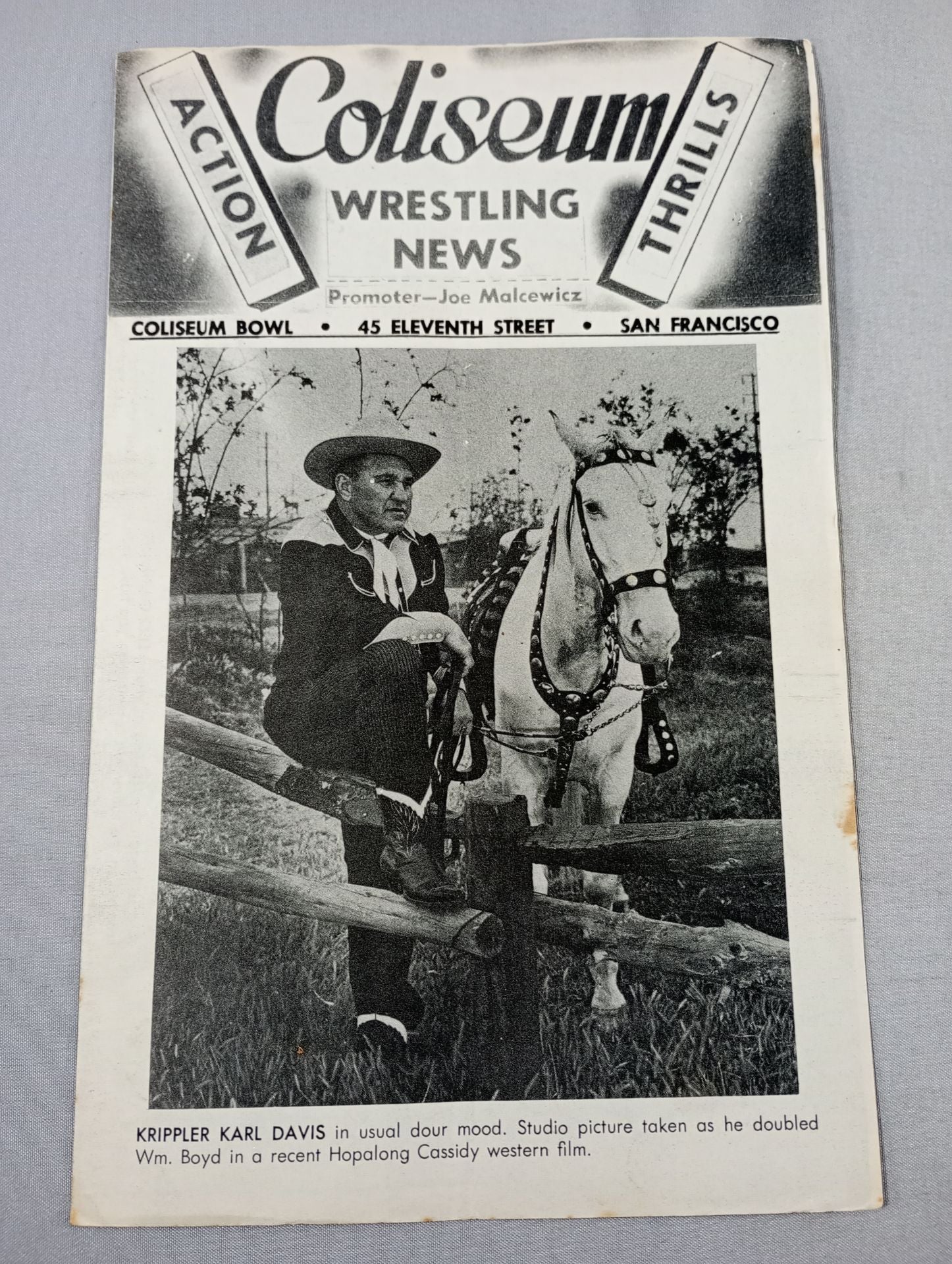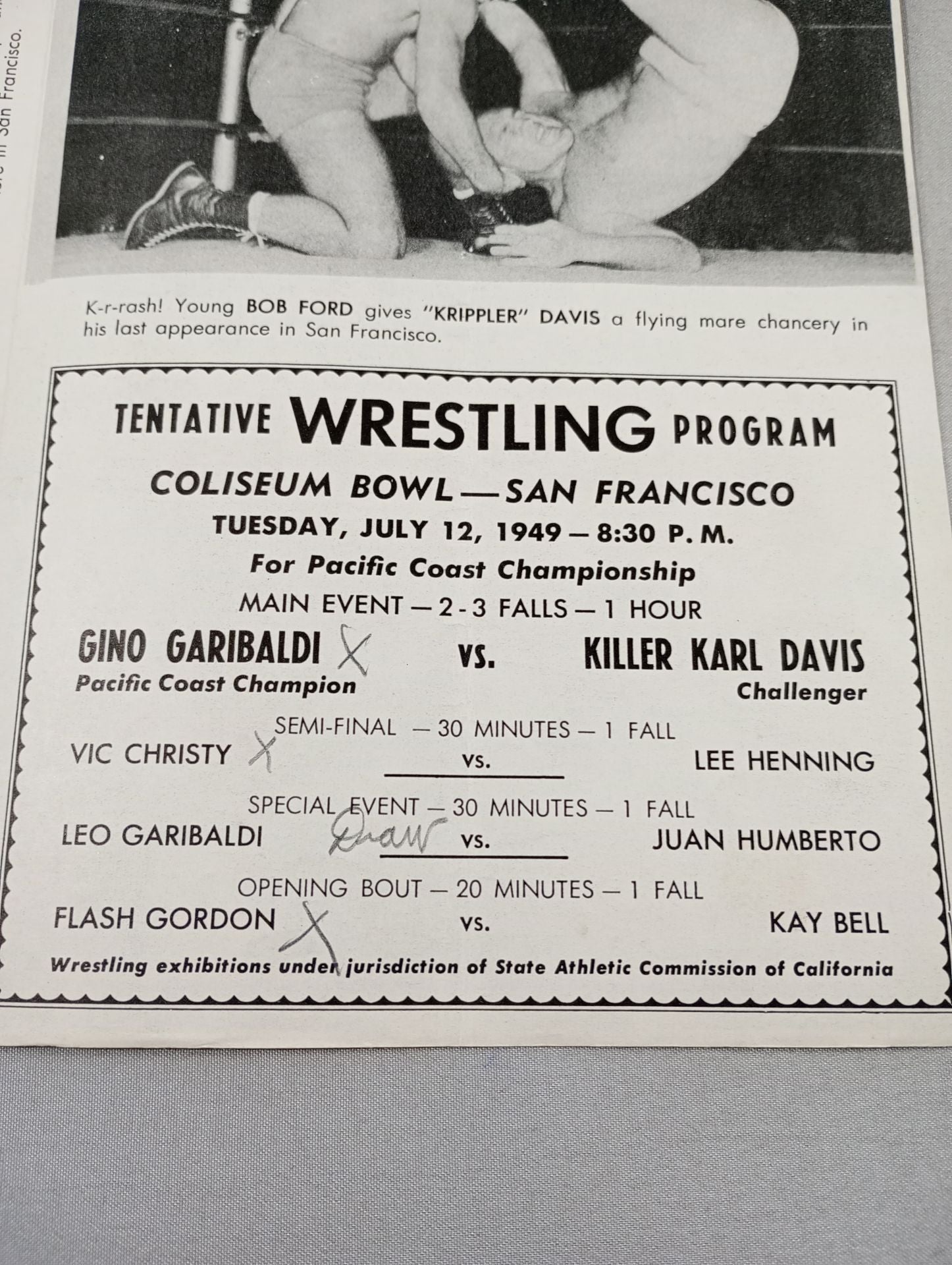 1949年 会場:米 カリフォルニア州サンフランシスコ コロシアム・ボウル / 全編英語表記印刷対戦カード:ジノ・ガリバルディvsキラー・カール・デイビス West Coast