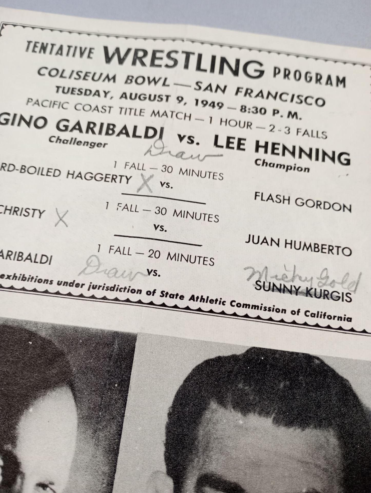 1949年 会場:米 カリフォルニア州サンフランシスコ コロシアム・ボウル / 全編英語表記印刷対戦カード:ジノ・ガリバルディvsリー・ヘニング West Coast