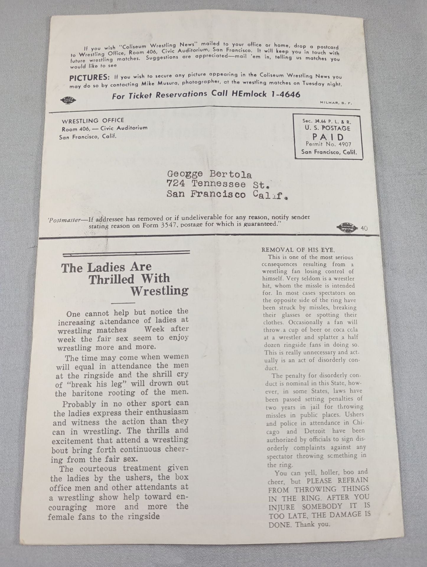 1950年 会場:米 カリフォルニア州サンフランシスコ コロシアム・ボウル / 全編英語表記印刷対戦カード:レイ・エッカートvsジョージ・ペンチェフ West Coast