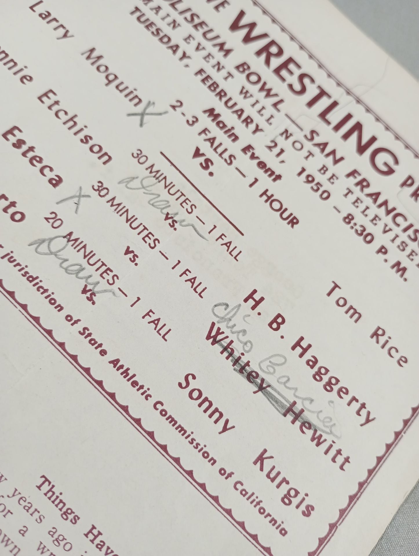 1950年 会場:米 カリフォルニア州サンフランシスコ コロシアム・ボウル / 全編英語表記印刷対戦カード:ラリー・モクインvsタム・ライス West Coast