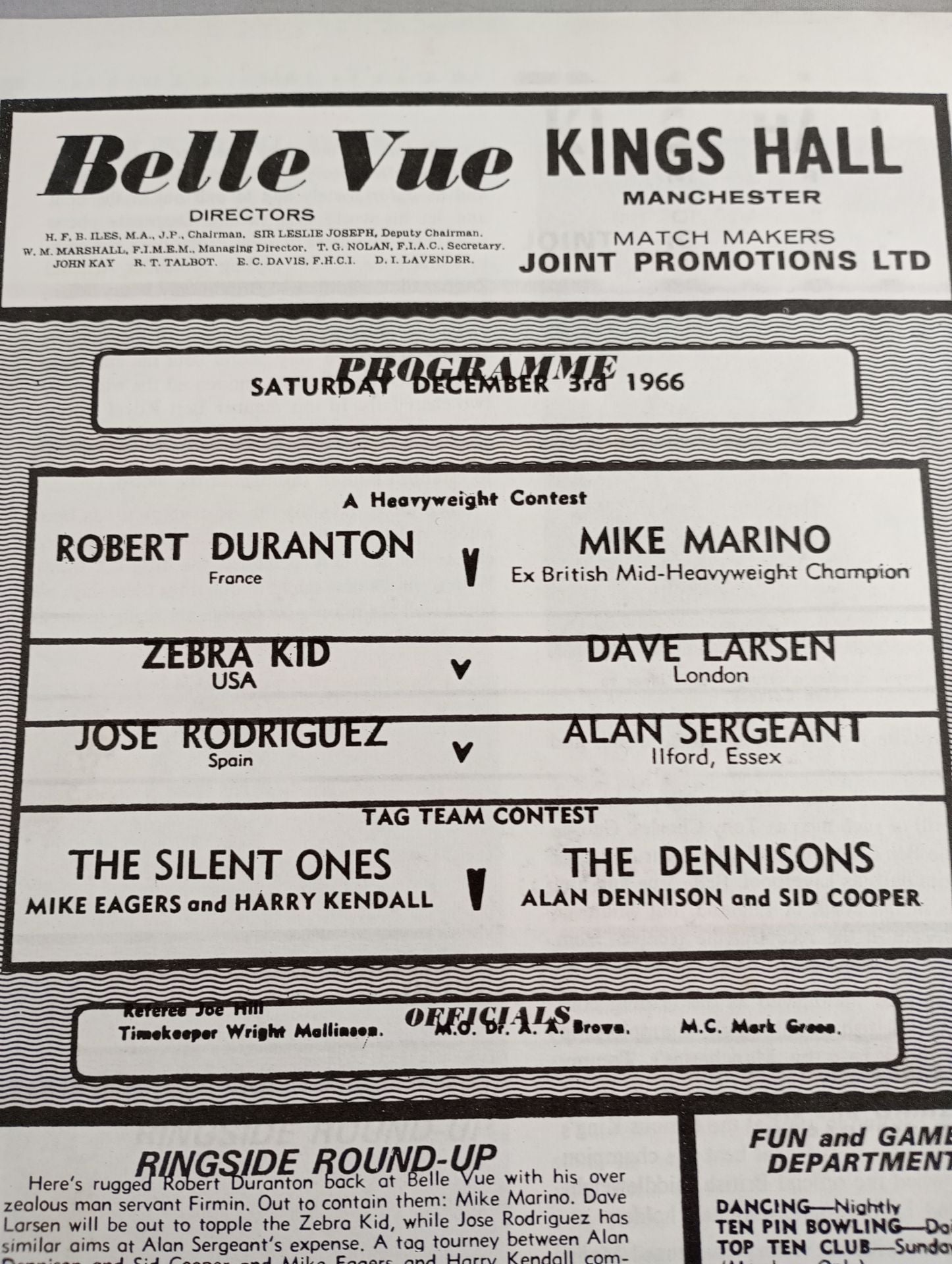 1966年 会場:イギリス マンチェスター キングスホール / 全編英語印刷対戦カード:ロバート・デュラントンvsマイク・マリノ mat
