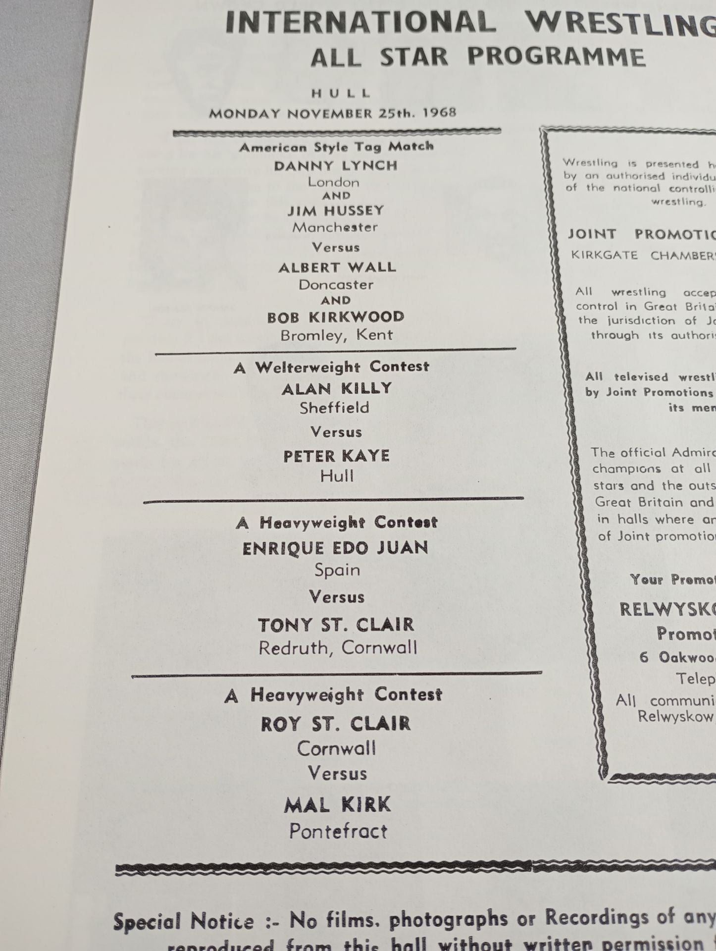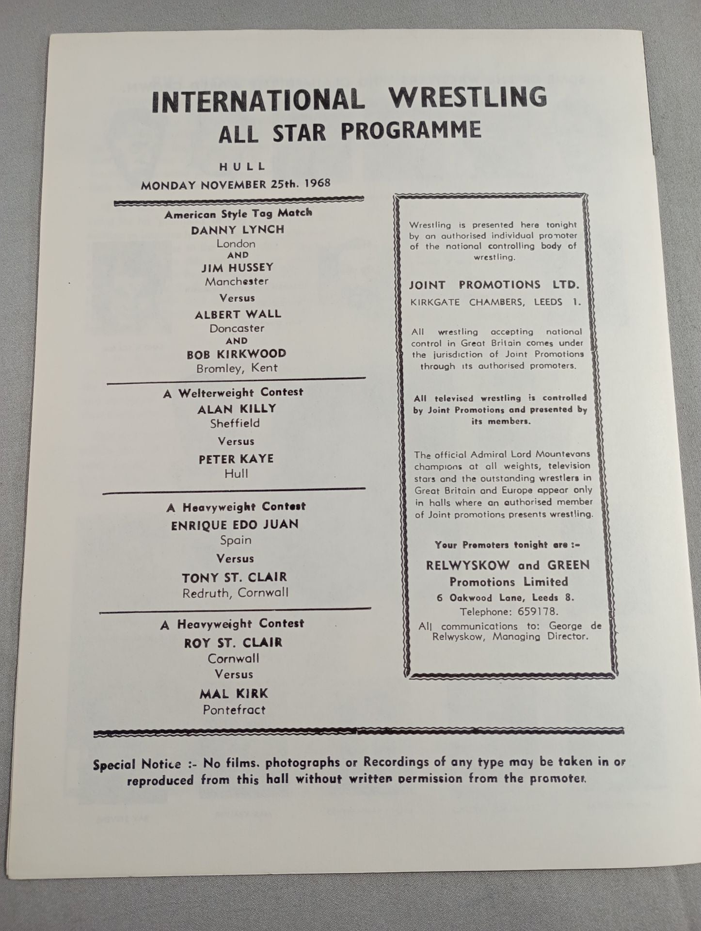 1969年 International ALL Star Wrestling OFFICIAL PROGRAMME / 全編英語印刷対戦カード:ダニー・リンチ&ジム・ハッシーvsアルバート・ウォール&ボブ・カークウッド mat