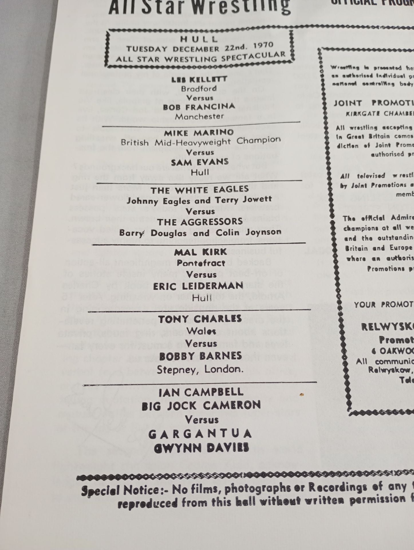 1970年 International ALL Star Wrestling OFFICIAL PROGRAMME / 全編英語表記印刷対戦カード:マイク・マリノvsサム・エヴァンス mat
