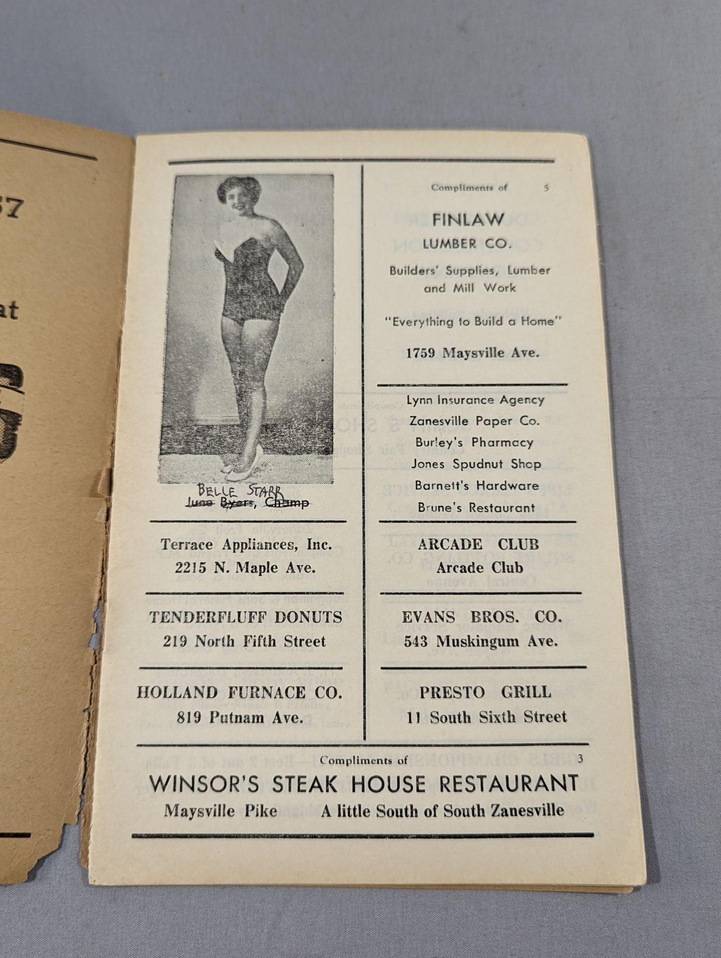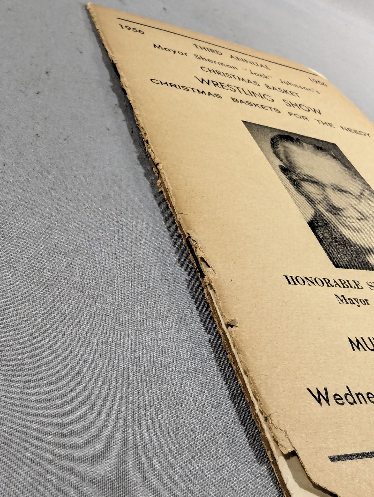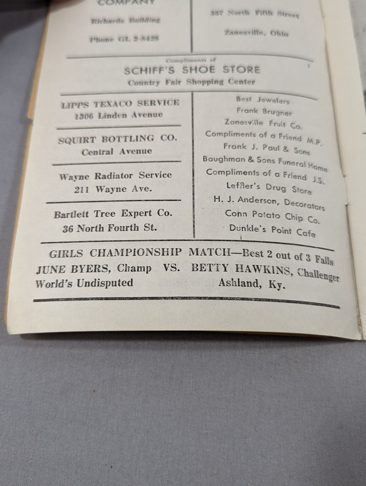 1956年 前編英語表記:会場:米 オハイオ州ゼーンズビル ムニシパルオーディトリアム(市公会堂)印刷対戦カード:【女子王座選手権試合】ジューン・バイアーズvsベティ・ホーキンズ シャーマン ”ジャック ”ジョンソン市長のクリスマス・バスケットレスリング・ショー