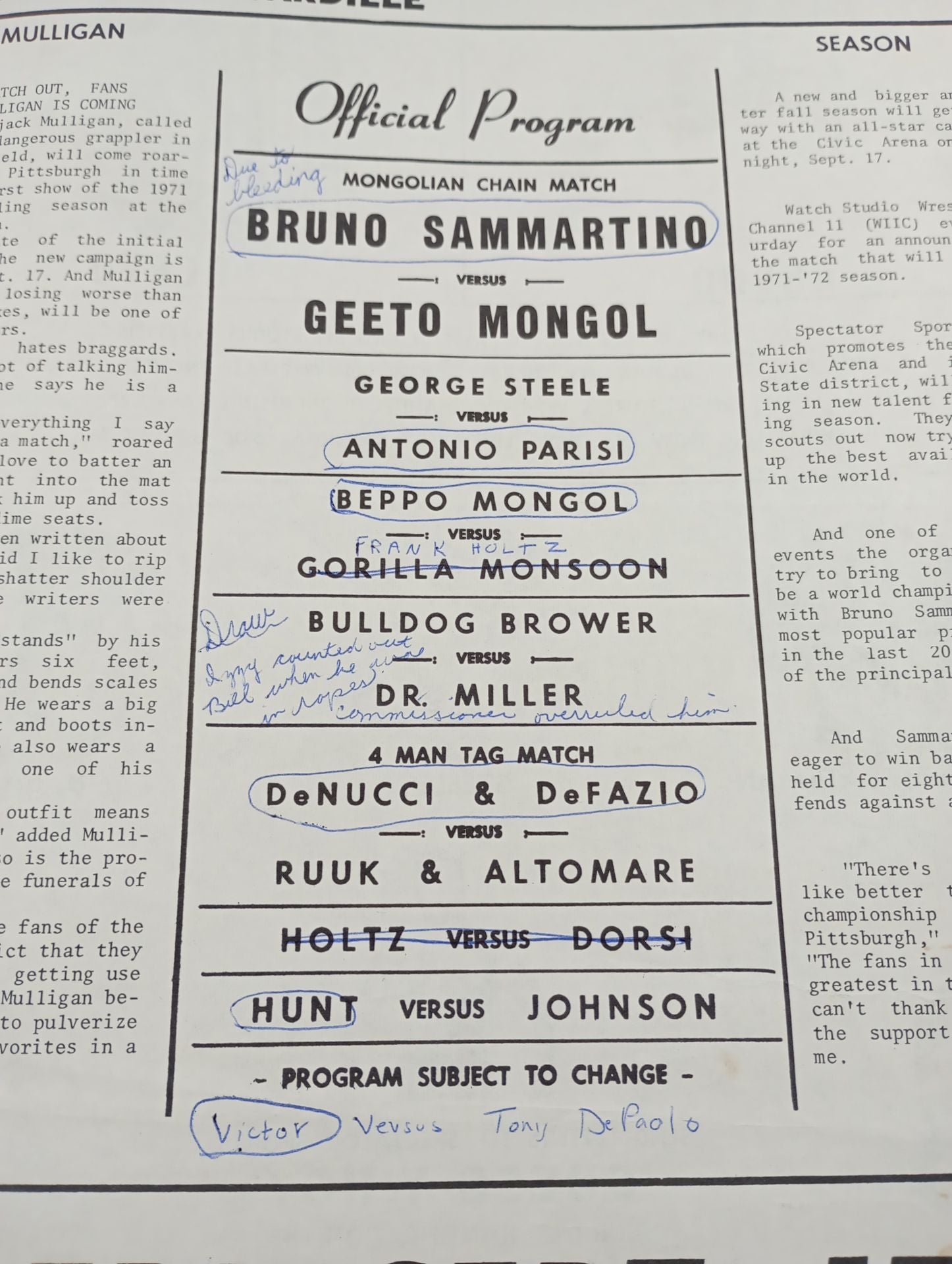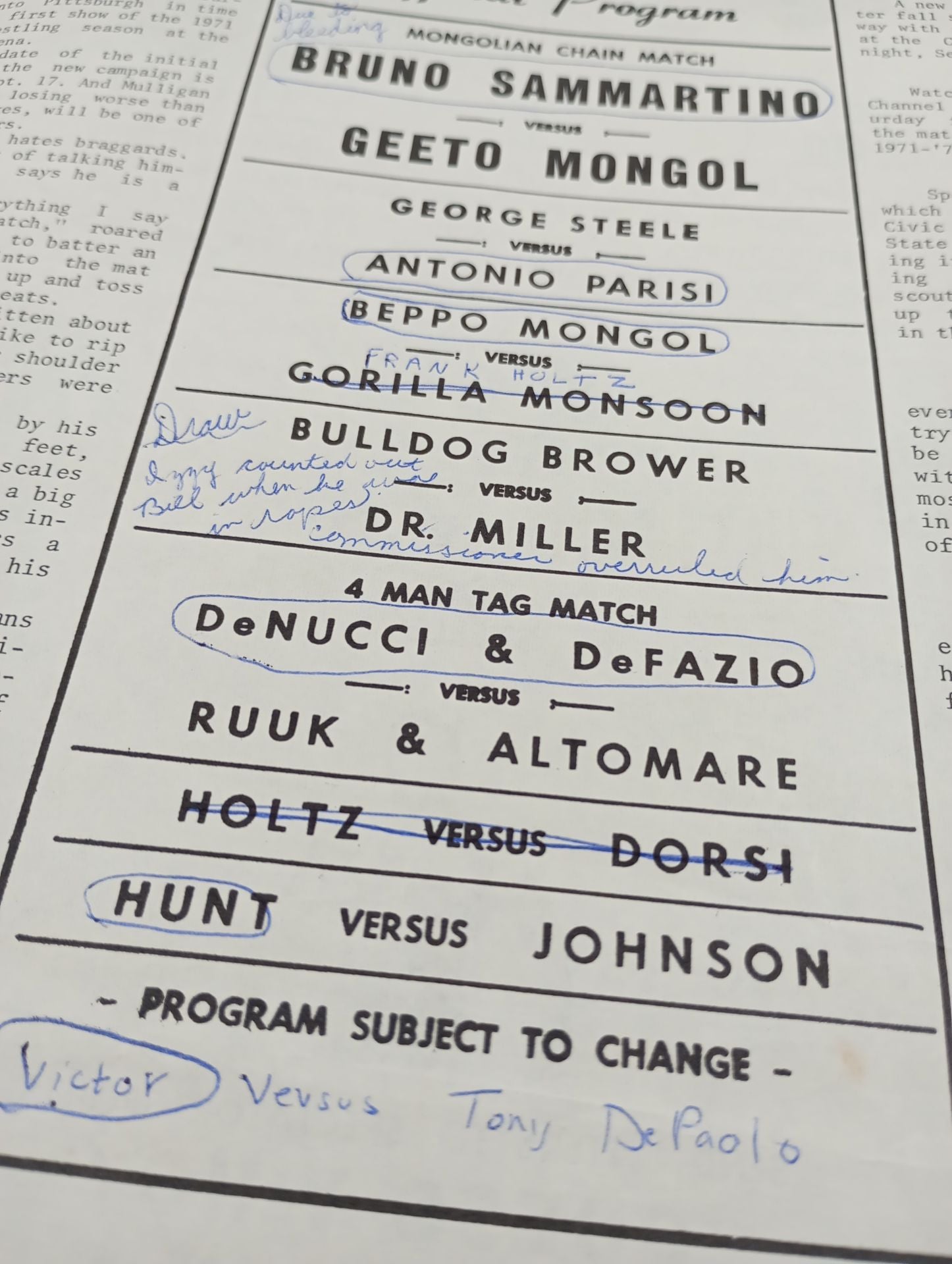 1971年 会場:米 ペンシルベニア州ピッツバーグ シビックアリーナ / 全編英語表記印刷対戦カード:【モンゴリアン・チェーン・デスマッチ】ブルーノ・サンマルチノvsジート・モンゴル