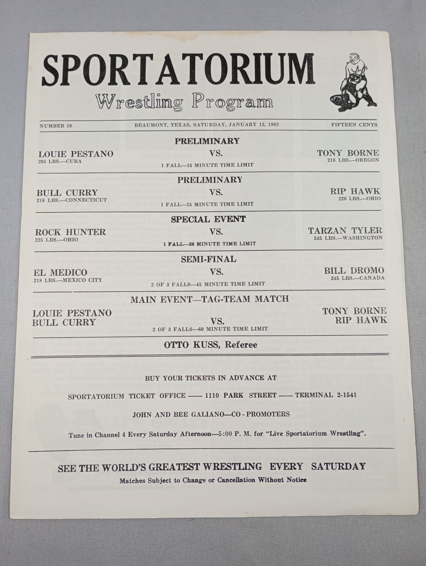 1963年 会場:米 テキサス州ボーモント / 全編英語表記印刷対戦カード:ルーイ・ペスタノ&ブル・カリーvsトニー・ボーン&リップ・ホーク